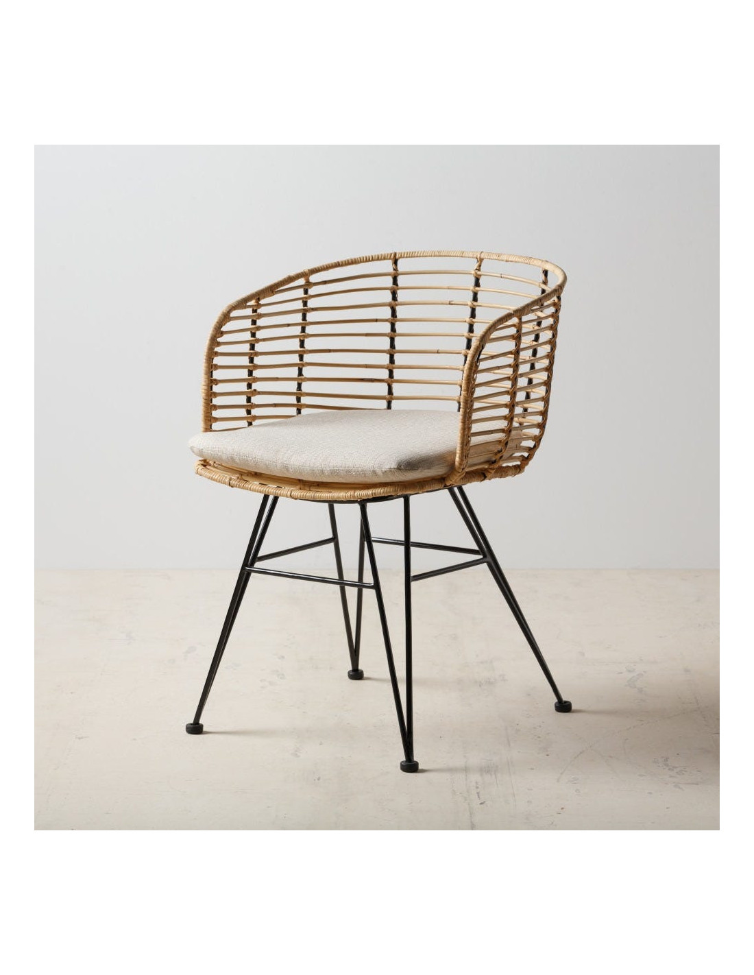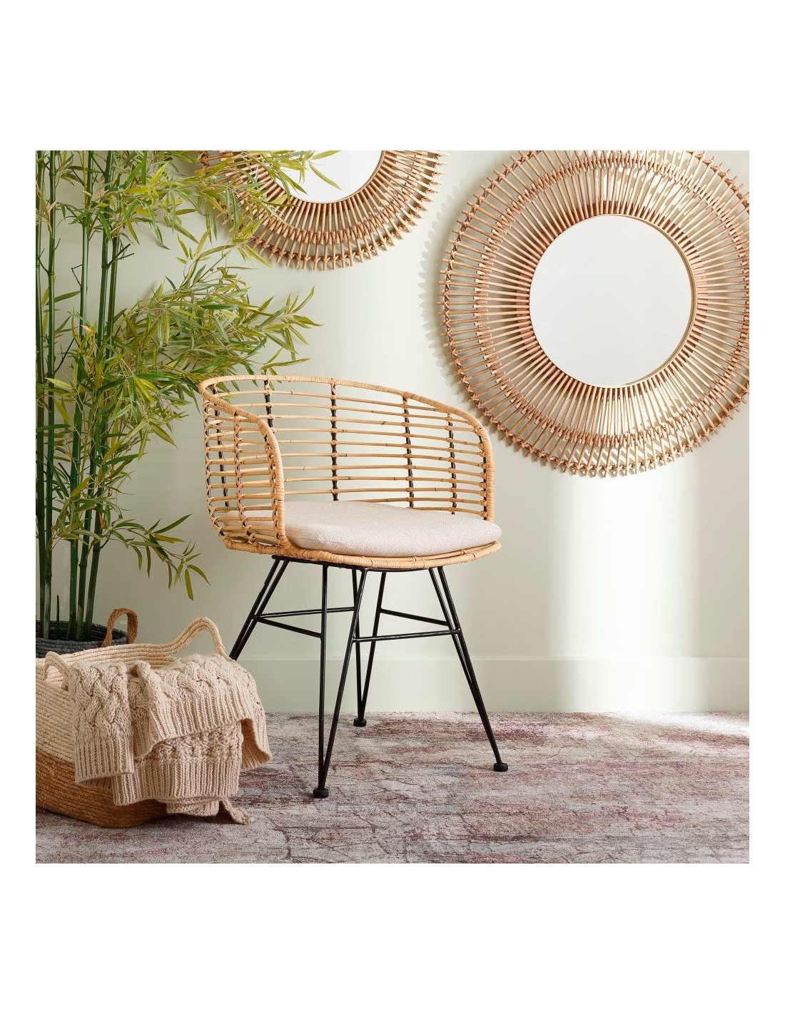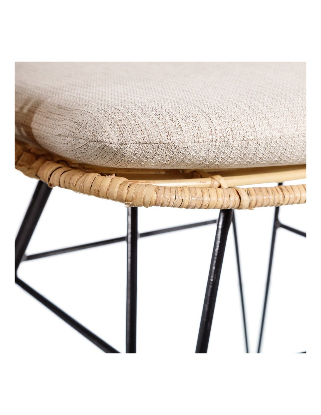 Les fibres naturelles tressées offrent un toucher vivant et une teinte légèrement dorée qui capte la lumière. Le piètement en métal noir garantit solidité et stabilité. Le tissu beige tempère le tout et s’accorde à des univers clairs comme à des décors plus contrastés. Ces matériaux se complètent dans une palette sobre et harmonieuse, fidèle aux intérieurs bohèmes contemporains.