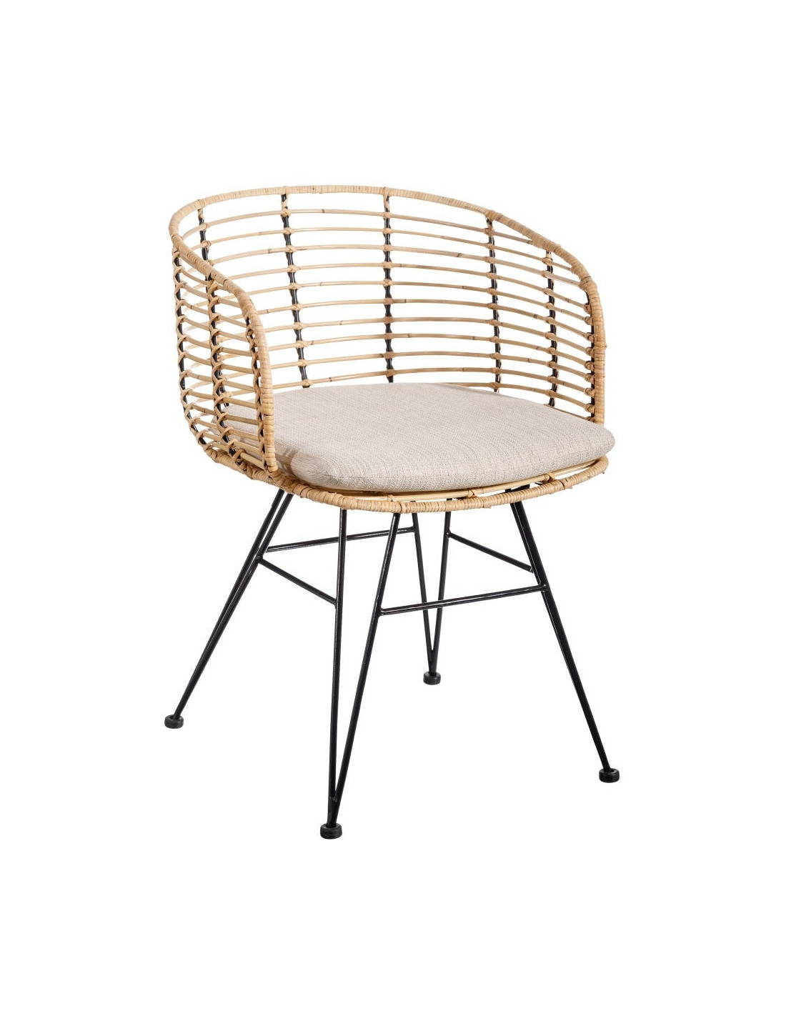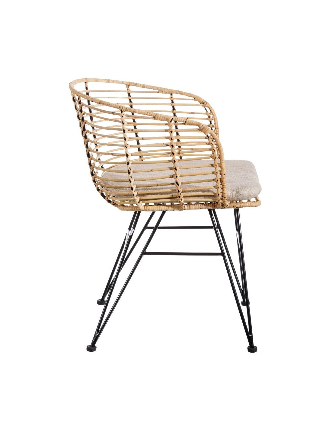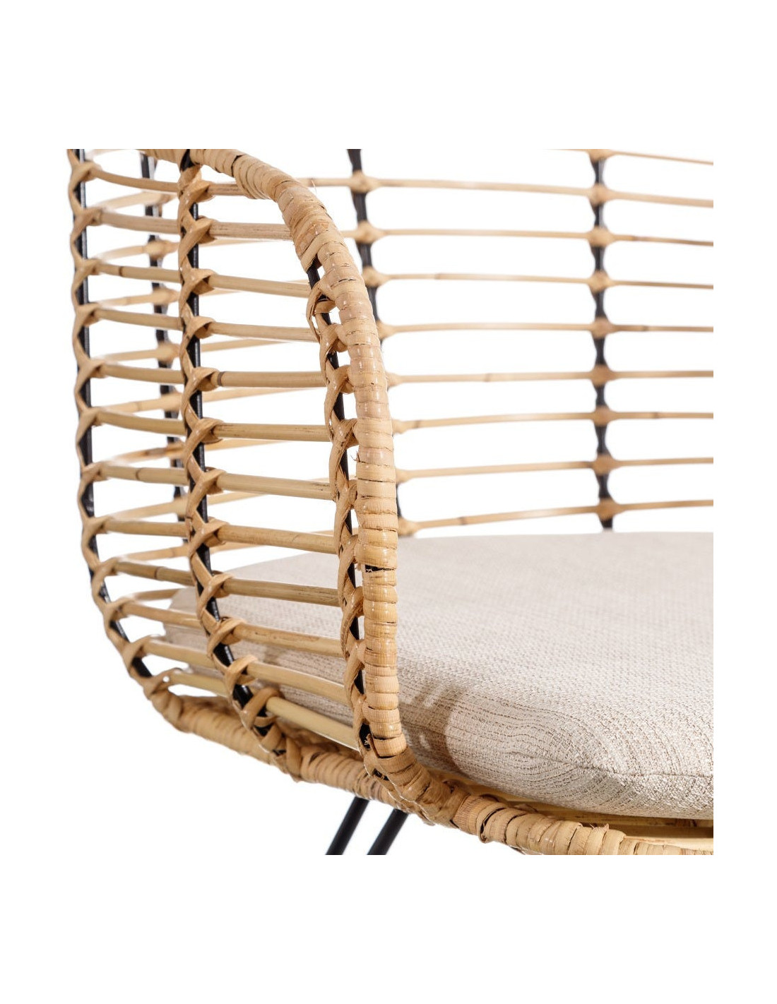 Les fibres naturelles tressées offrent un toucher vivant et une teinte légèrement dorée qui capte la lumière. Le piètement en métal noir garantit solidité et stabilité. Le tissu beige tempère le tout et s’accorde à des univers clairs comme à des décors plus contrastés. Ces matériaux se complètent dans une palette sobre et harmonieuse, fidèle aux intérieurs bohèmes contemporains.