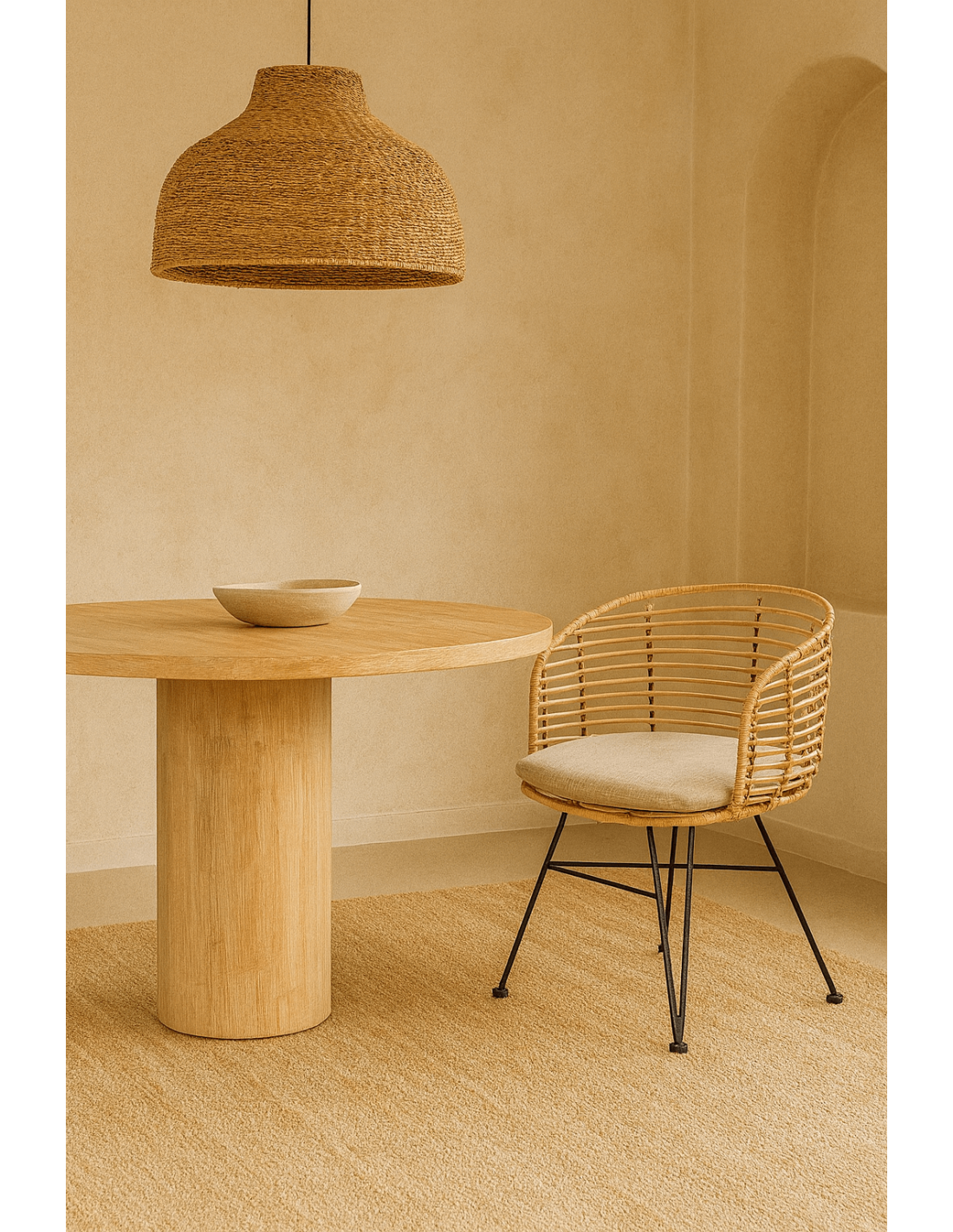 Finira se marie à merveille avec une table en bois clair, une suspension tressée ou un tapis en jute. Il se fond aussi dans un décor plus graphique avec du marbre, du métal ou du verre. Dans un salon, il devient fauteuil d’appoint ; dans une salle à manger, il compose un ensemble apaisant et lumineux. Son allure intemporelle lui permet de s’adapter à des styles variés — bohème chic, scandinave, naturel ou wabi-sabi.