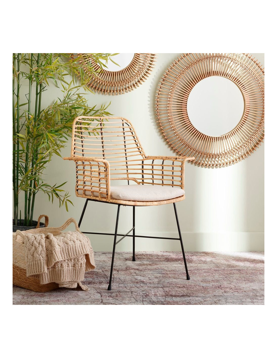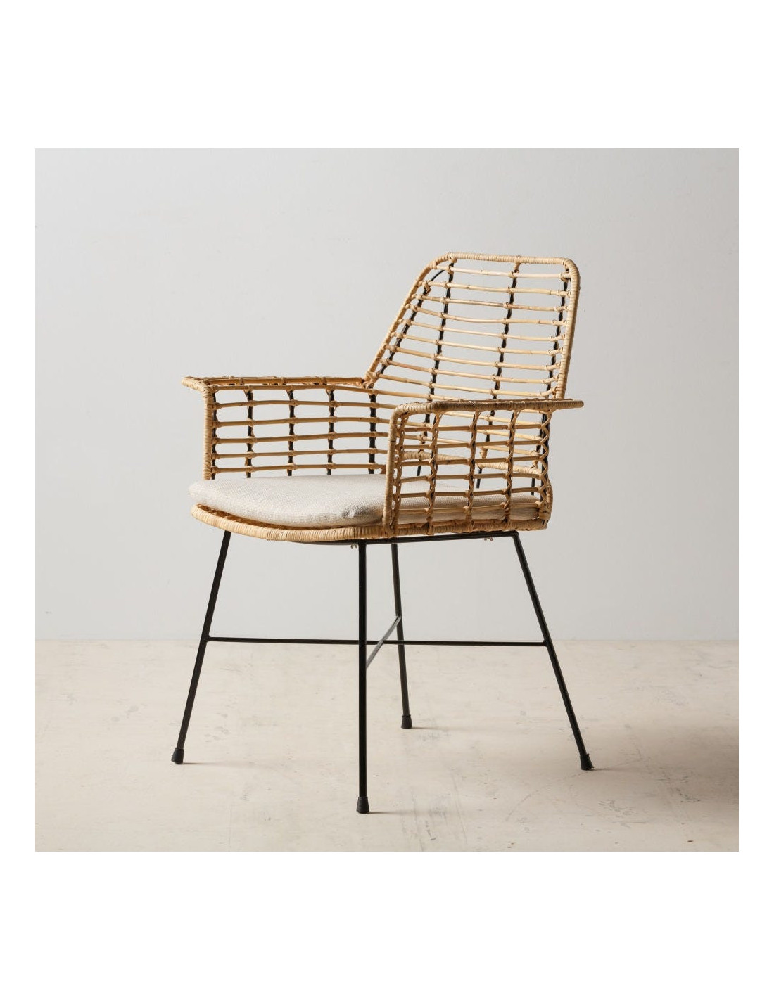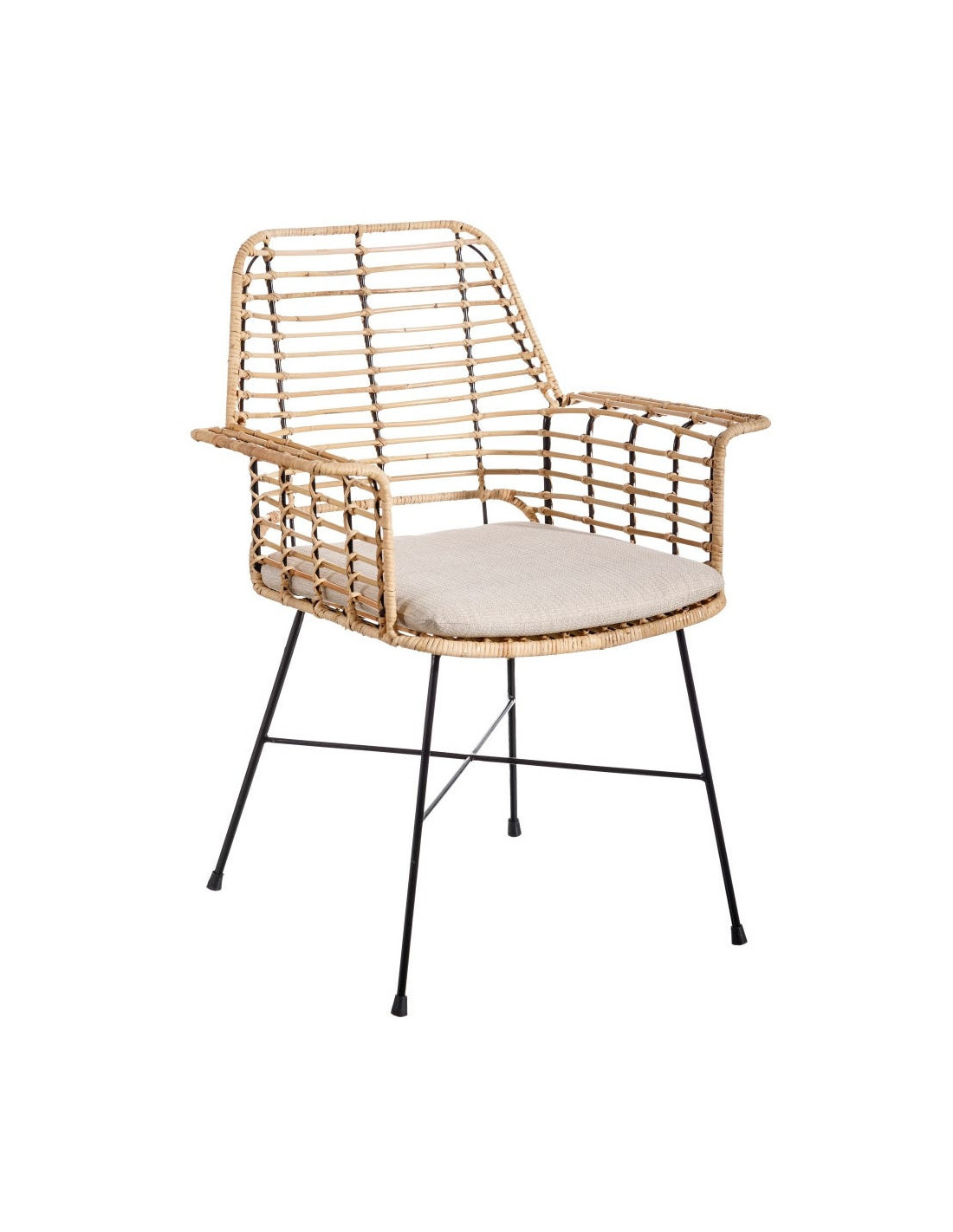 Le fauteuil Galira associe la poésie des fibres naturelles à la rigueur d’un piètement en métal noir. Son assise habillée d’un tissu beige apporte douceur et confort, tandis que le tressage laisse filtrer la lumière et crée un jeu d’ombres subtil. Le résultat est aéré, chaleureux, immédiatement accueillant autour de la table.