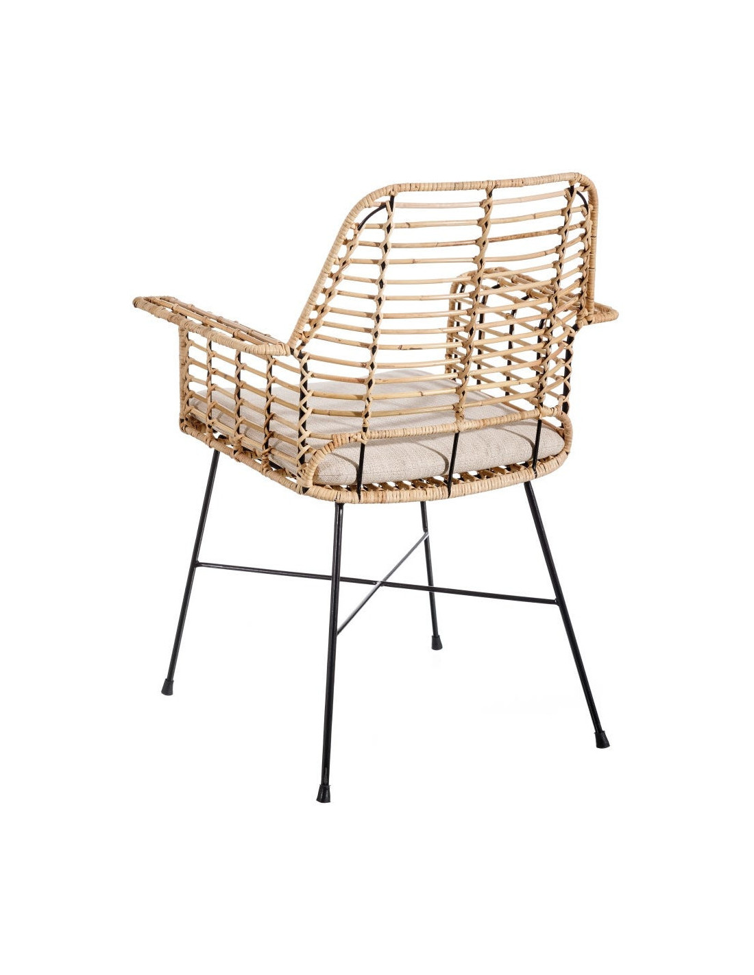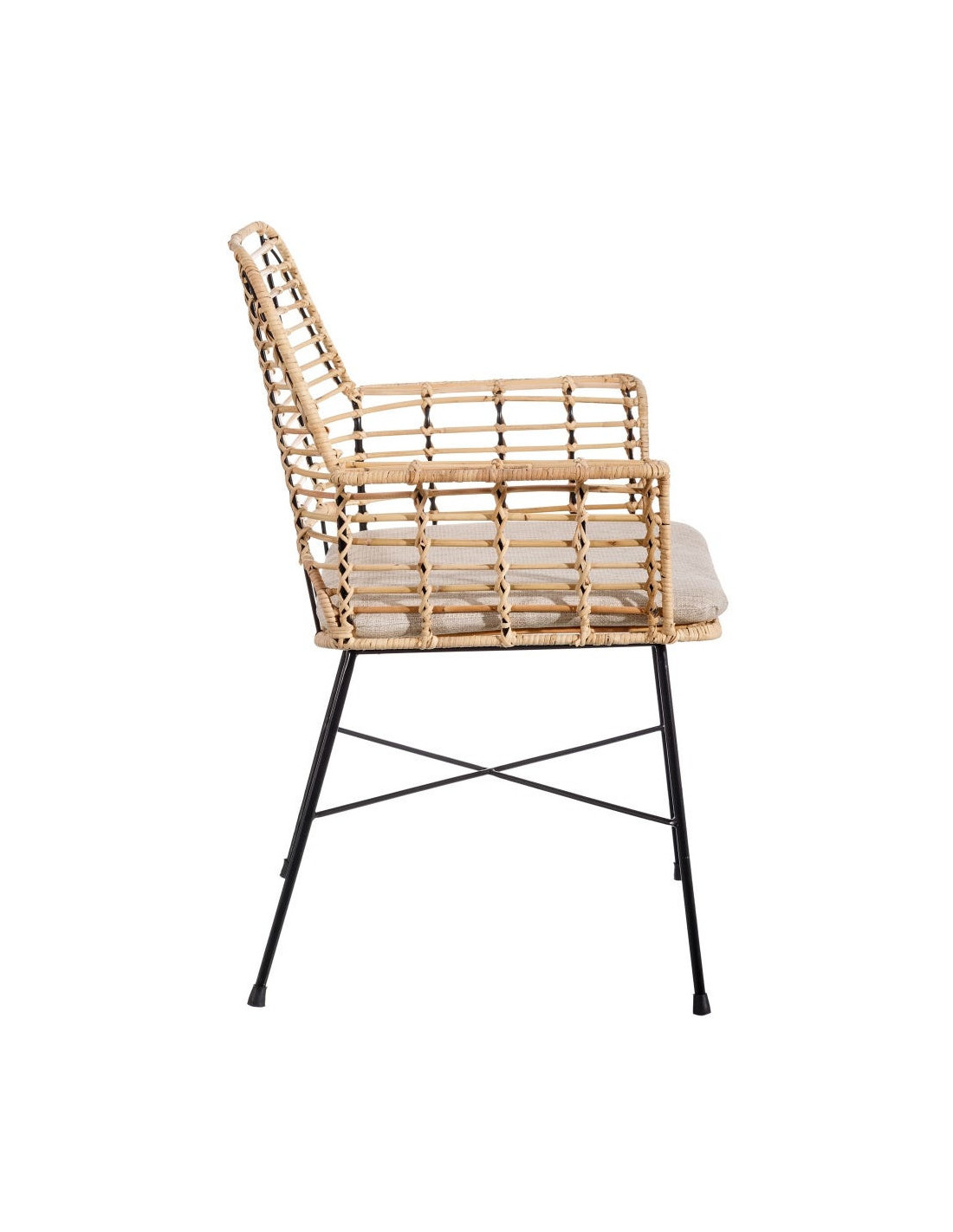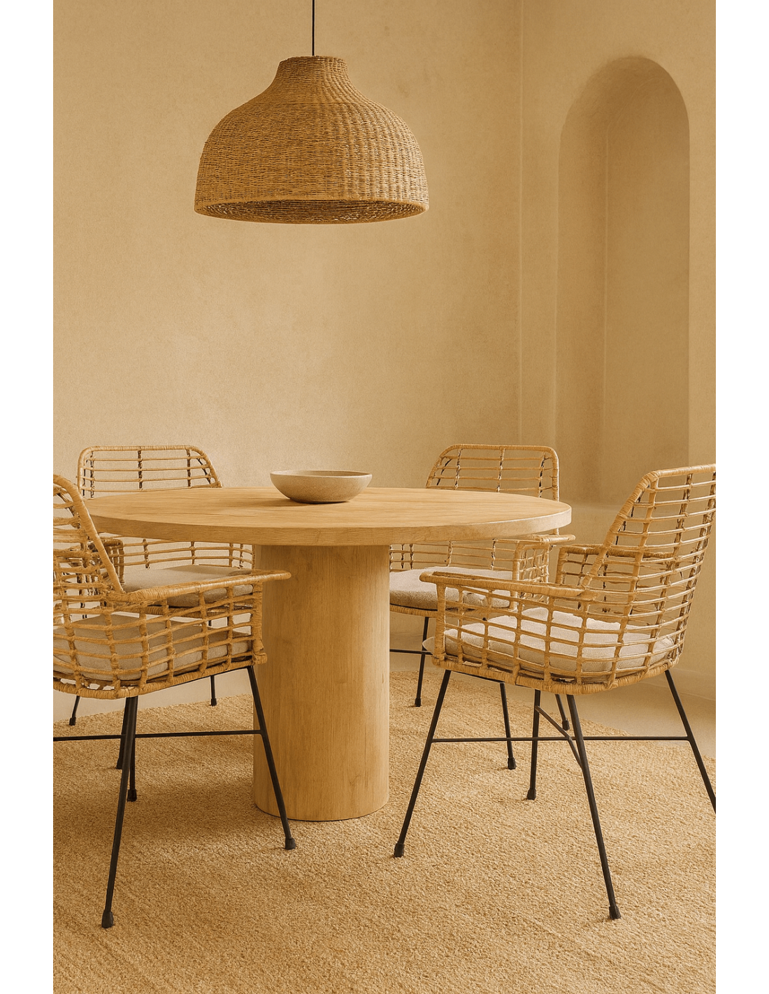 Galira privilégie une assise confortable et une posture détendue. Le coussin en tissu beige tempère la matière tressée et adoucit la durée à table. Le dossier enveloppe sans contraindre. Les accoudoirs s’alignent naturellement avec le plateau, favorisant les mouvements et la conversation.