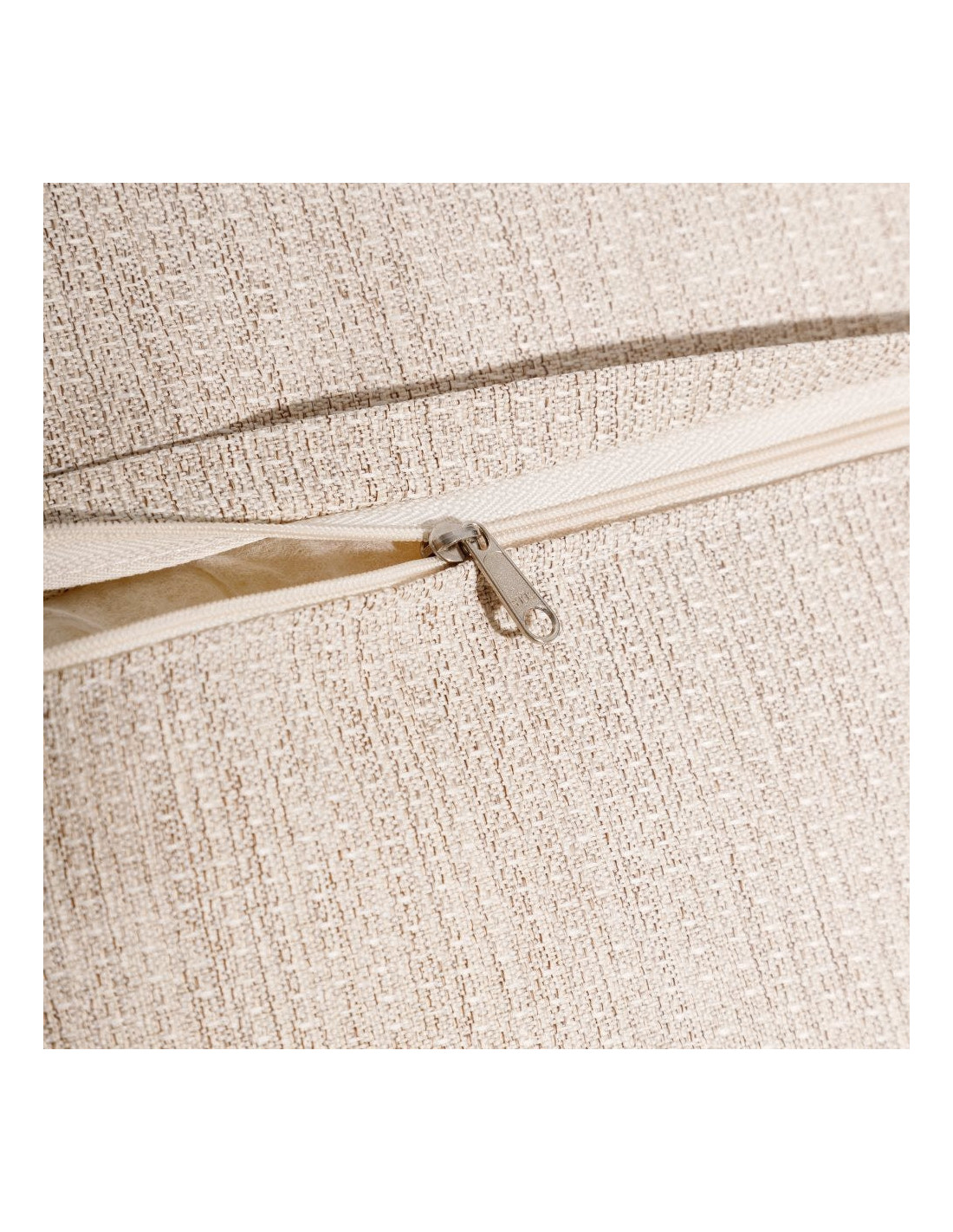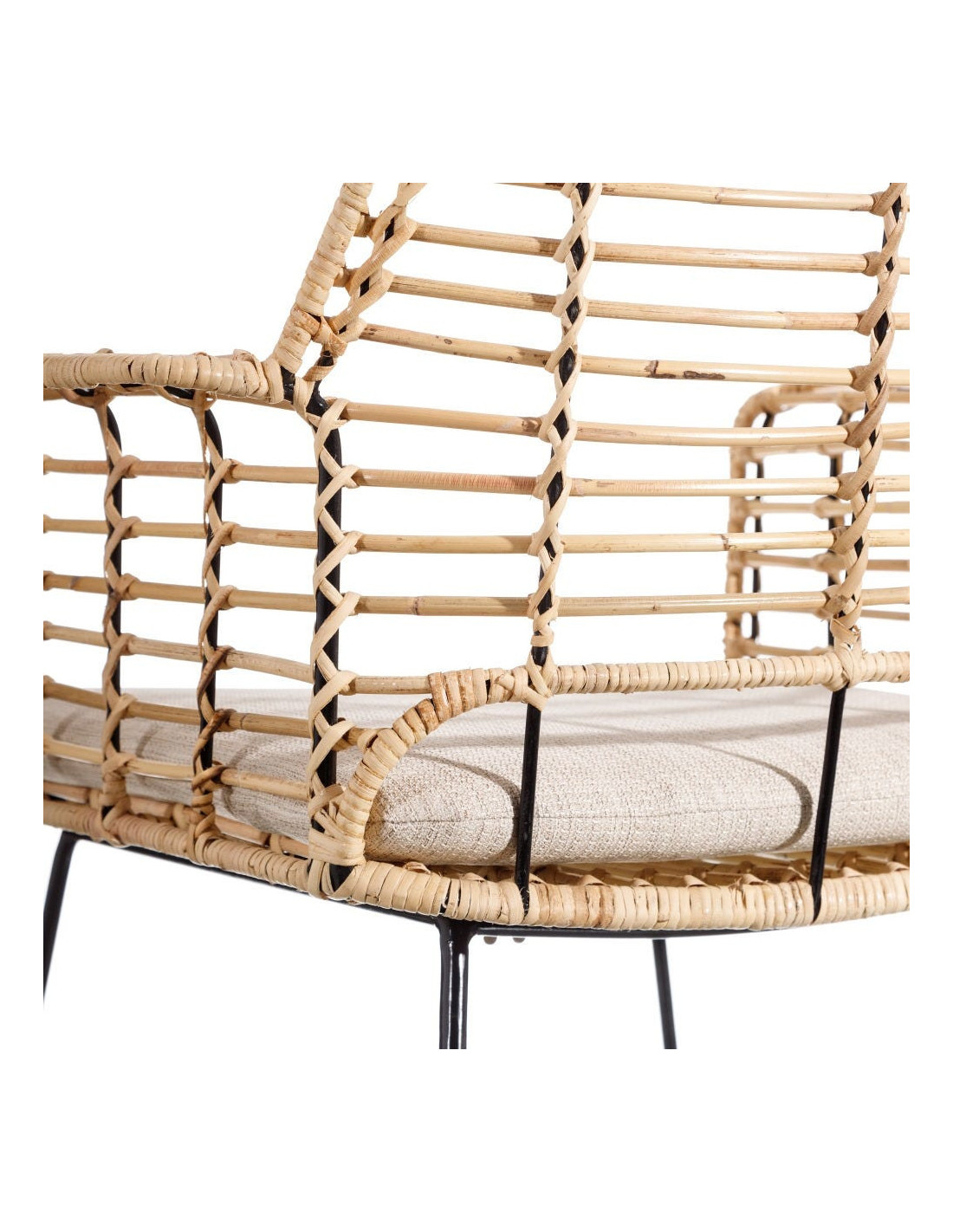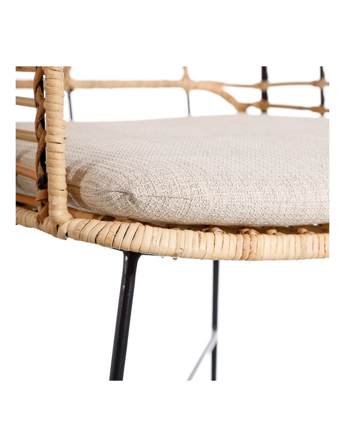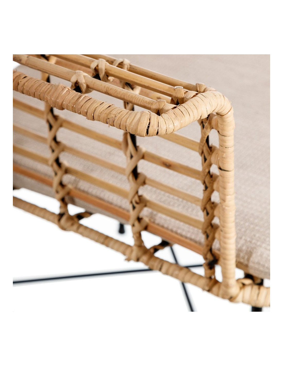 La fibre naturelle tressée offre une texture vivante, agréable au regard comme au toucher. Le métal noir structure la pièce et assure une bonne stabilité. Le tissu beige équilibre la palette et s’accorde aux bois clairs comme aux marbres foncés. Entretien simple : dépoussiérage doux pour la fibre, chiffon légèrement humide pour le métal, entretien courant pour le coussin selon les recommandations de la fiche.