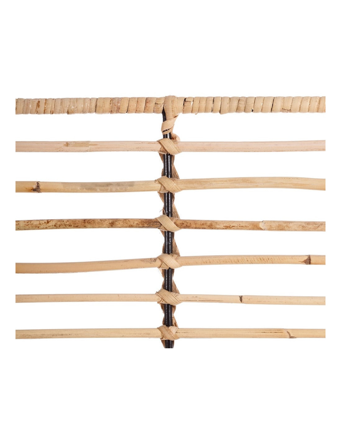 La ligne est nette et légère. Le métal noir dessine un cadre graphique qui stabilise la silhouette sans l’alourdir. Le rotin/raphia tressé (selon déclinaison) révèle un travail manuel visible dans le rythme régulier des mailles. L’ensemble parle d’authenticité, de matières vraies et d’une élégance simple qui dure.