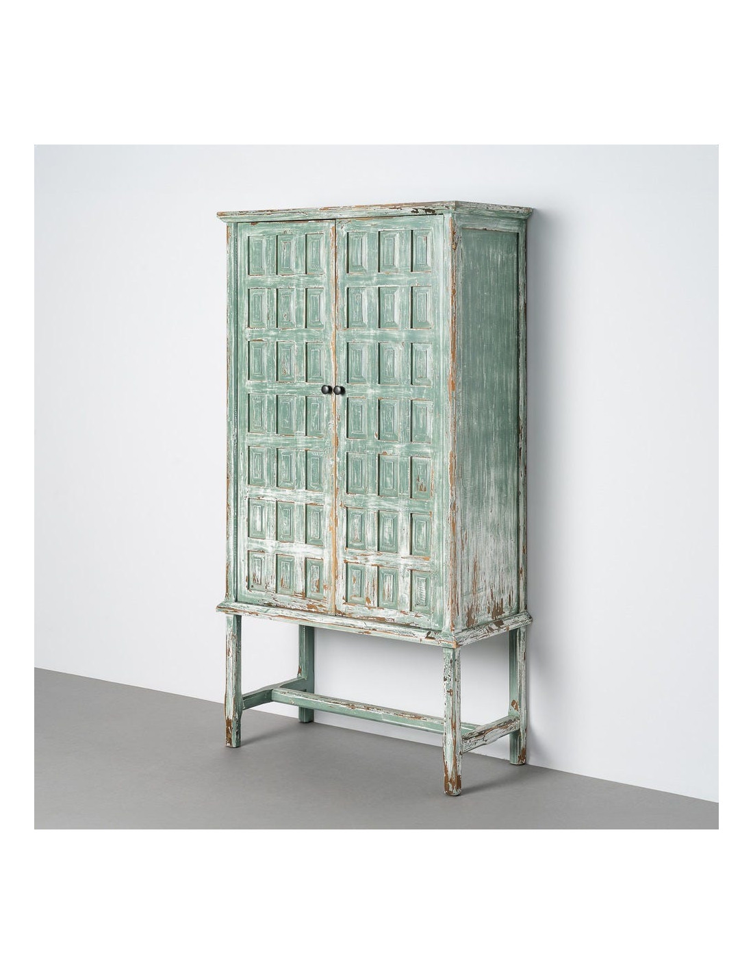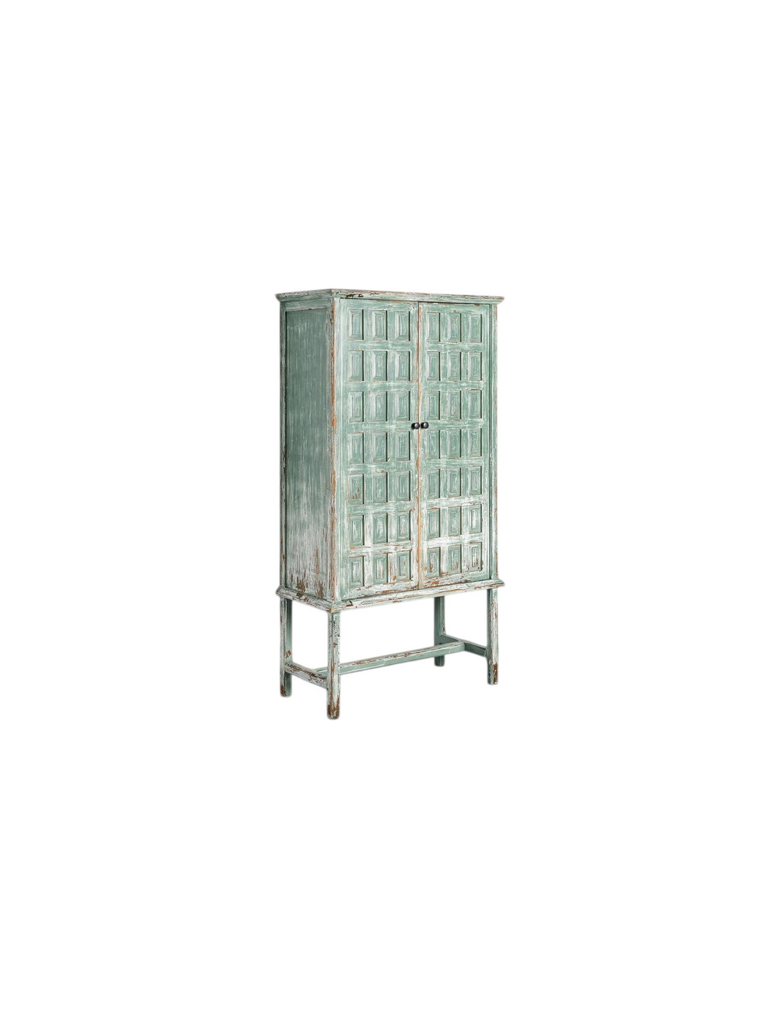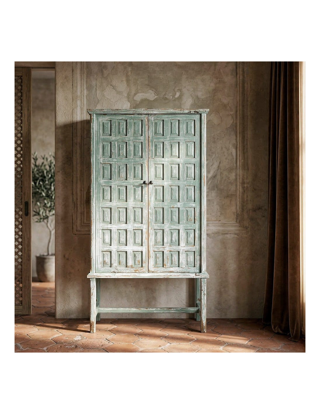 Ce buffet bohème ethnique ne se contente pas d'occuper un mur. Il change l'allure de la pièce. Sa structure élancée, sa teinte verte patinée et le dessin régulier de ses façades créent un ensemble à la fois décoratif et singulier. Sur les photos, la finition laisse apparaître un rendu nuancé qui donne au meuble plus de profondeur qu'un simple buffet uni.