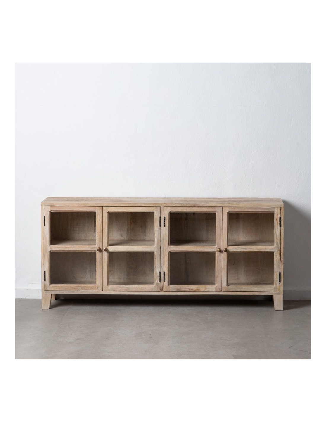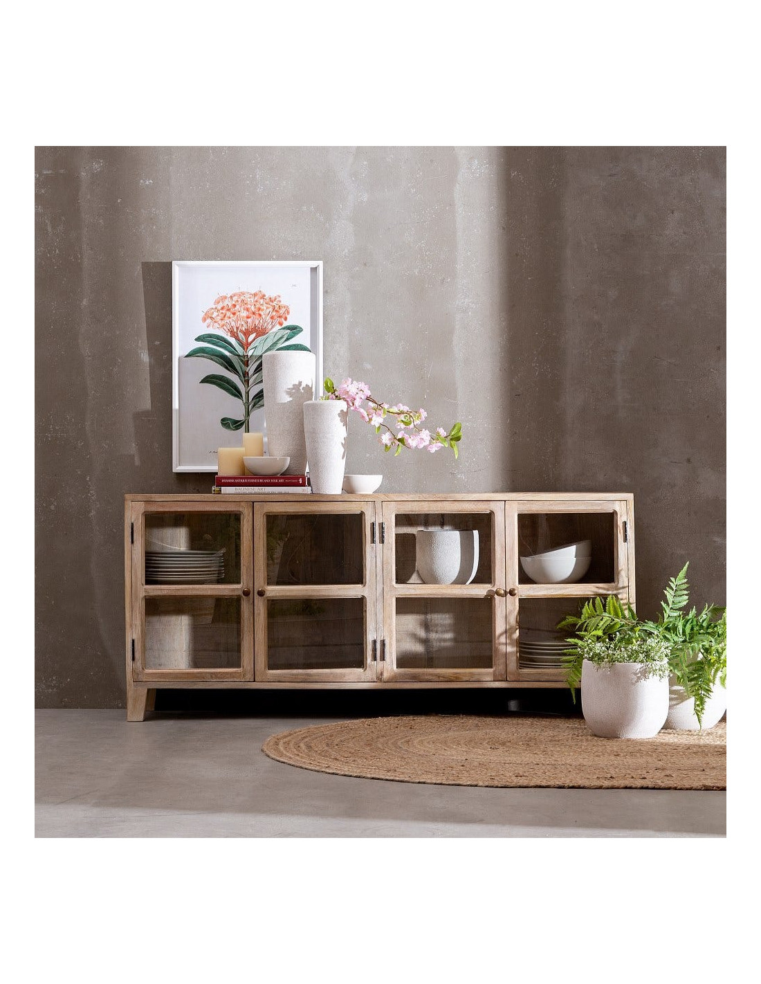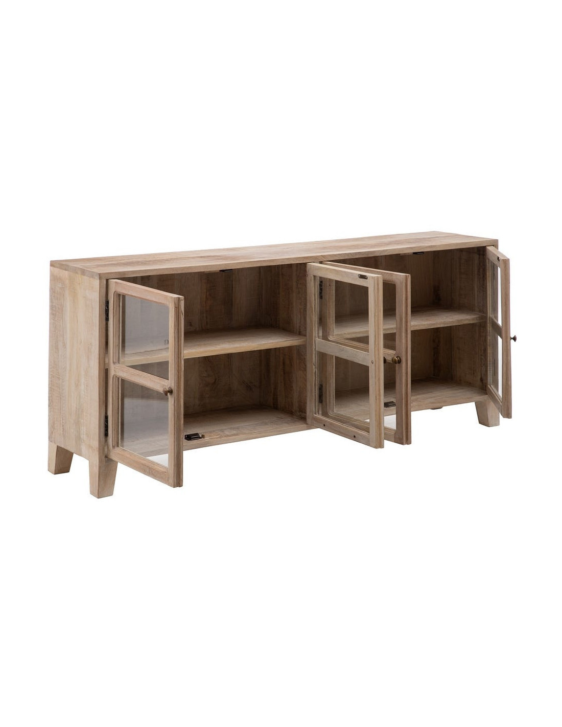 Grand Buffet Enfilade moderne Bas 4 portes en Bois de manguier Naturel Blanchi Verre Transparent Saimon - 1