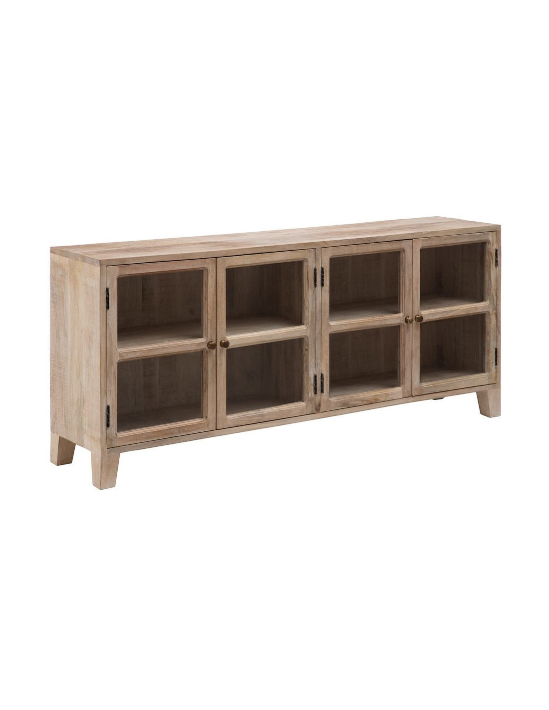 Grand Buffet Enfilade moderne Bas 4 portes en Bois de manguier Naturel Blanchi Verre Transparent Saimon