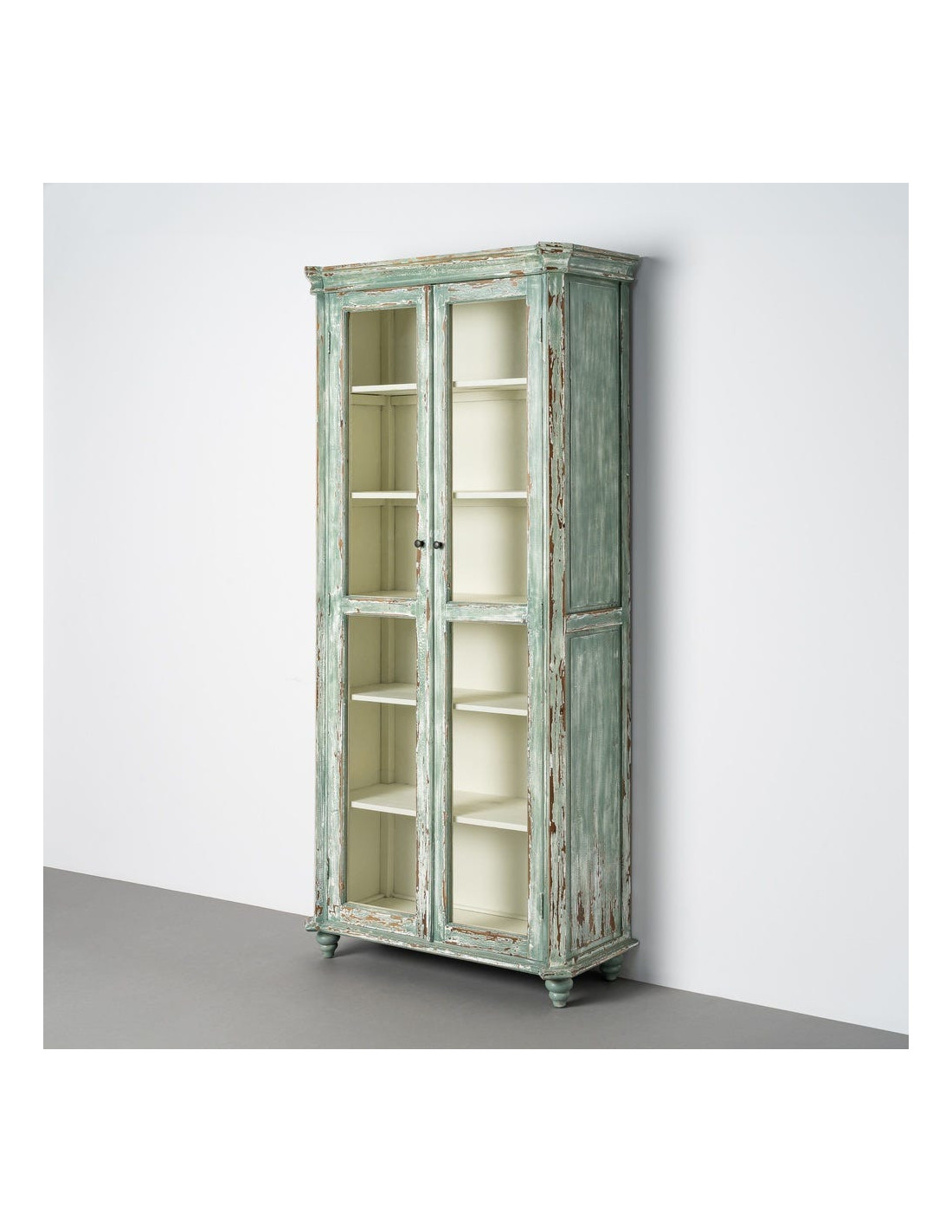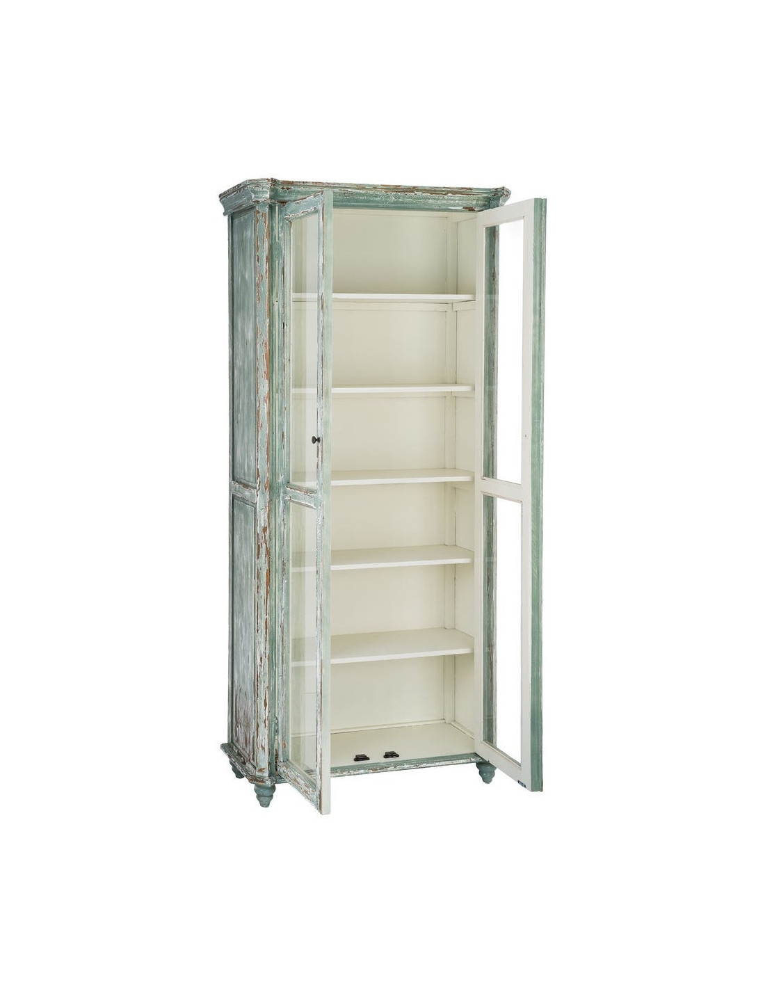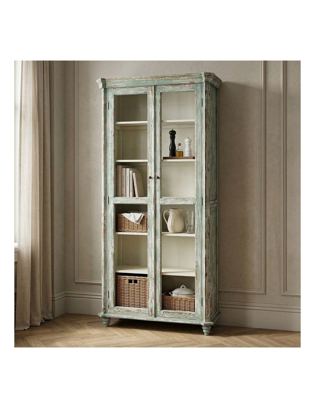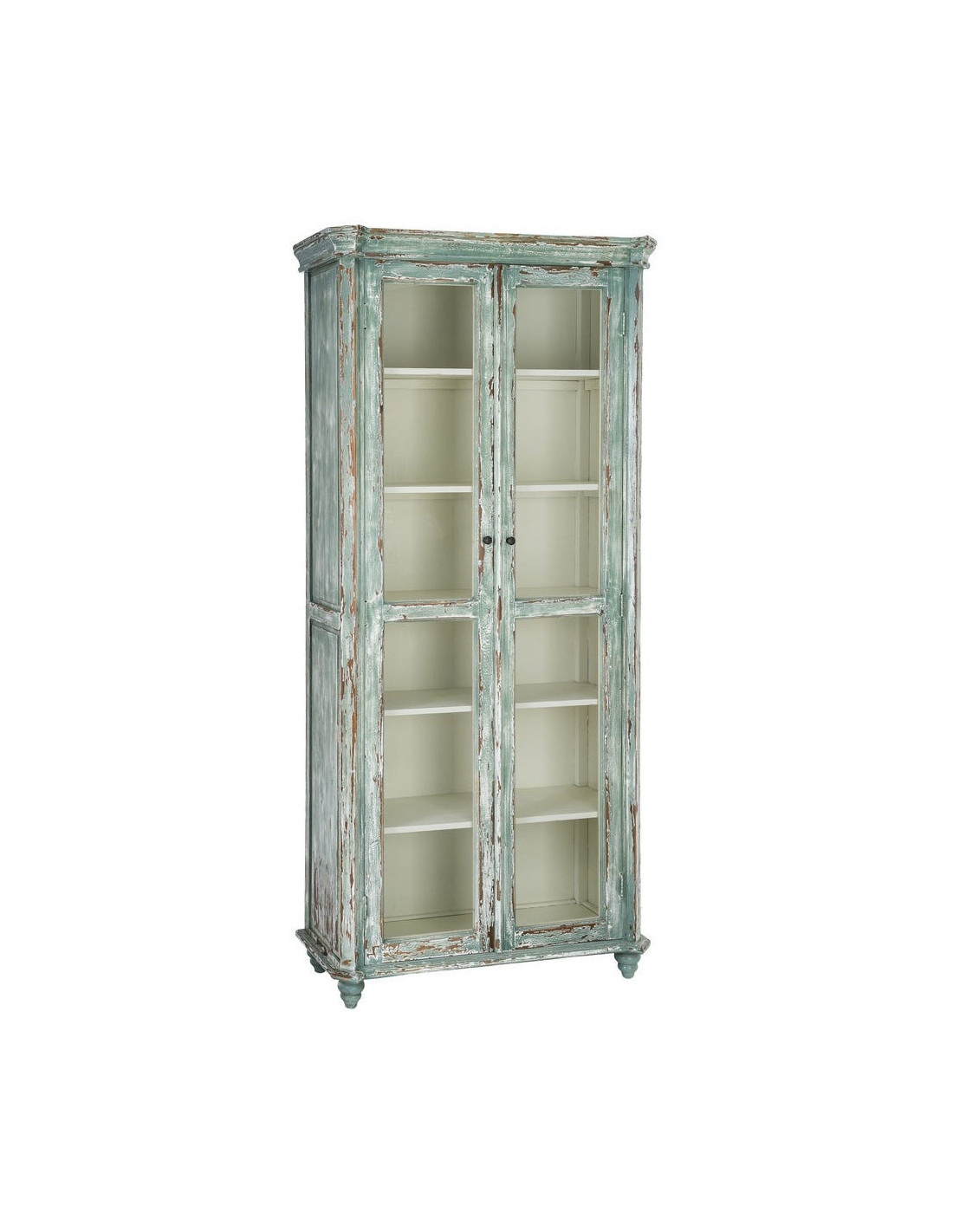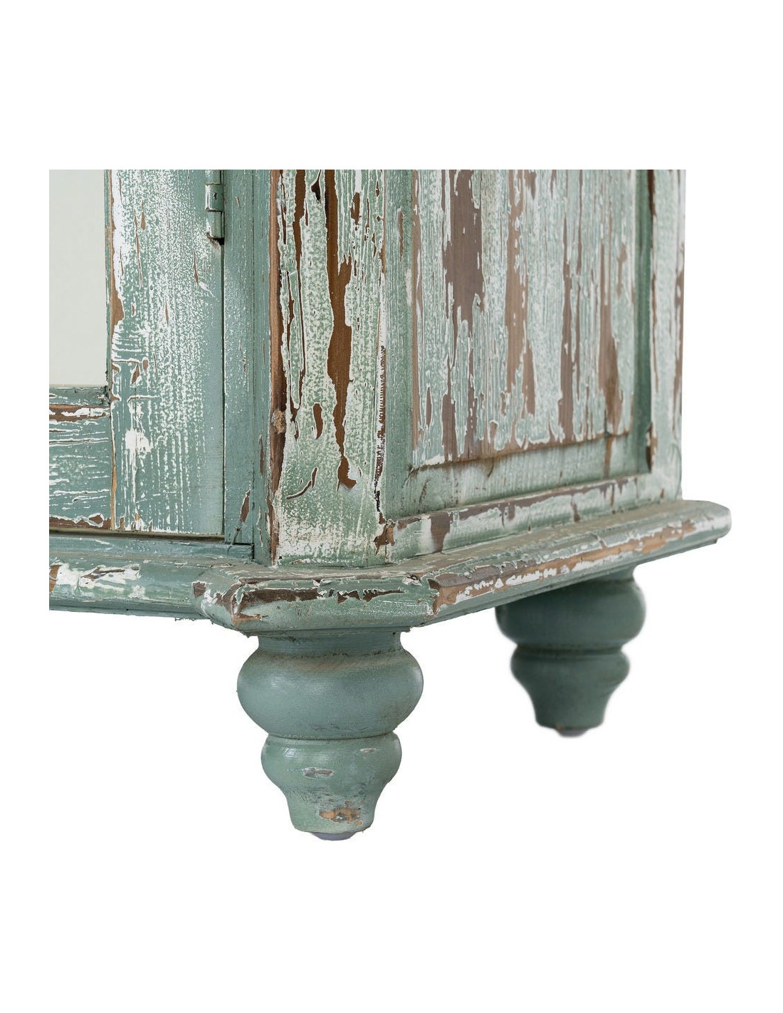Grand Buffet Vaisselier bohème ethnique Haut 2 portes Bois recyclé Vert Patiné Verre Transparent Verdenzio