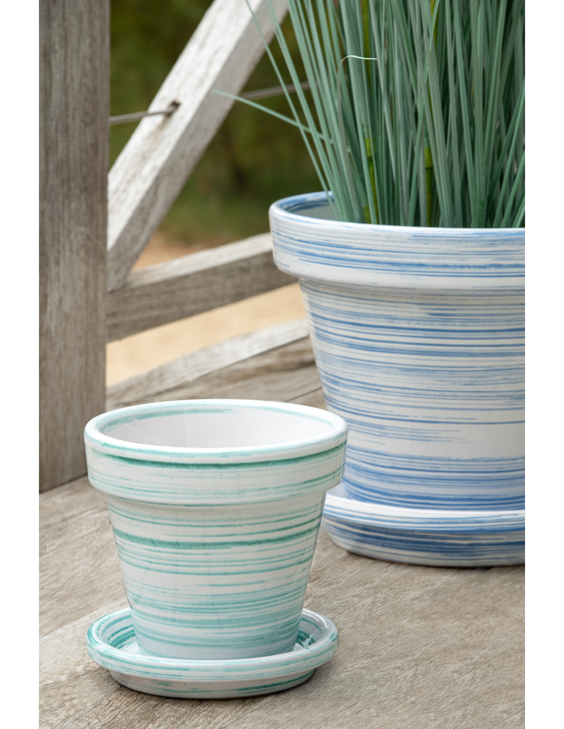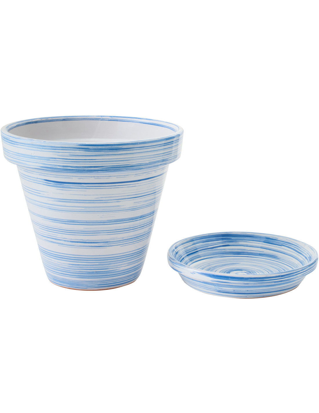 Grand Cache-pot avec soucoupe style bord de mer Rond D 35 cm Céramique Bleu Blanc Motif lignes Coastalia
