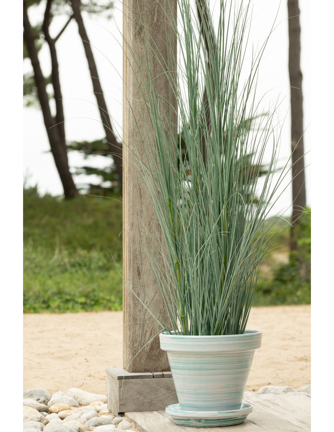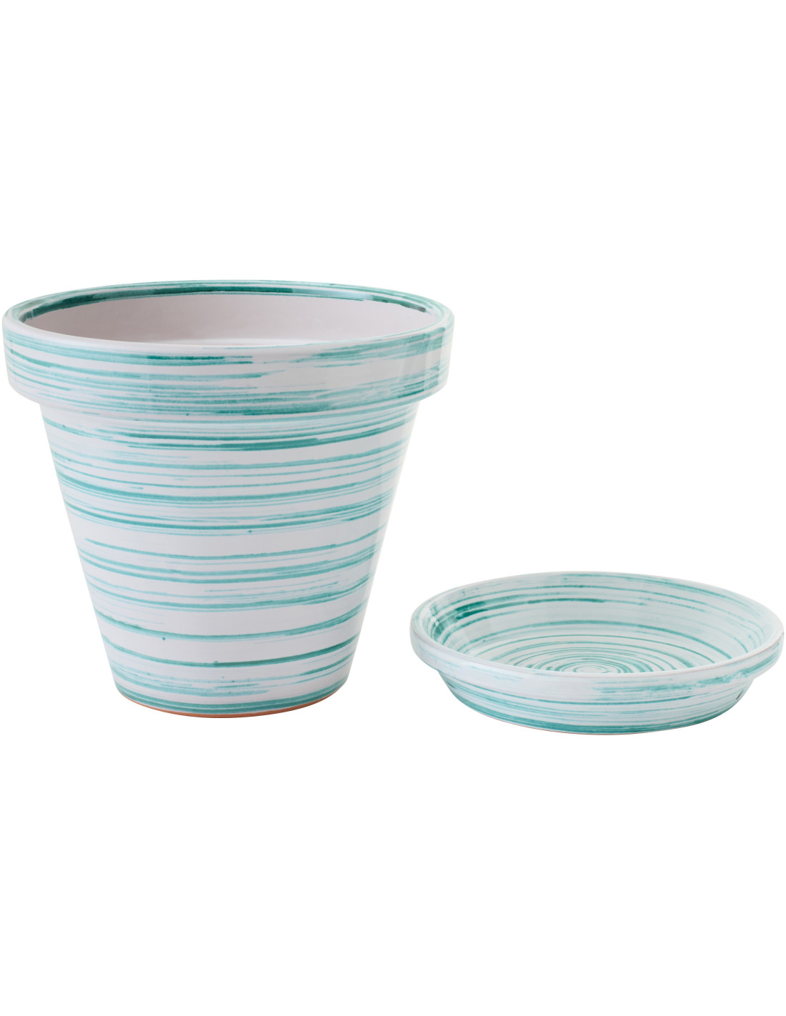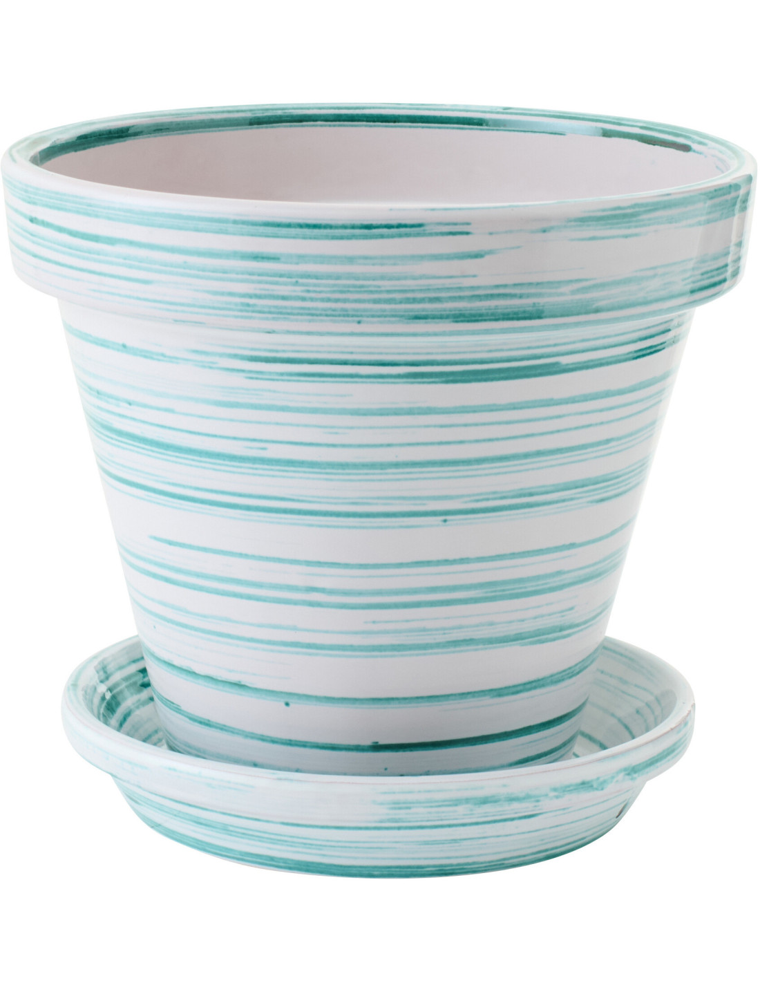 Grand Cache-pot avec soucoupe style bord de mer Rond D 35 cm Céramique Vert menthe Blanc Motif lignes Coastalia