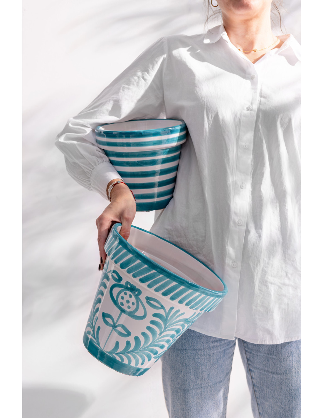 Grand Cache pot original extérieur Rond Diamètre 50 cm en Céramique Vert Blanc Motif lignes Granada - 1