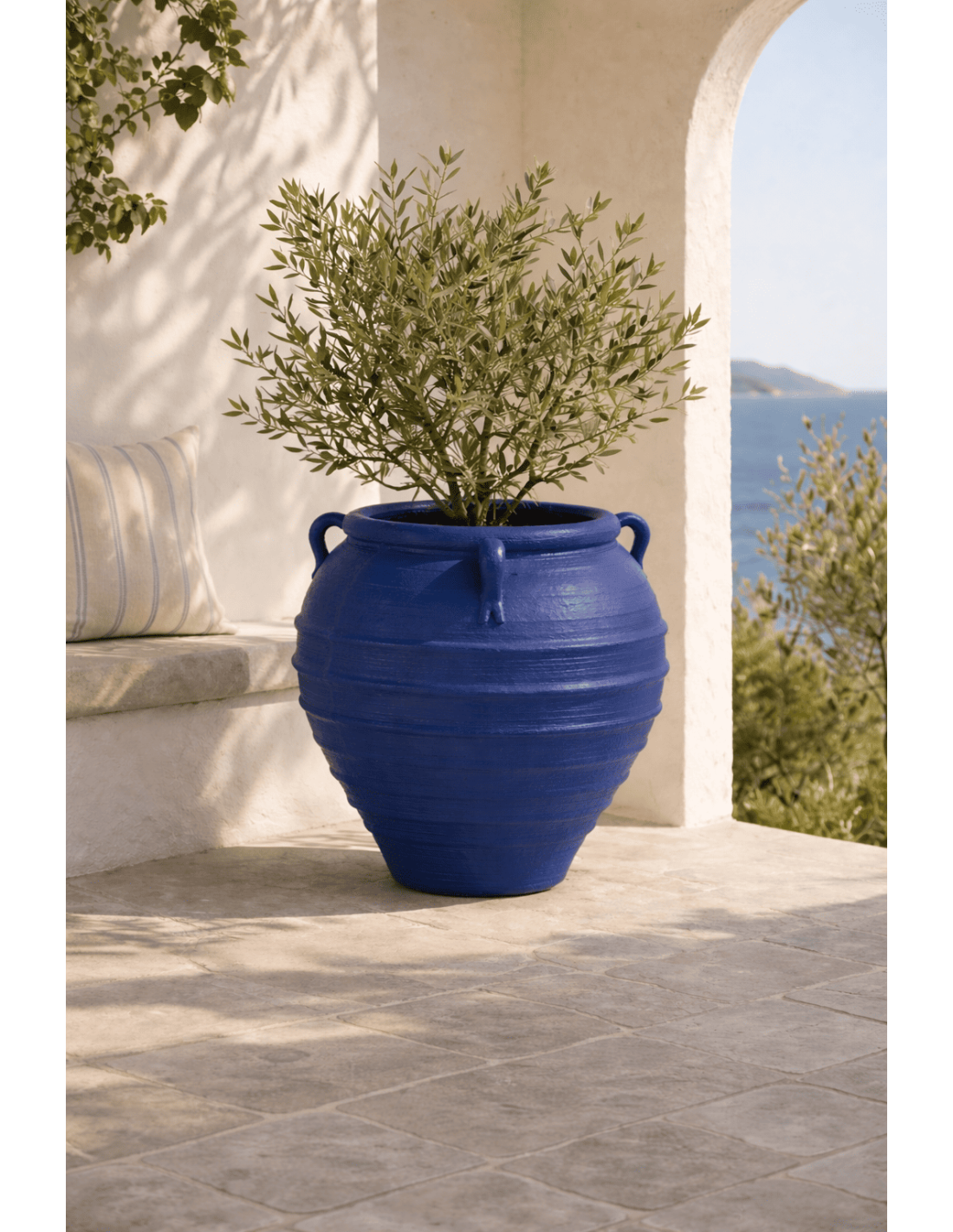 Un grand cache-pot à l’allure méditerranéenne, pensé pour imposer une présence forte. Zurénia associe une forme amphore sculpturale à un bleu foncé intense qui transforme immédiatement l’espace.