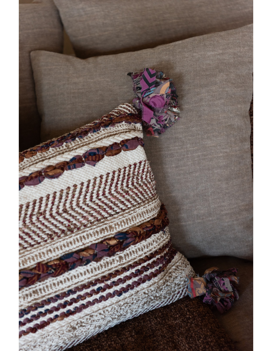 Grand Coussin africain Rectagulaire 60x40 en Coton Blanc crème Marron Avec pompons Chindi - 3