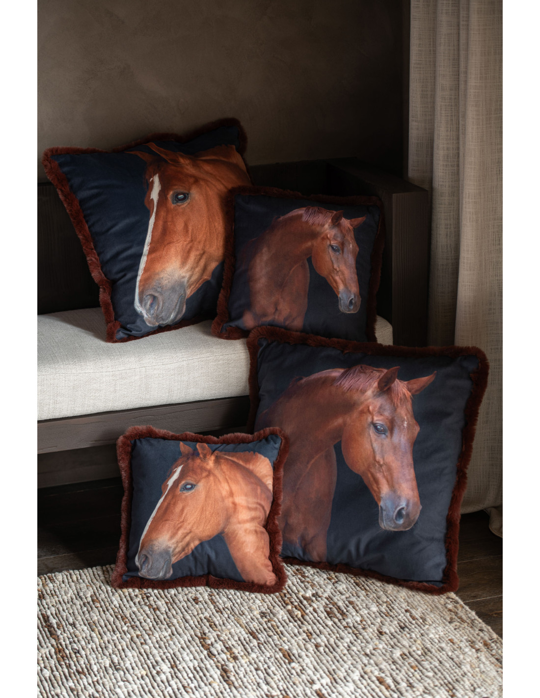 Grand Coussin original Cheval Carré 60x60 en Tissu Marron Noir Avec franges Wildora (Lot de 2) - 3