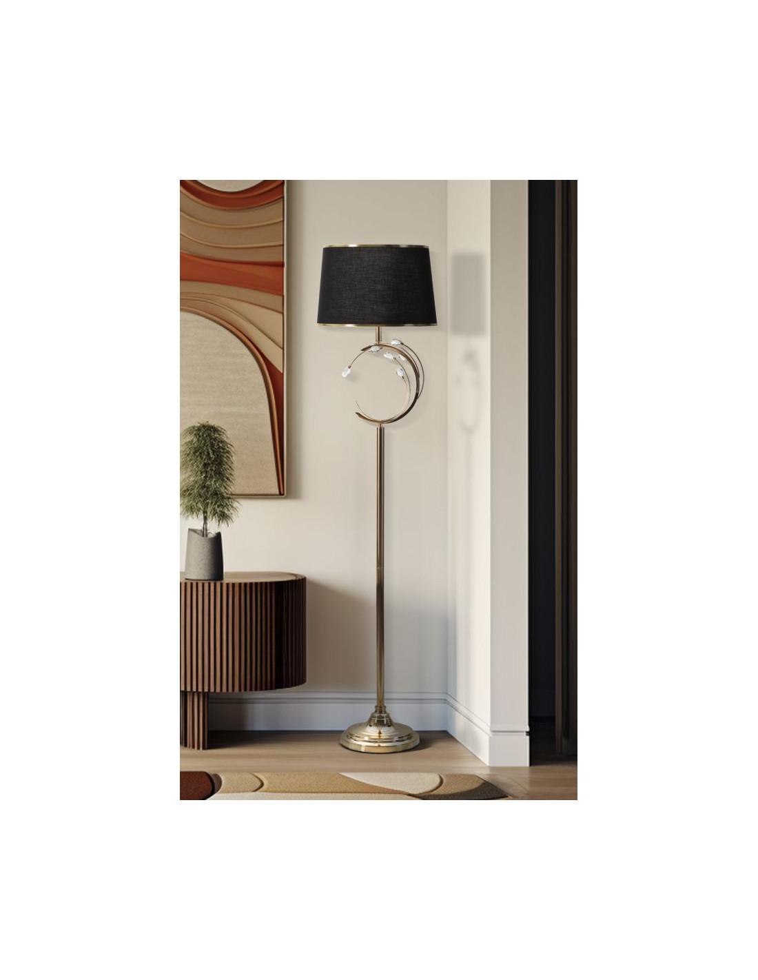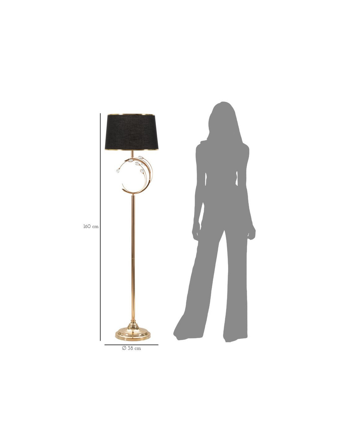 Grand Lampadaire sur pied moderne chic Hauteur 160 cm Métal Doré Tissu Noir Verre Transparent Bruxelles