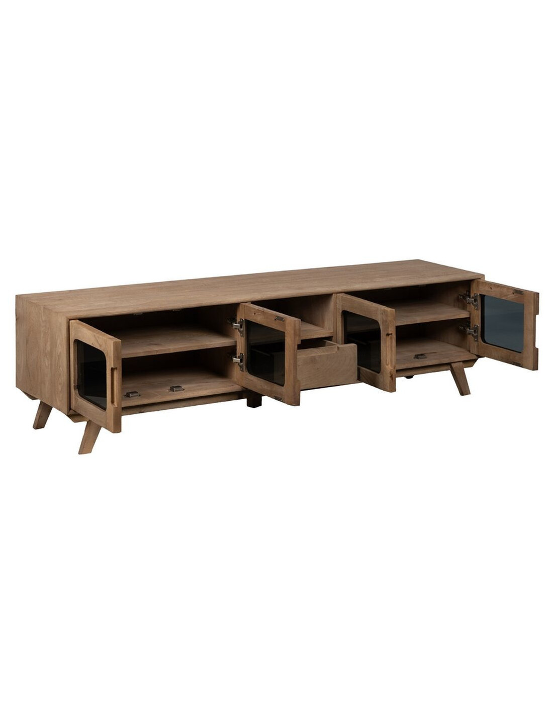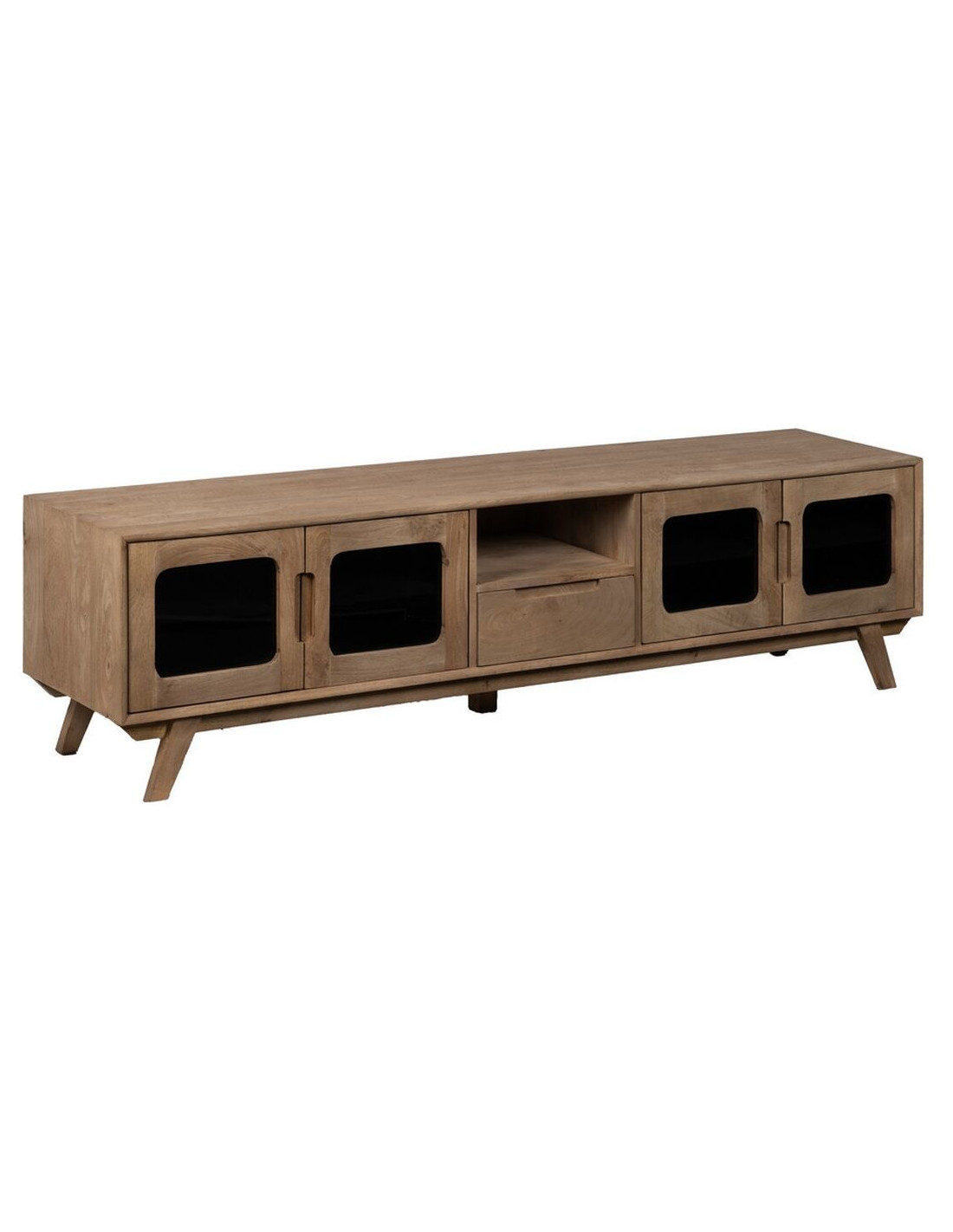 Grand Meuble de télé moderne 4 portes 1 tiroir 1 niche en Bois de manguier Naturel Verre Noir Semi transparent Burnie - 1