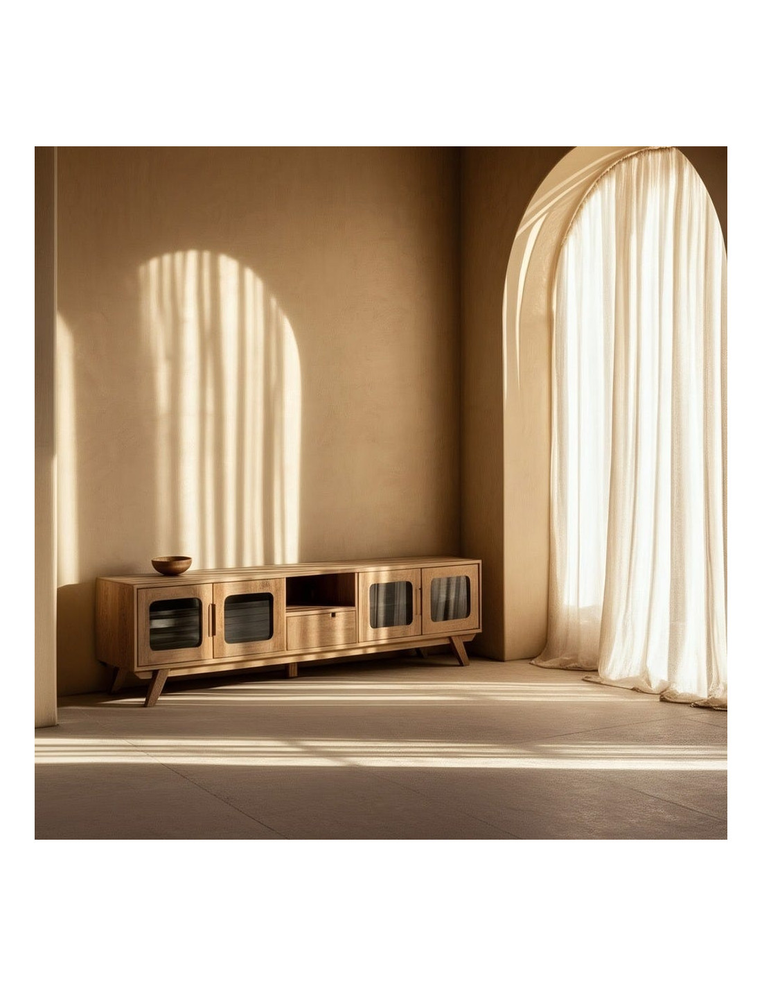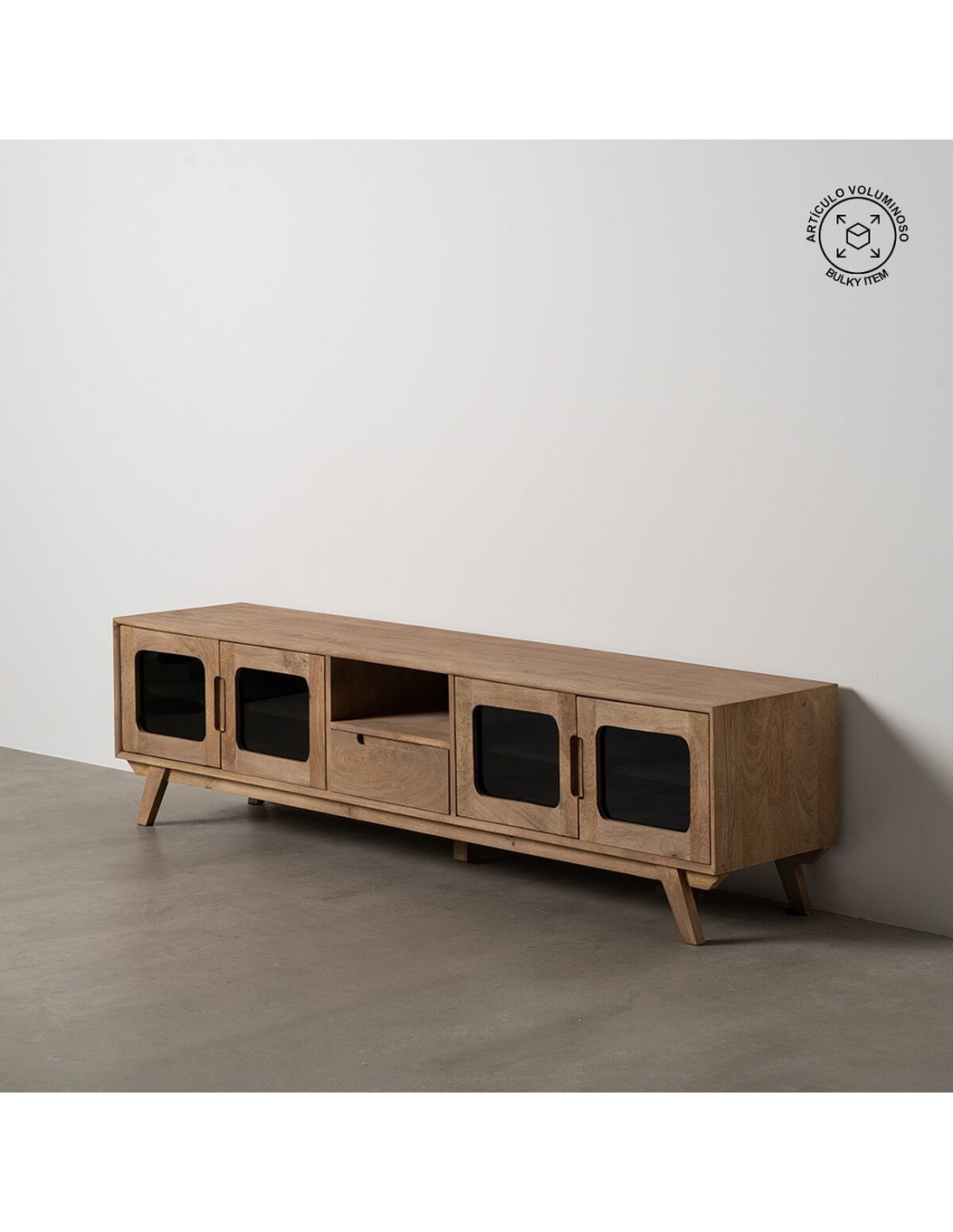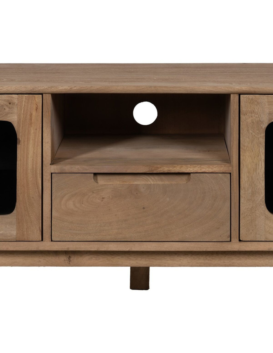 Grand Meuble de télé moderne 4 portes 1 tiroir 1 niche en Bois de manguier Naturel Verre Noir Semi transparent Burnie