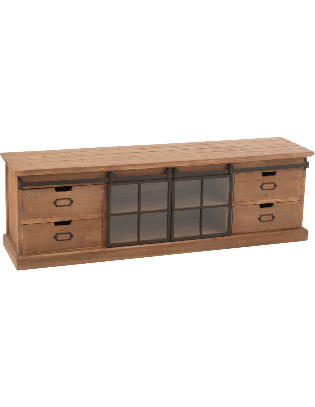 Grand Meuble télé industriel chic 2 portes 4 tiroirs en Bois MDF Naturel Verre Transparent Métal Noir Sinastra