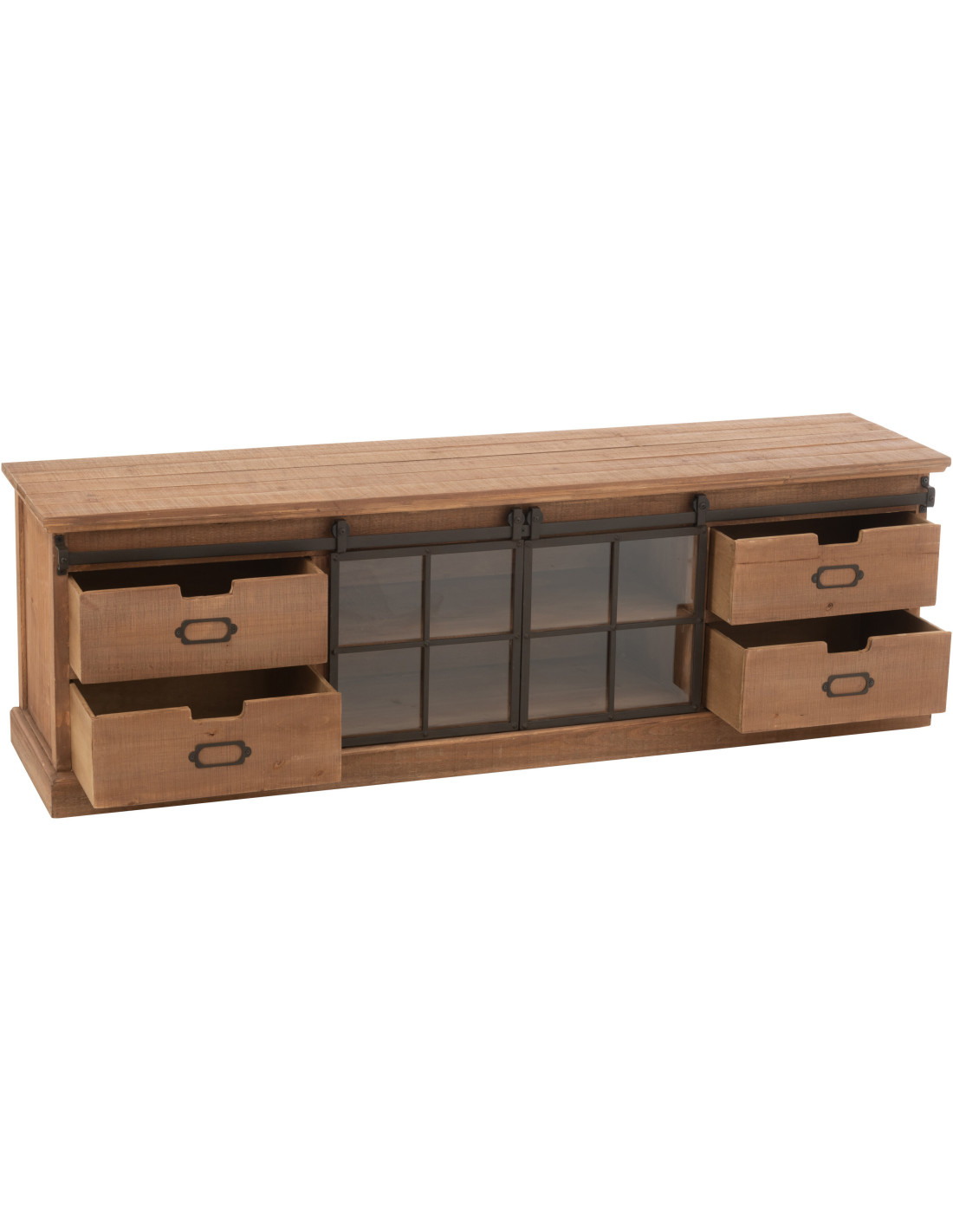 Grand Meuble télé industriel chic 2 portes 4 tiroirs en Bois MDF Naturel Verre Transparent Métal Noir Sinastra - 3