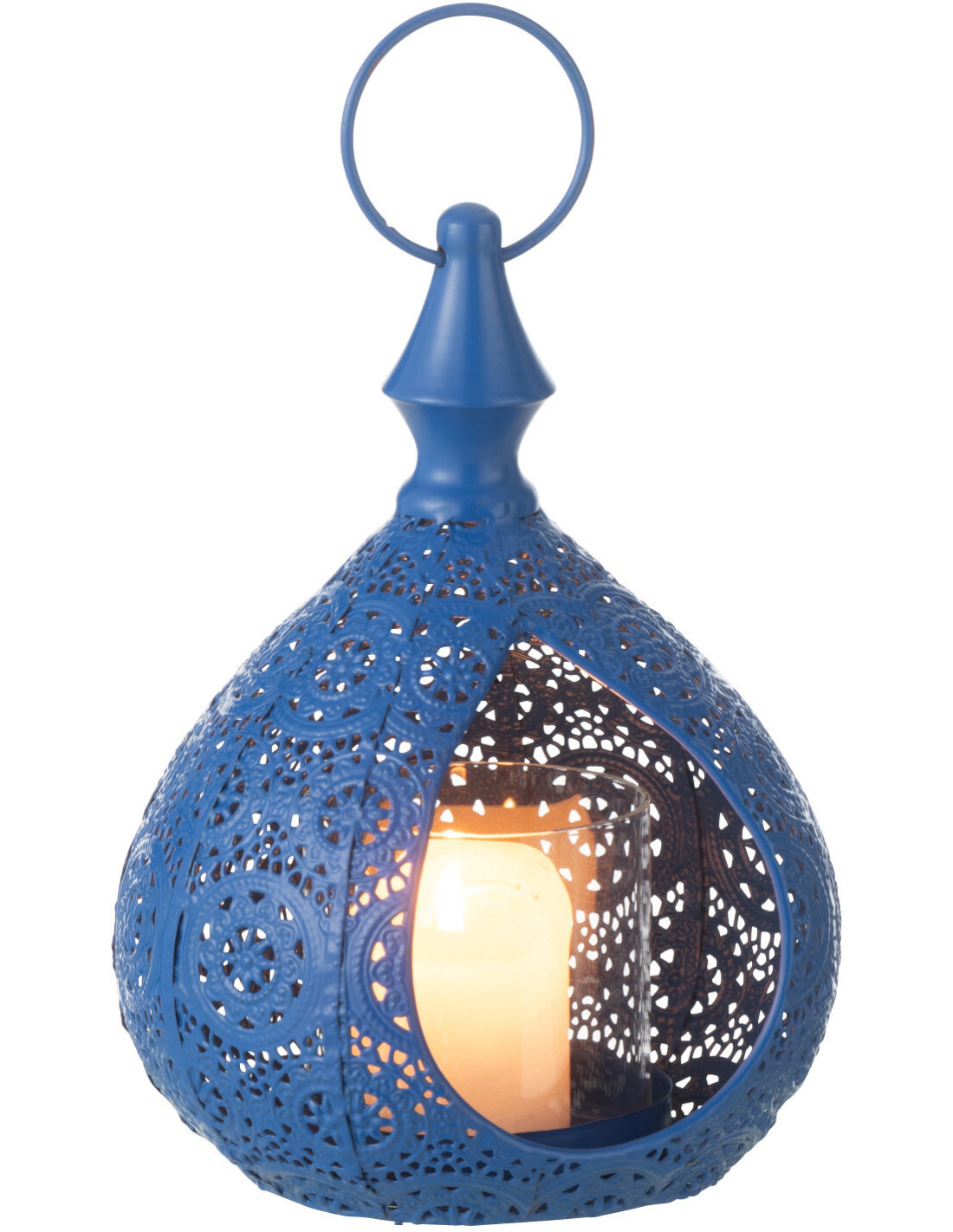 Grand Photophore Lanterne mexicaine Hauteur 21 cm en Métal Bleu Verre Transparent Ajouré Lupita - 1