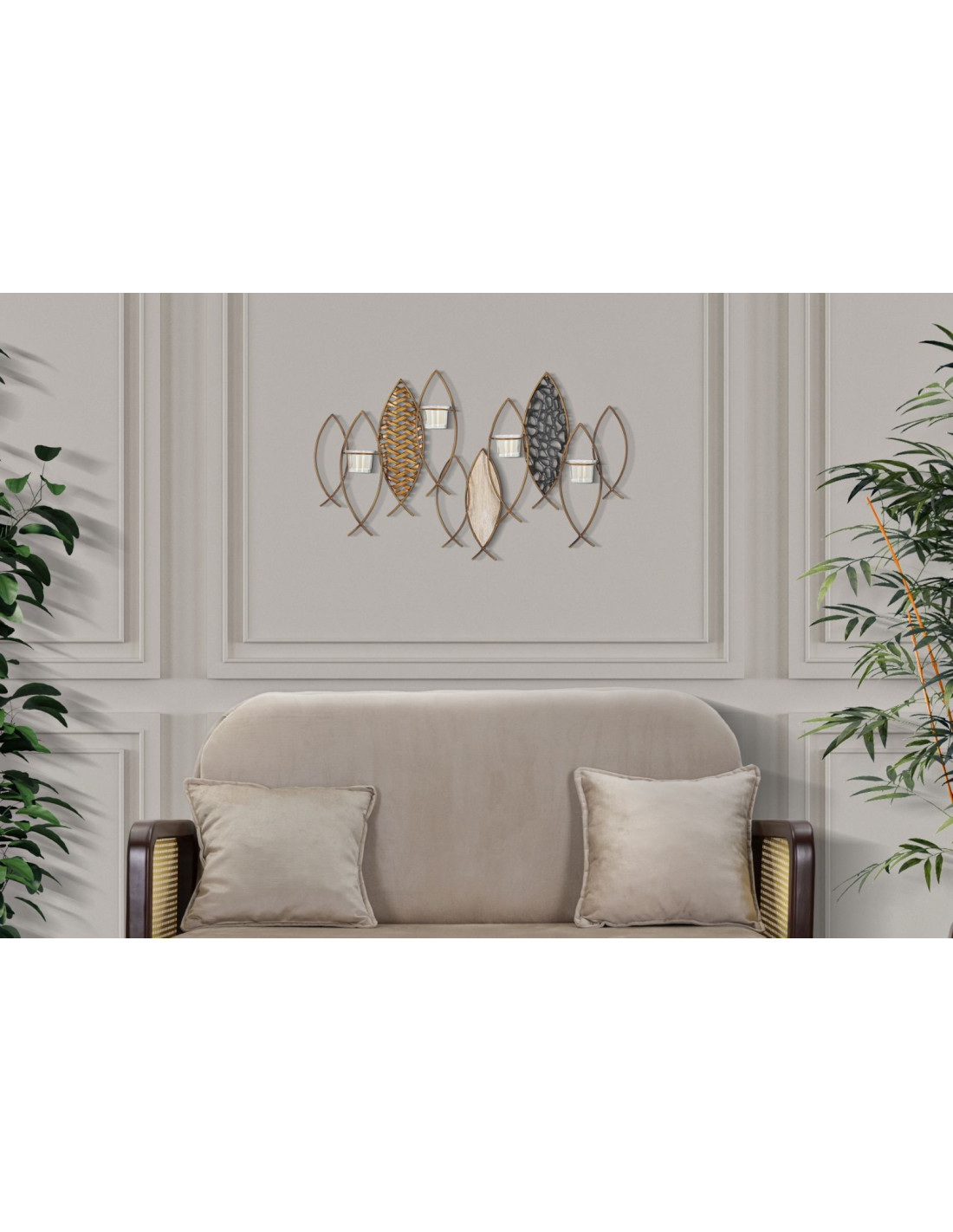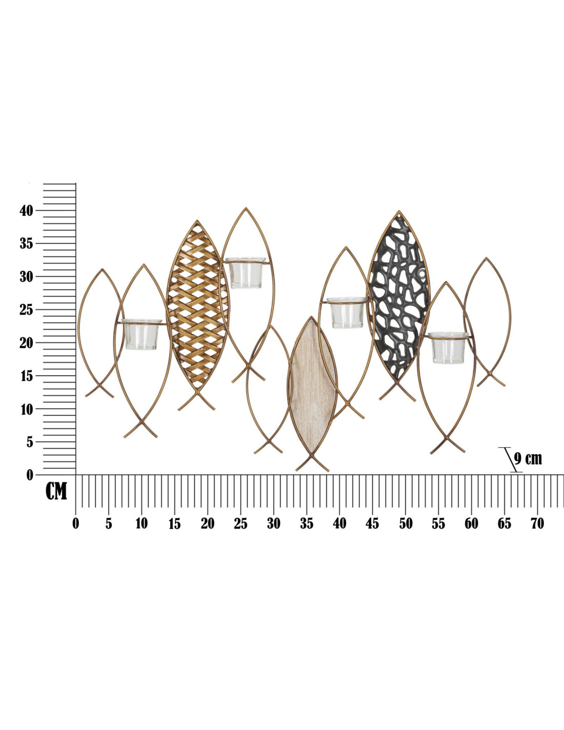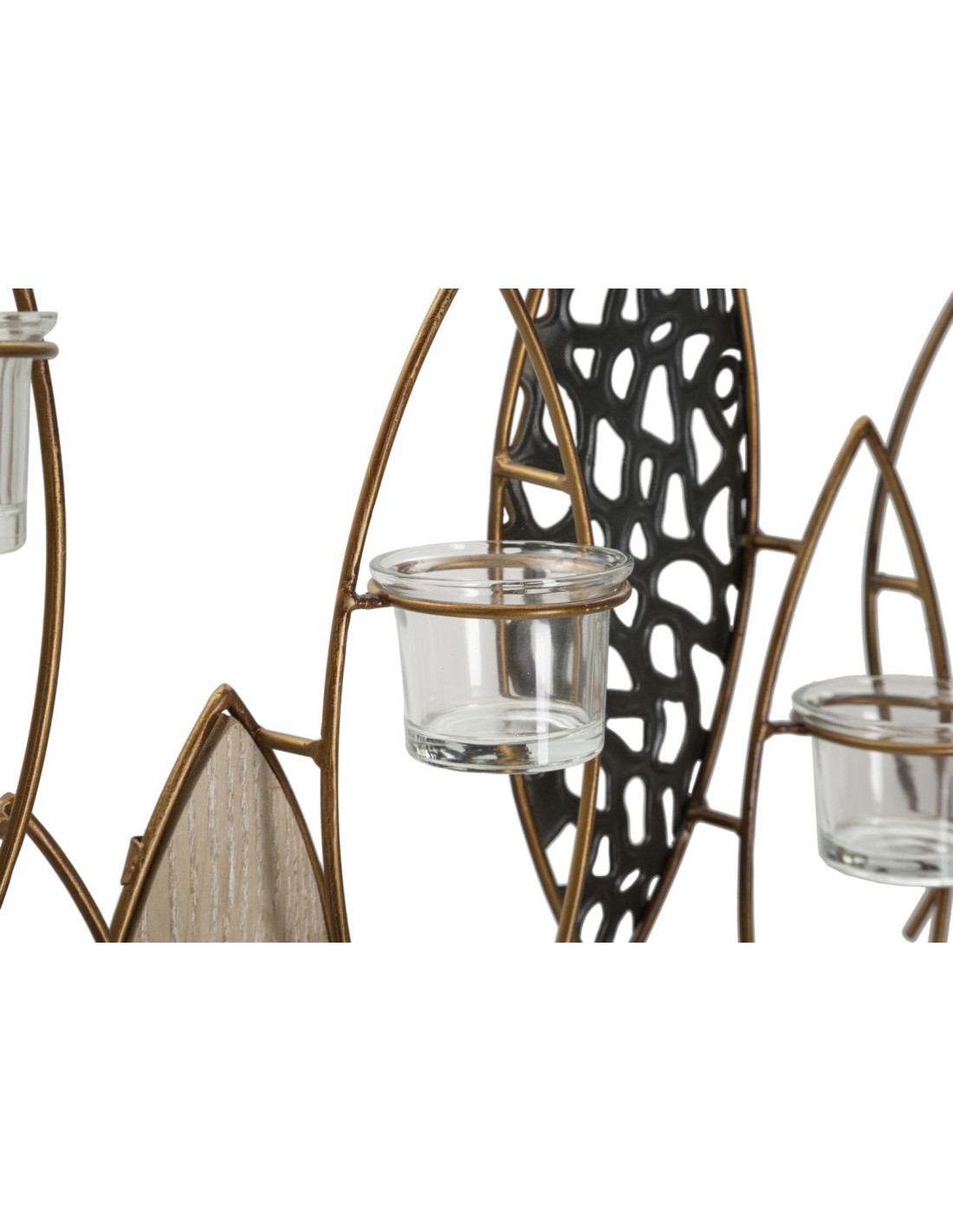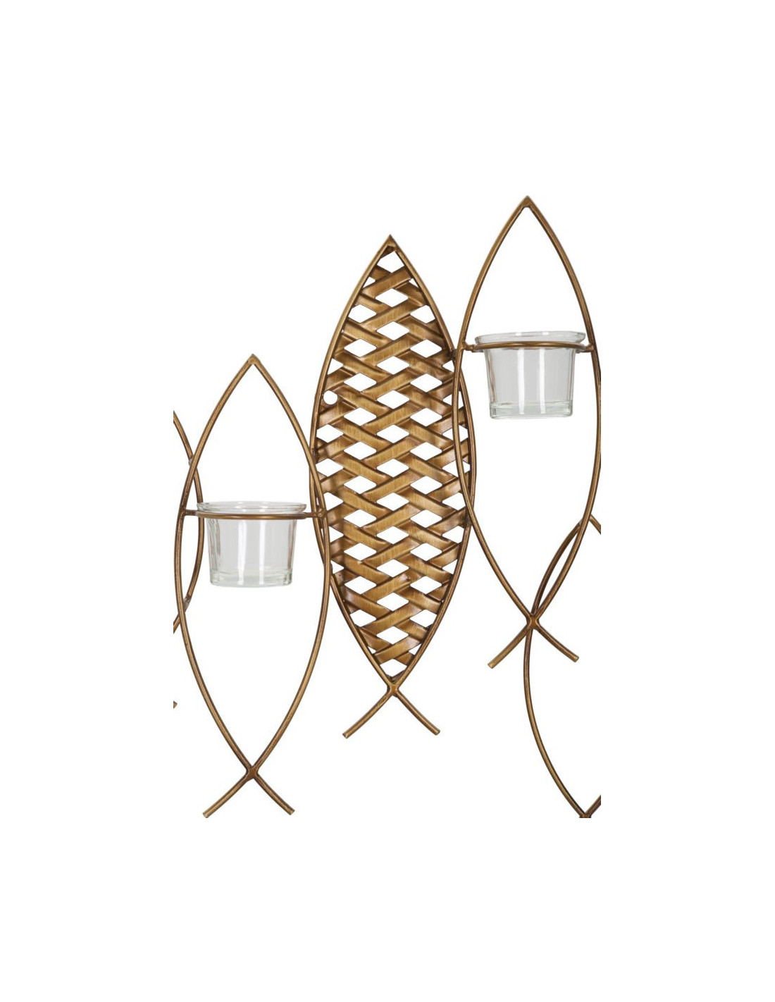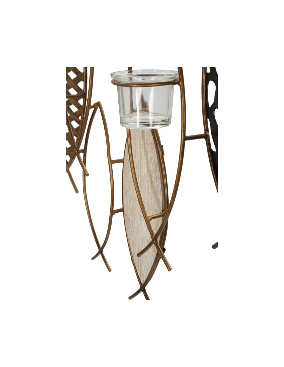 Grand Photophore mural Poissons 4 bougies Métal Doré Noir Verre Transparent Bois MDF Naturel Fish