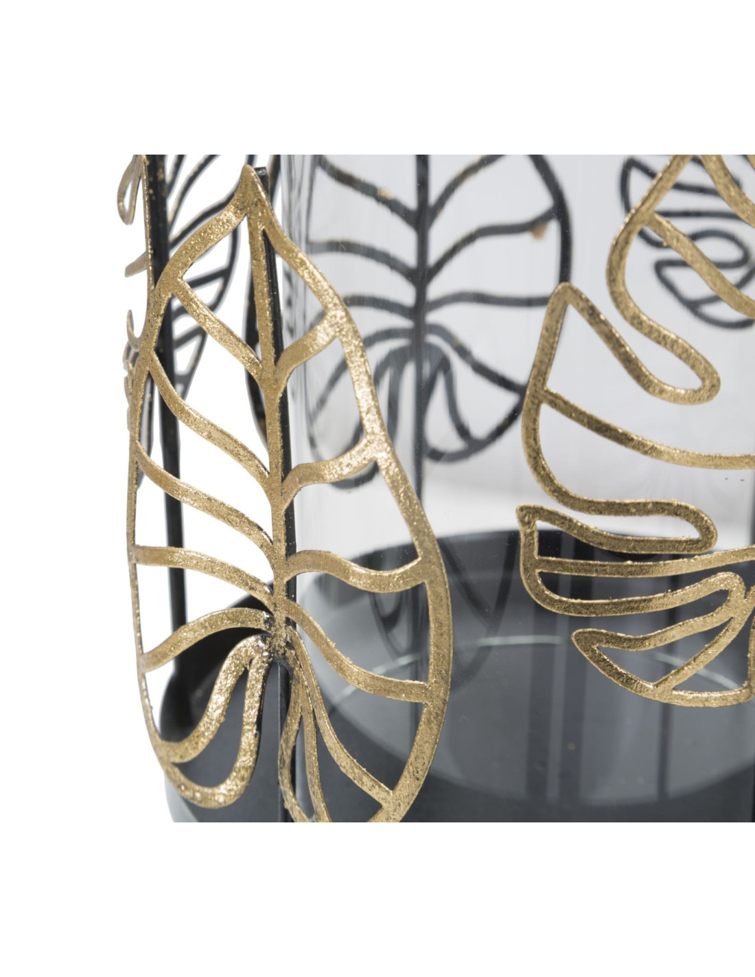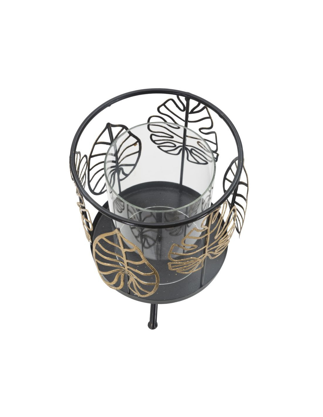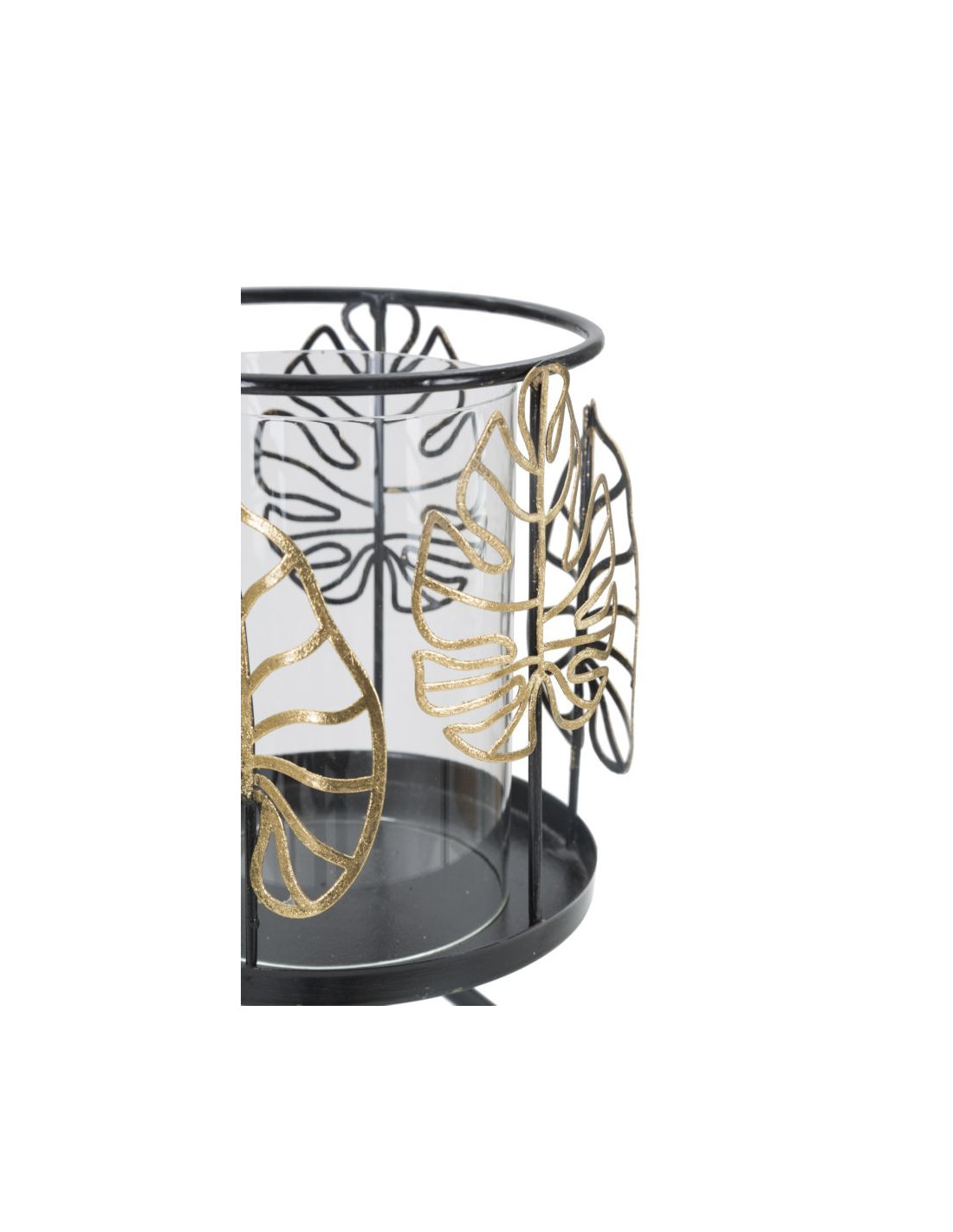 Grand Photophore sur pied original Feuilles Hauteur 23 cm en Verre Transparent Métal Noir Doré Nolya