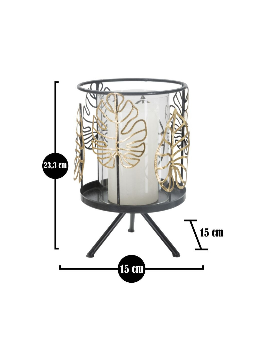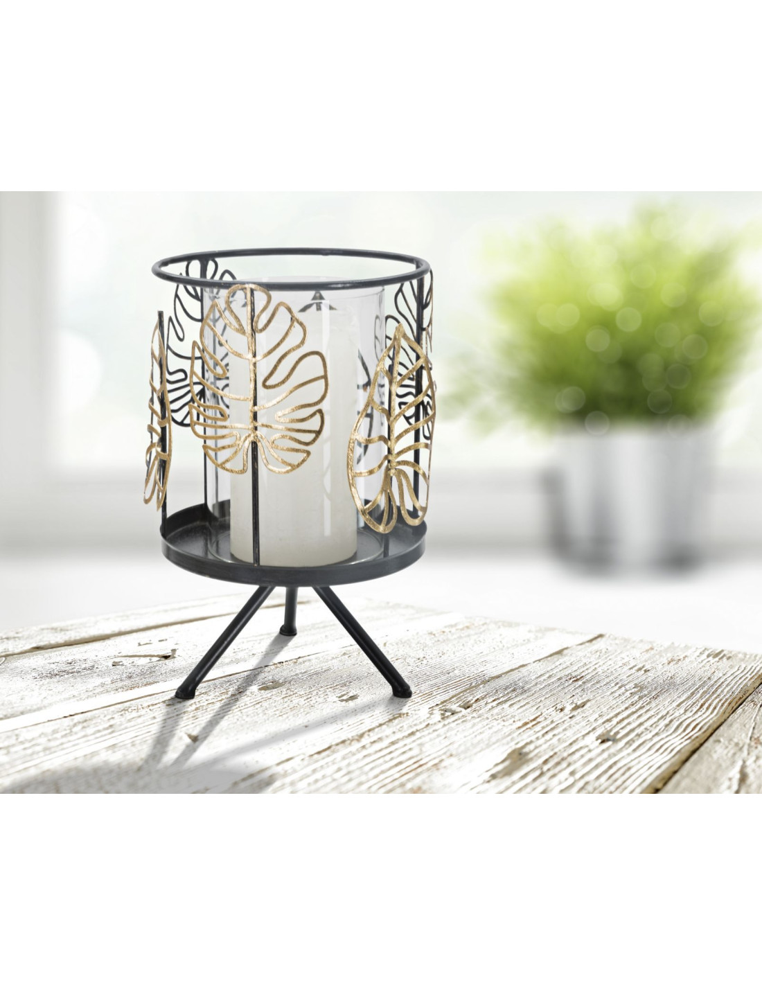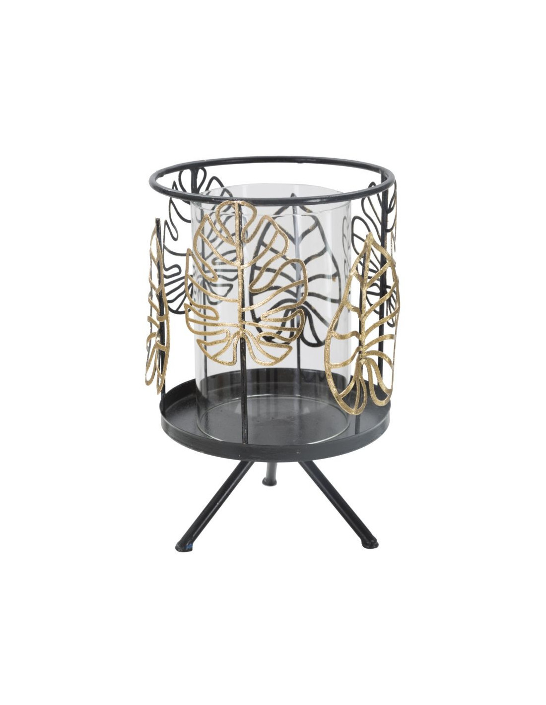 Grand Photophore sur pied original Feuilles Hauteur 23 cm en Verre Transparent Métal Noir Doré Nolya