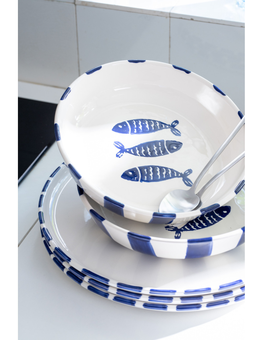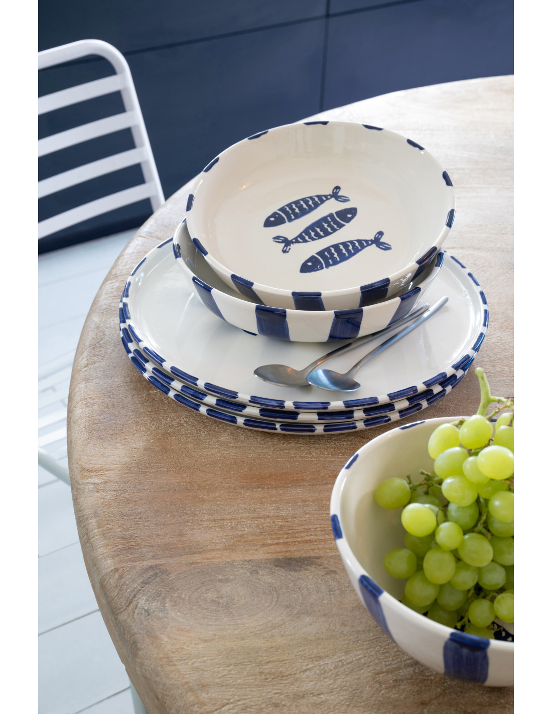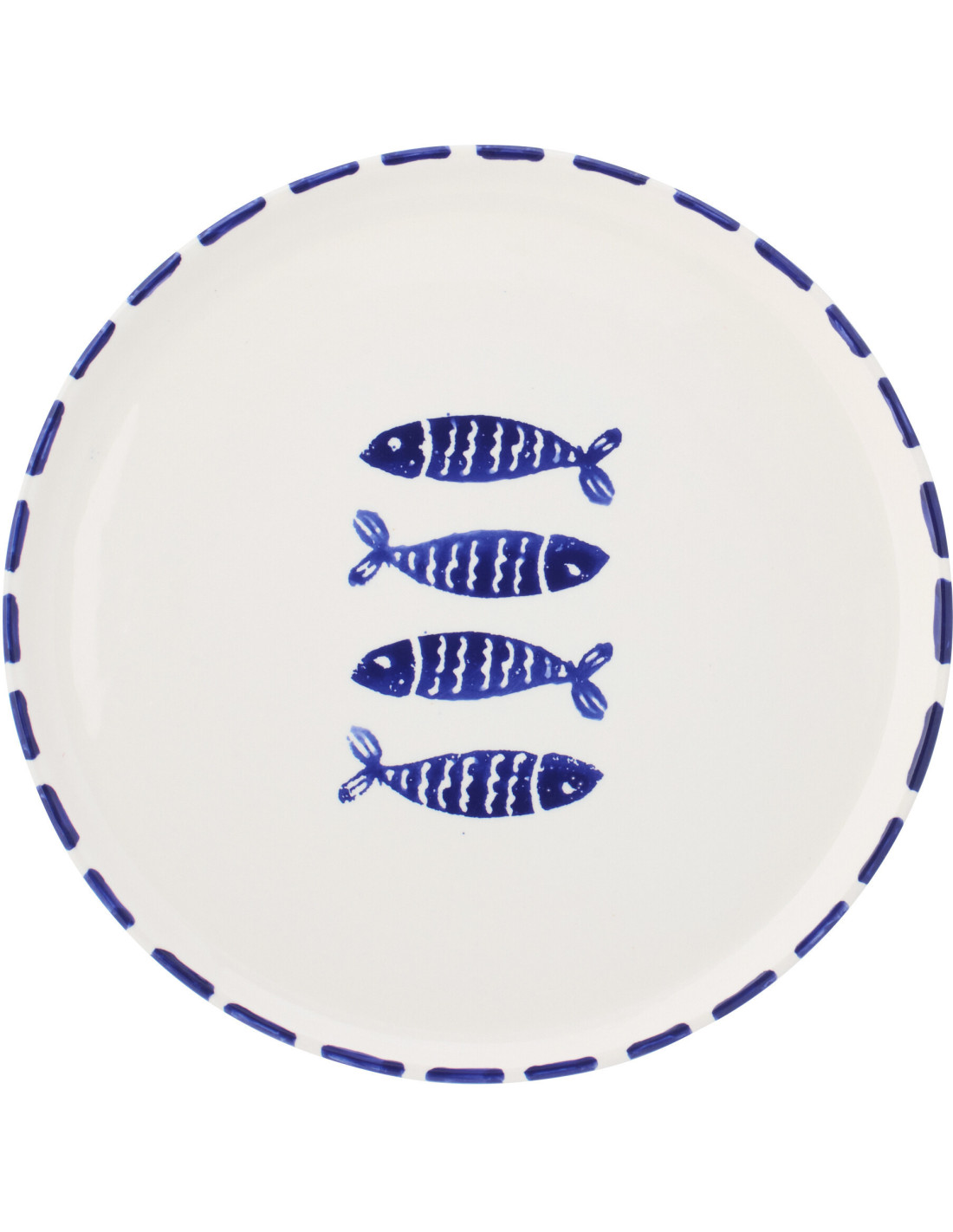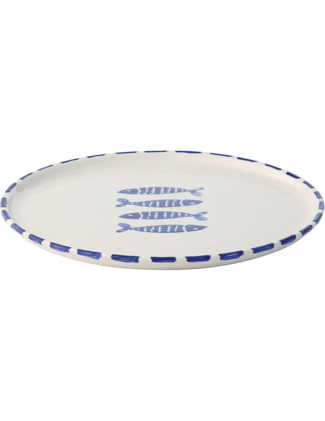 Grand Plat style bord de mer Rond 34 cm Céramique Bleu foncé Blanc Motif poissons Kust