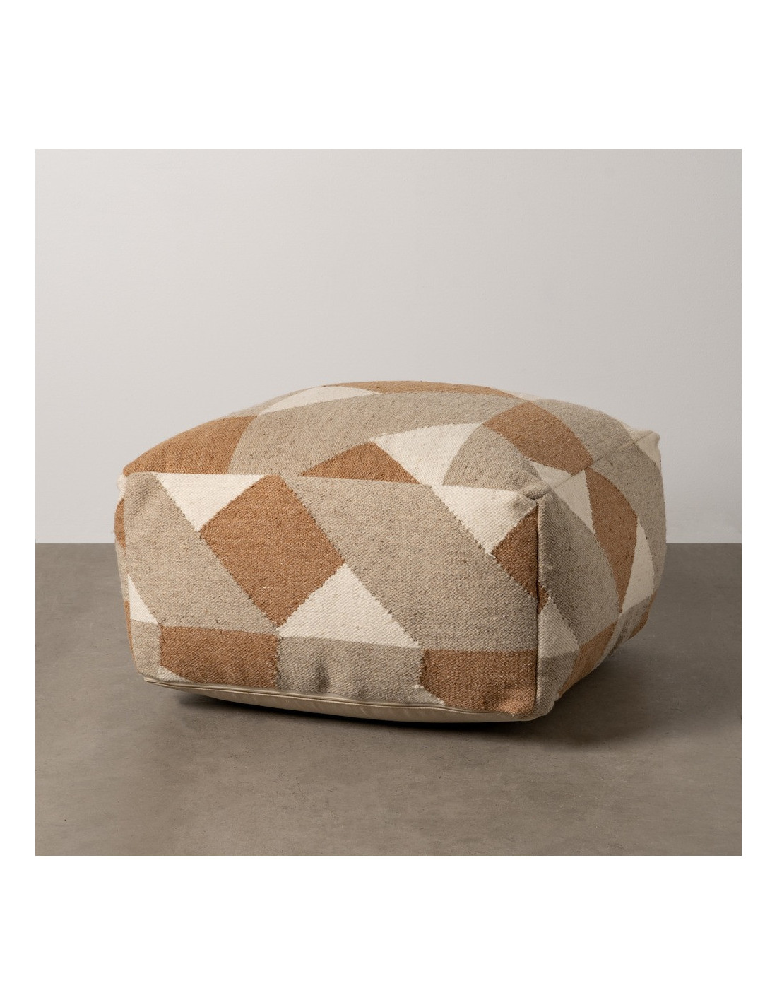 Grand Pouf ethnique chic Carré en Laine Coton Marron Blanc Motif géométrique Gata