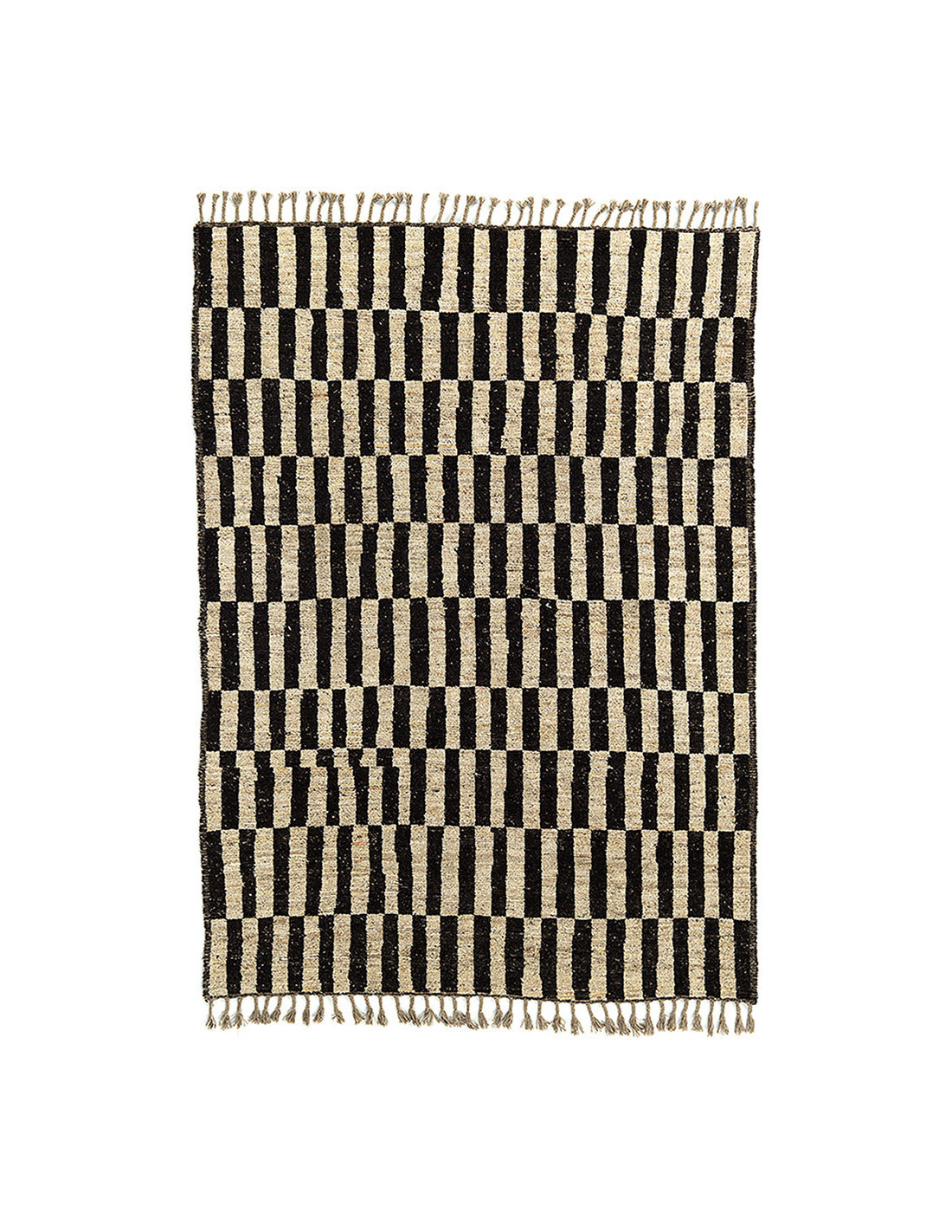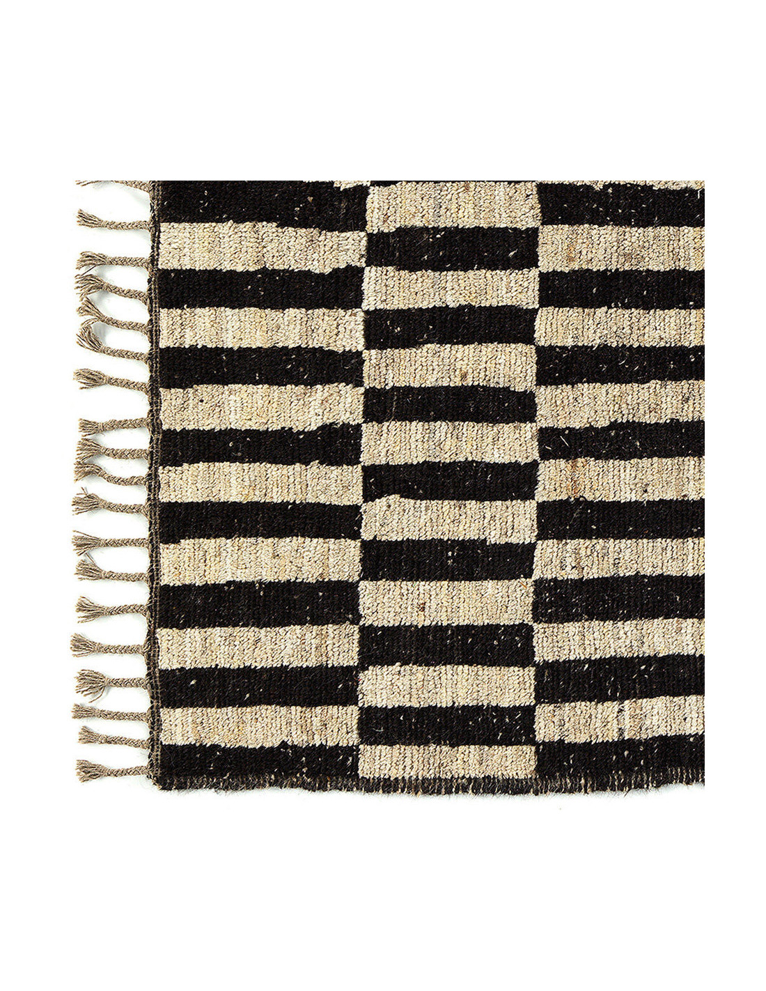 Grand Tapis Afghan ethnique chic Rectangulaire 205x306 Laine Noir Beige Avec franges Motif damier The Handwoven