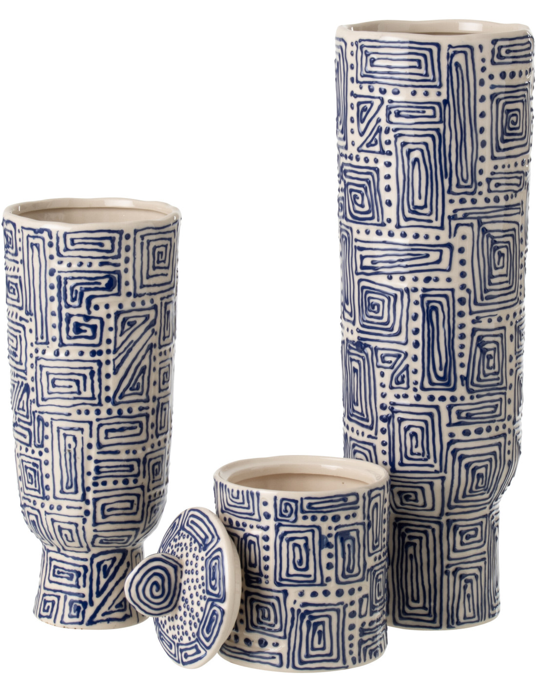 Grand Vase ethnique chic sur pied Cylindrique H 50 cm Céramique Blanc cassé Bleu foncé Labyria