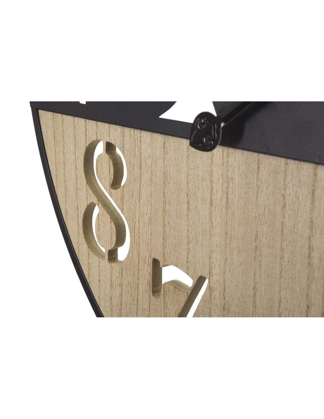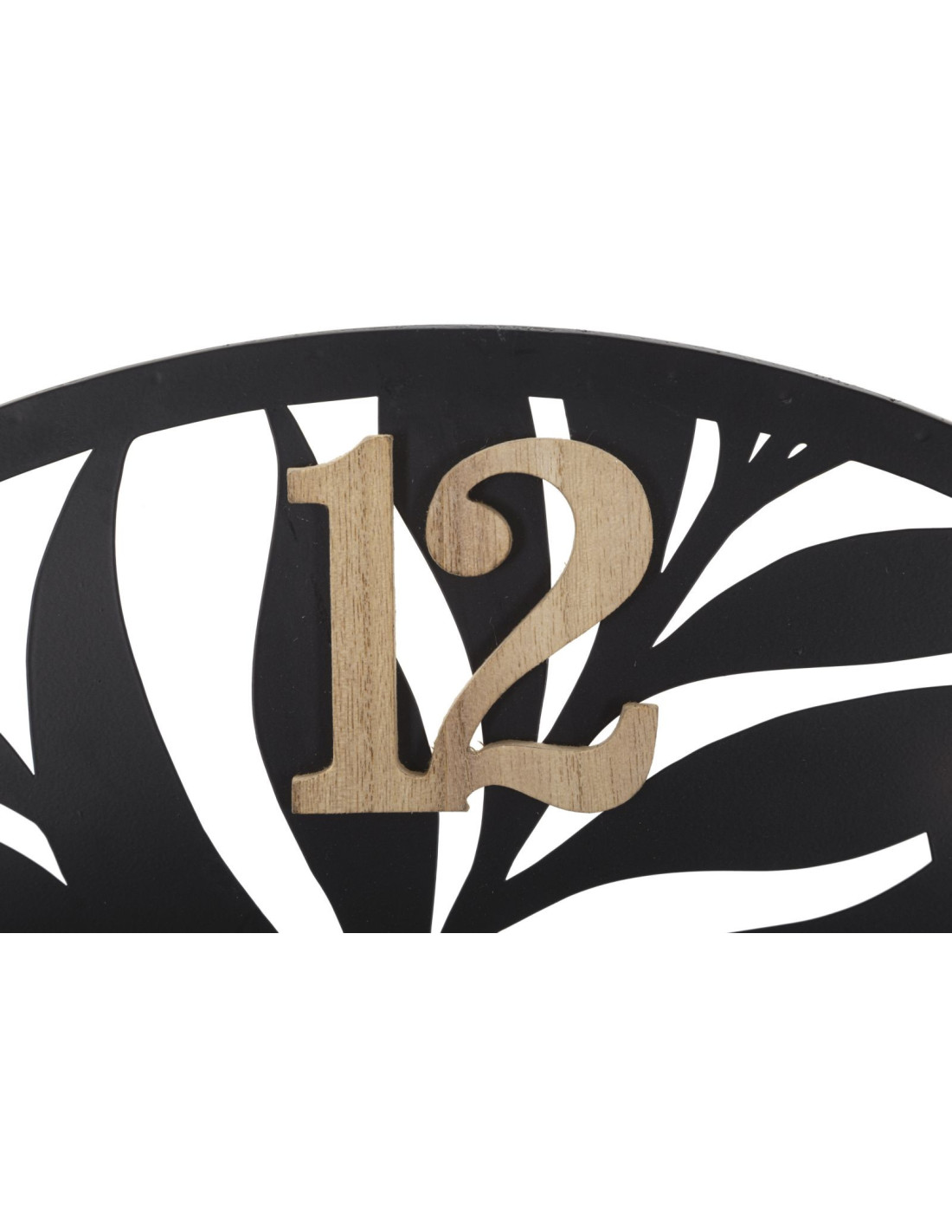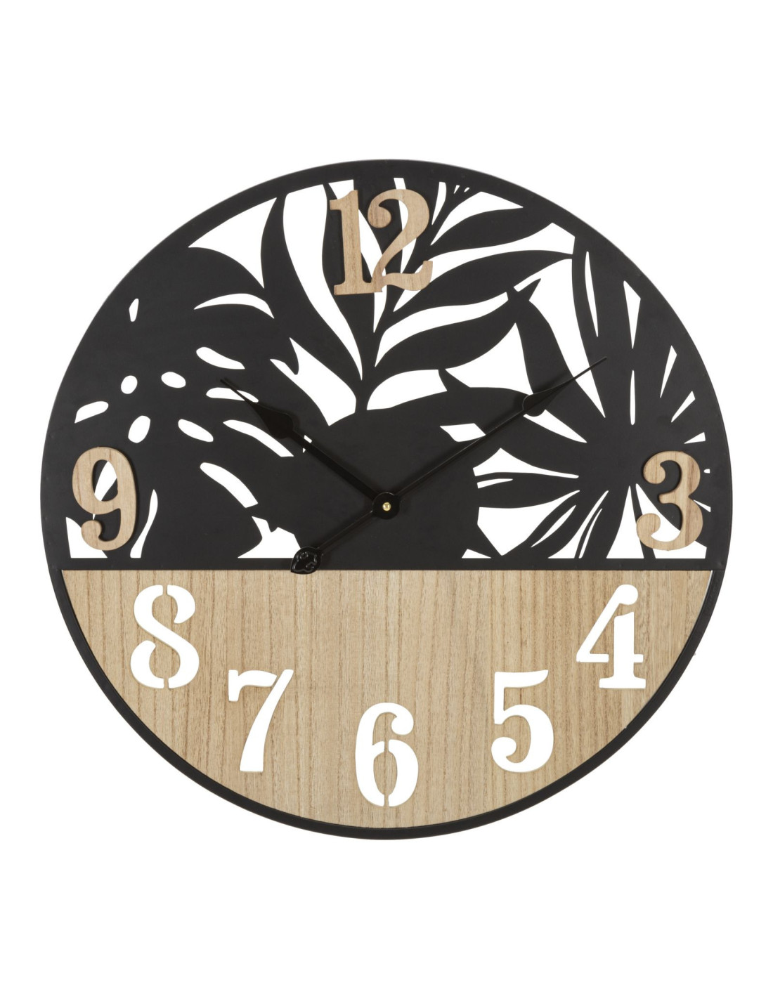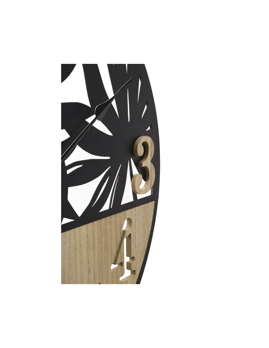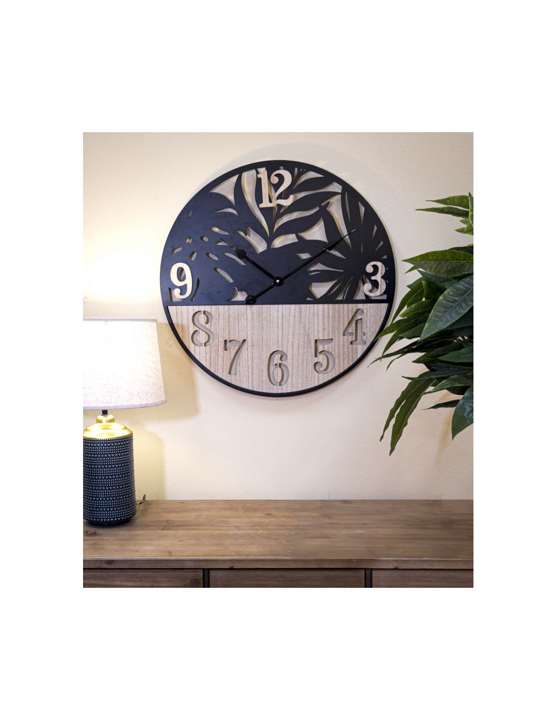 Grande Horloge murale moderne Feuilles Ronde 60 cm en Métal Noir Bois Naturel Palm