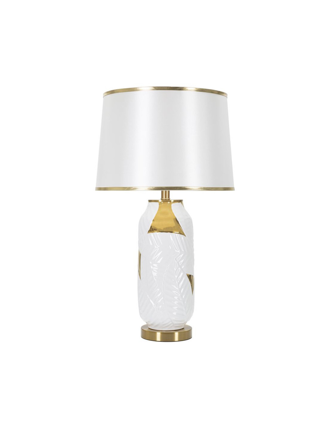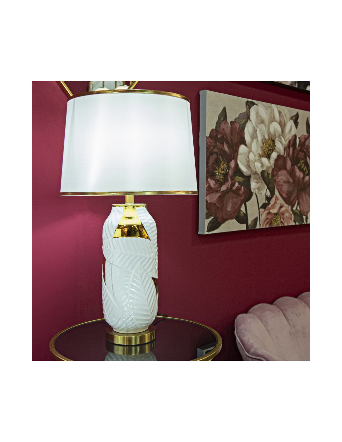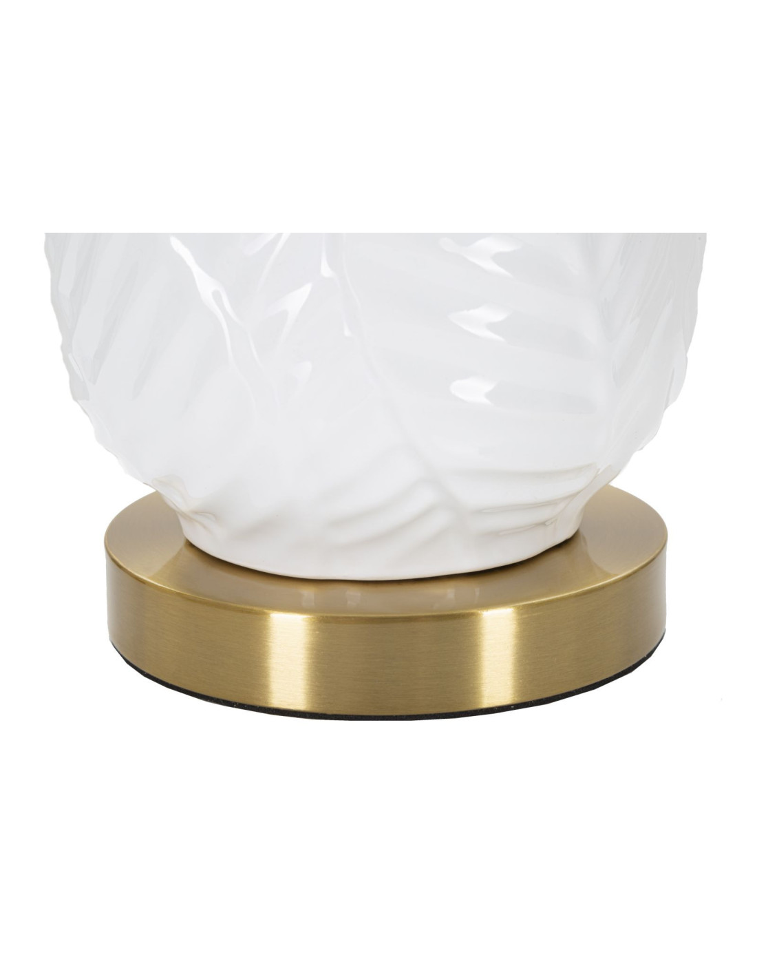 Grande Lampe à poser design art déco Céramique Métal Tissu Blanc Doré Motif feuilles Leaves
