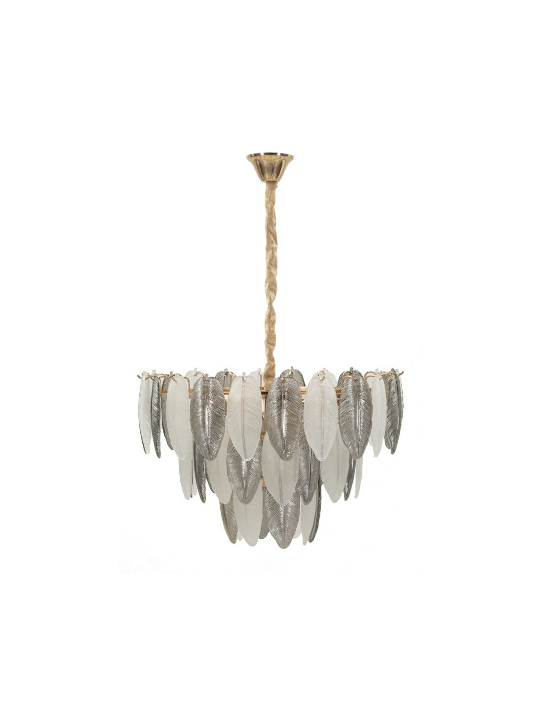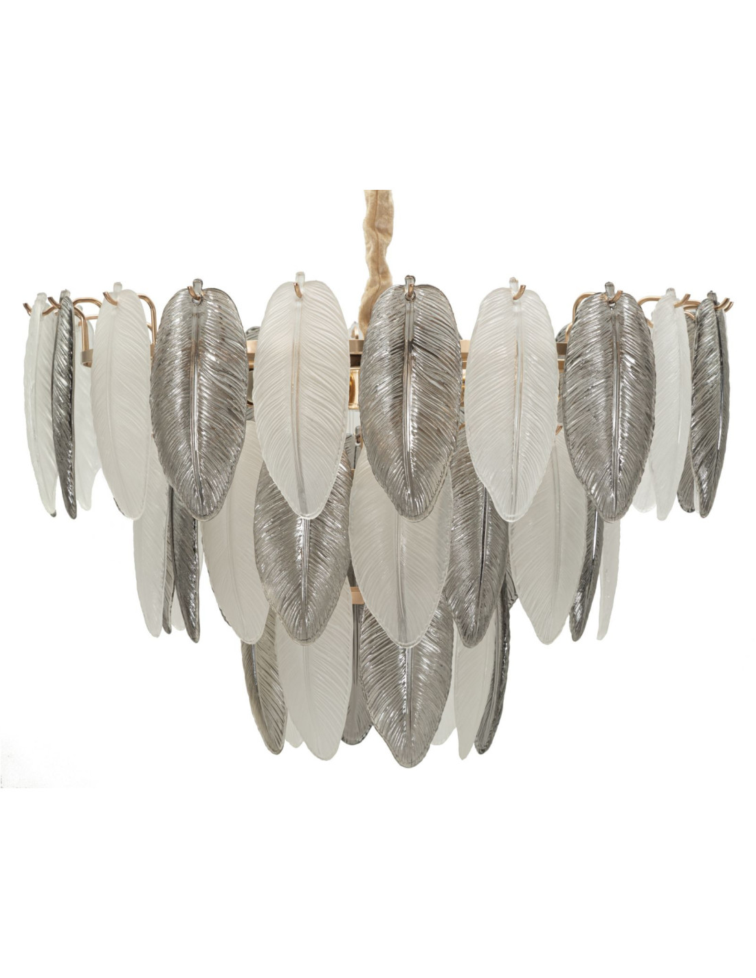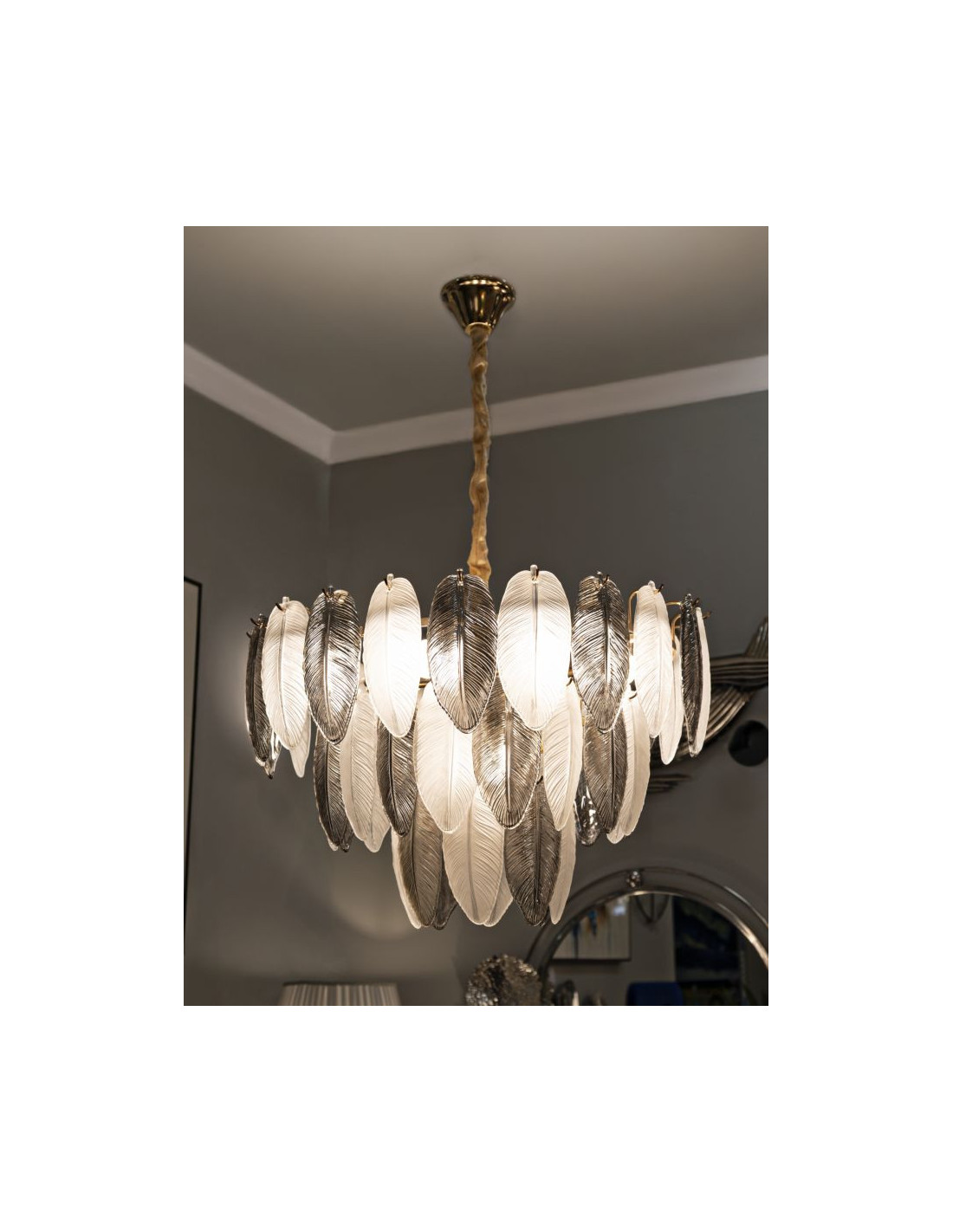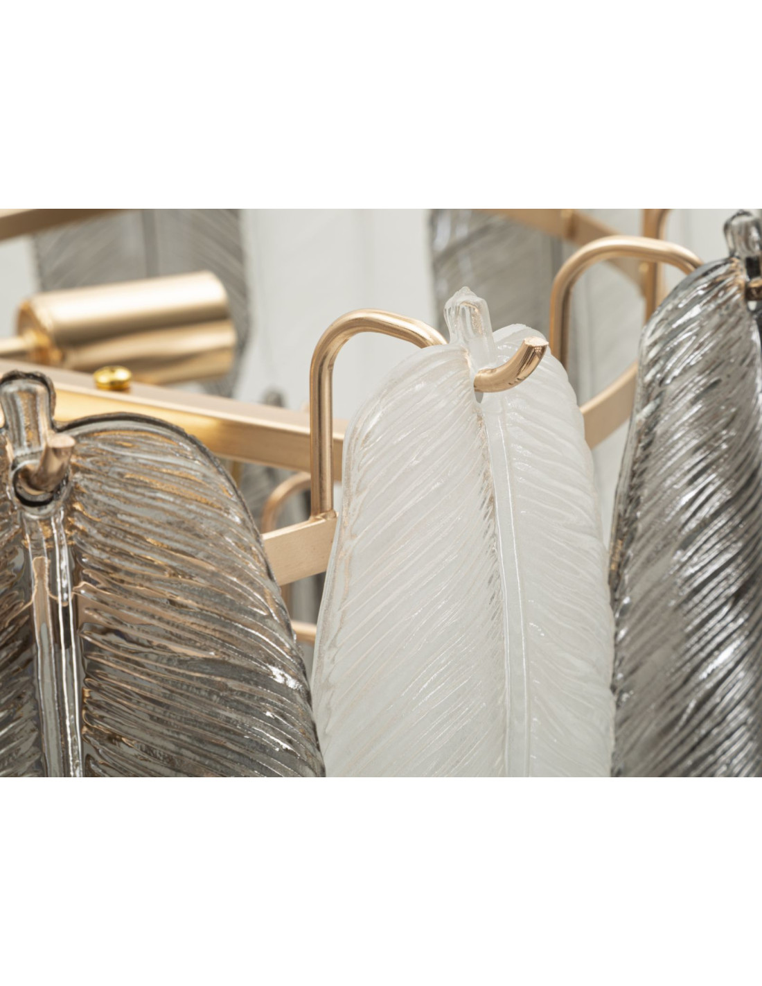 Grande Suspension moderne chic Plumes Diamètre 60 cm Verre Transparent Métal Argenté Doré Leafy