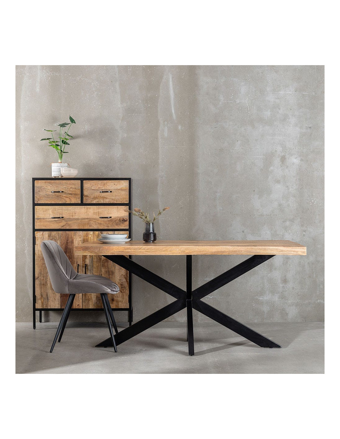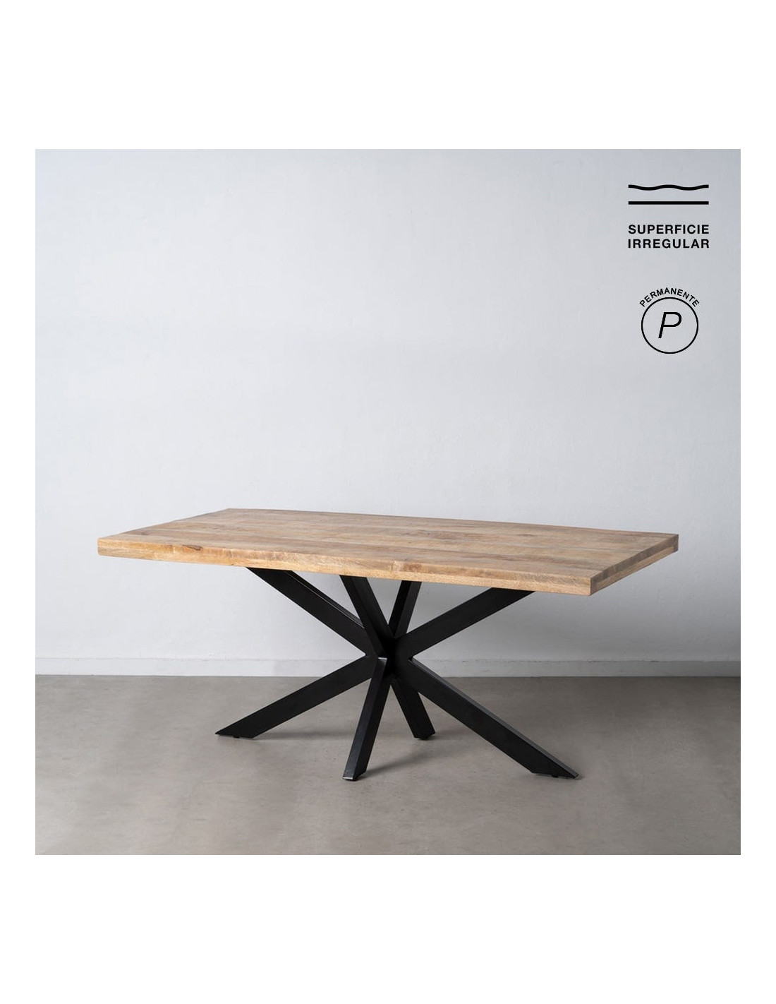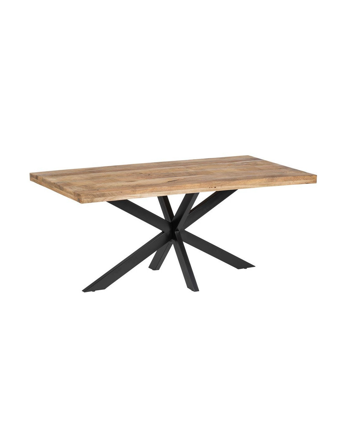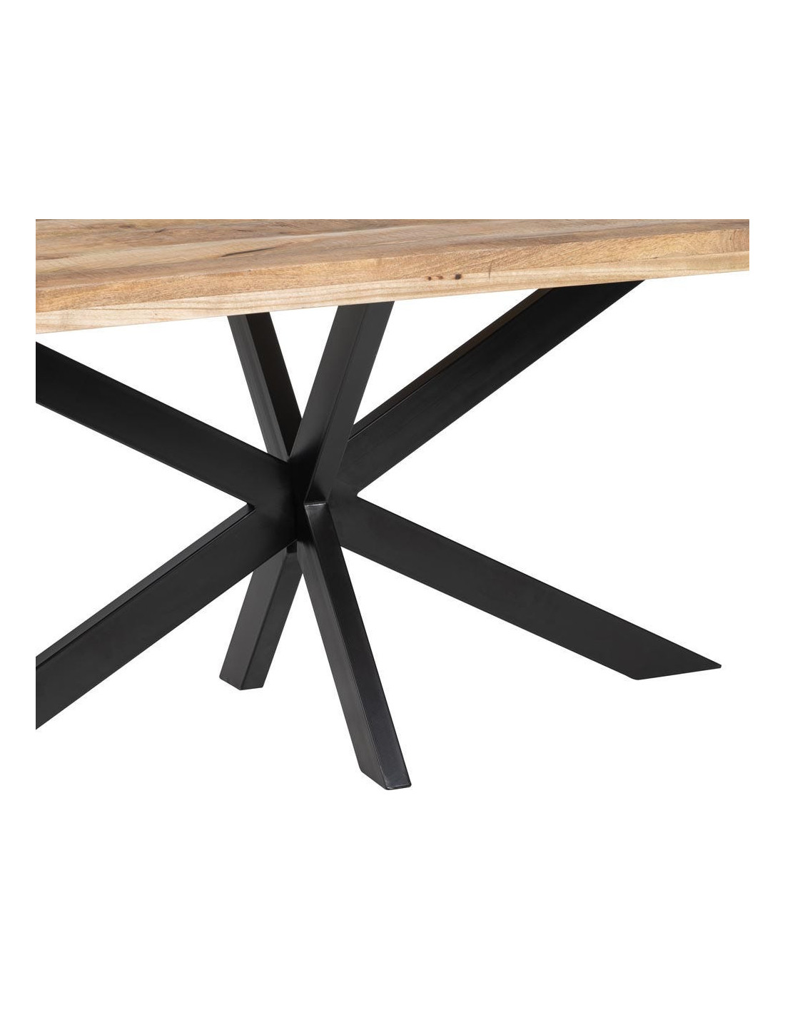 Le piètement en métal noir adopte une structure croisée qui attire immédiatement le regard. Il apporte un contraste visuel fort face au plateau en bois, tout en assurant une stabilité cohérente avec le format de la table. Cette base ne cherche pas à disparaître, elle participe pleinement à l’équilibre de l’ensemble. Elle donne une lecture contemporaine et structurée, sans surcharge visuelle.