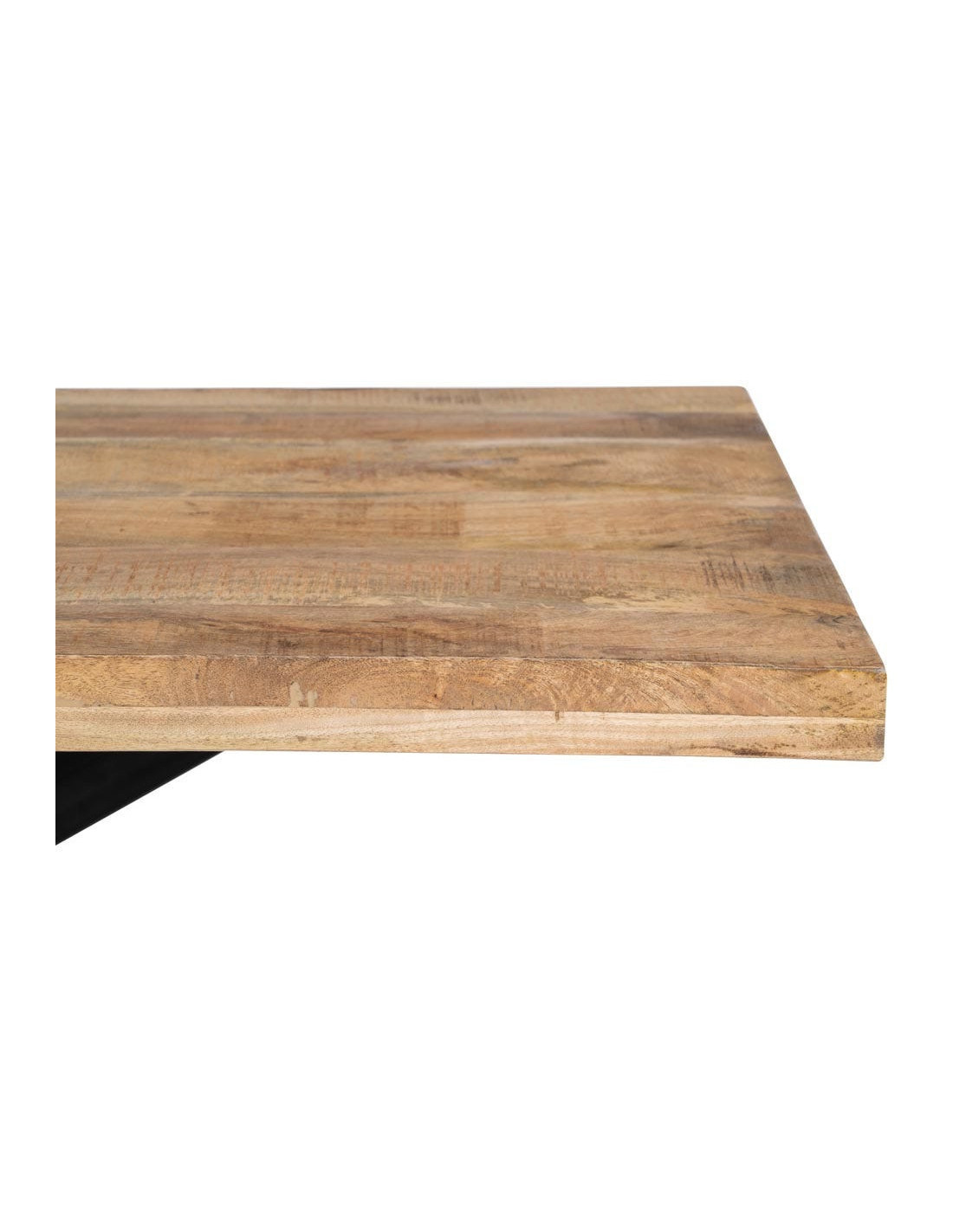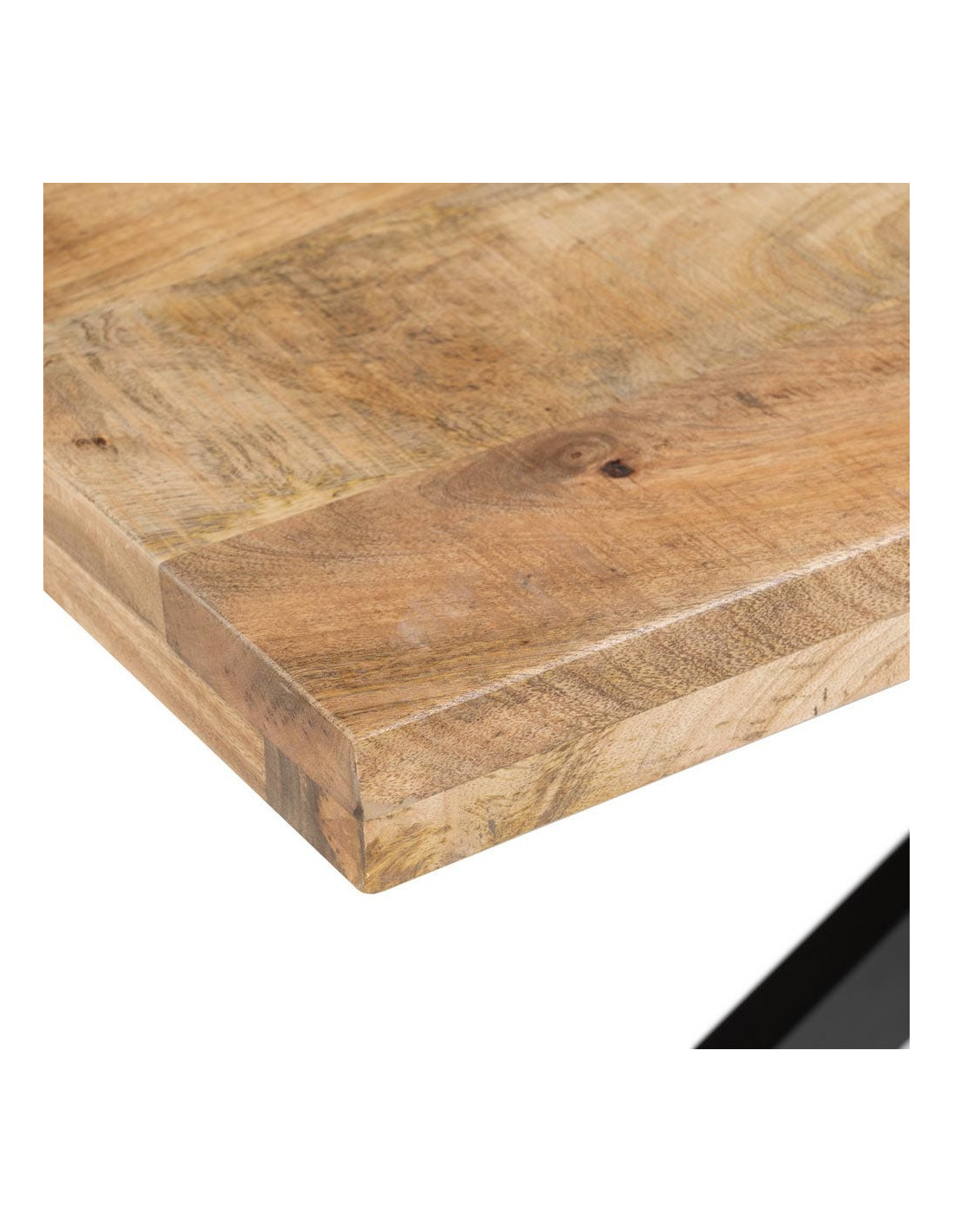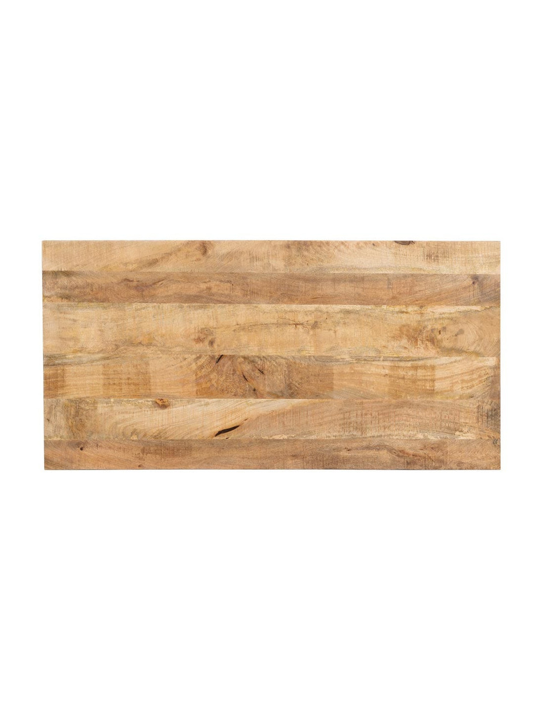 Plateau en bois de manguier massif avec surface pouvant présenter des irrégularités liées à sa fabrication. Piètement en métal noir.