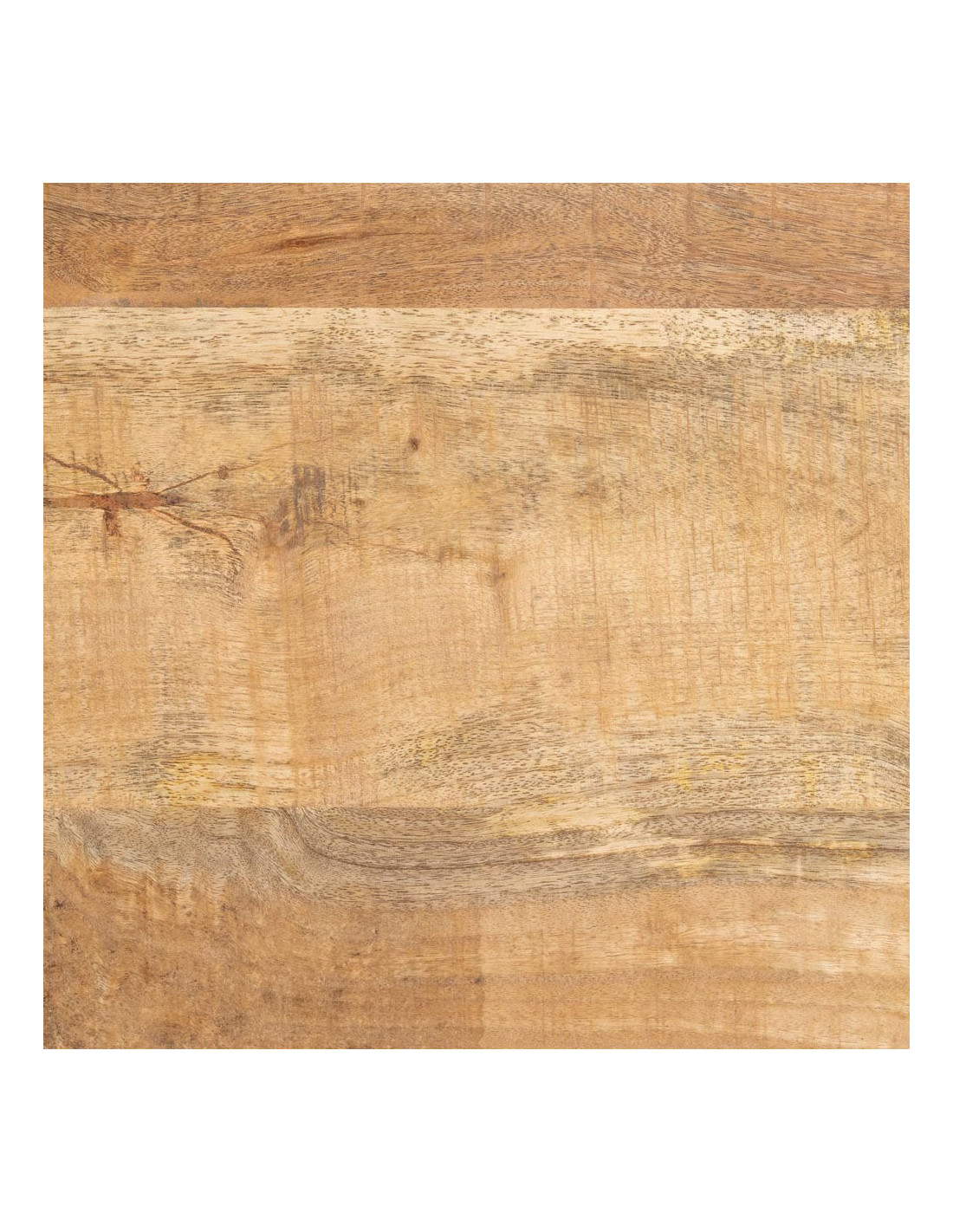 Le plateau révèle un bois aux variations visibles, avec des nuances allant du clair au plus soutenu. Les veines et les irrégularités témoignent d’une matière travaillée sans uniformisation excessive. La surface peut présenter de légères aspérités, renforçant l’authenticité de l’ensemble. L’épaisseur de 6 cm accentue cette perception de densité et donne du relief à la table. Chaque plateau possède une identité propre, liée à la nature même du bois.
