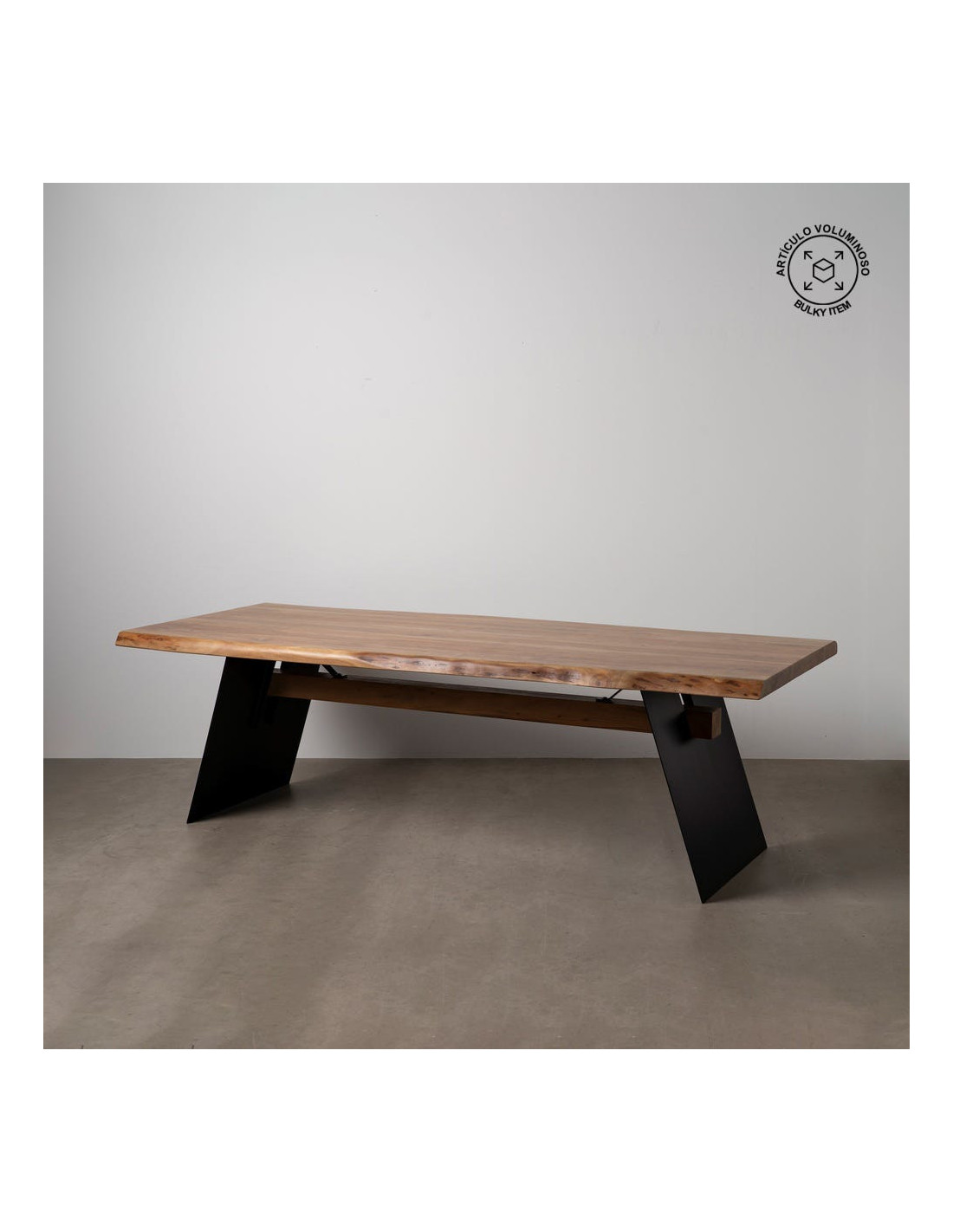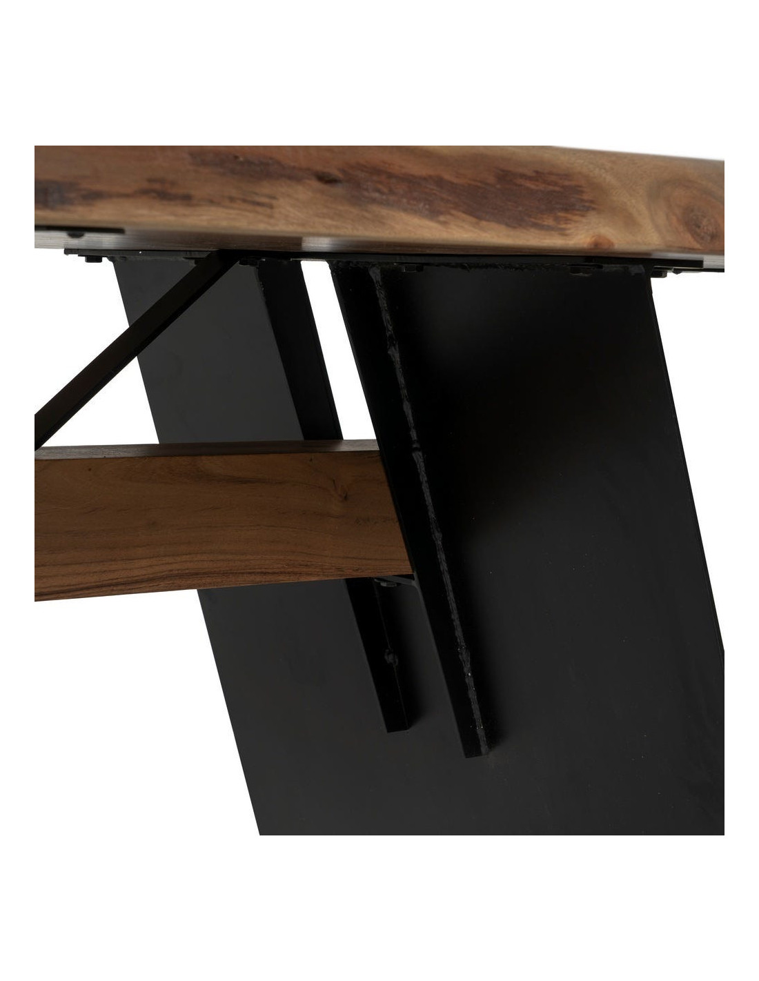 L’association du bois chaleureux et du métal noir crée un contraste équilibré. Cette table s’intègre parfaitement dans des univers contemporains, industriels ou plus bruts.