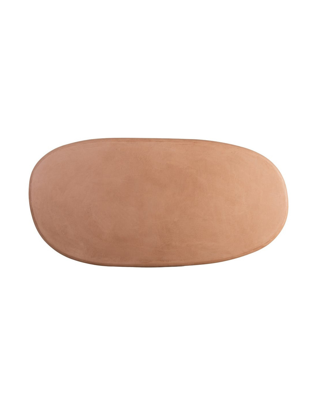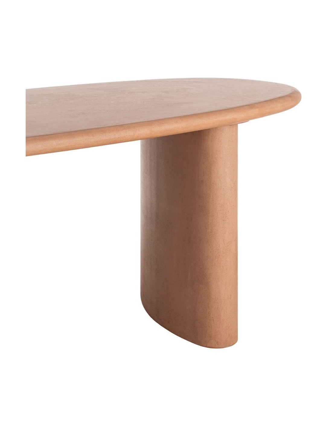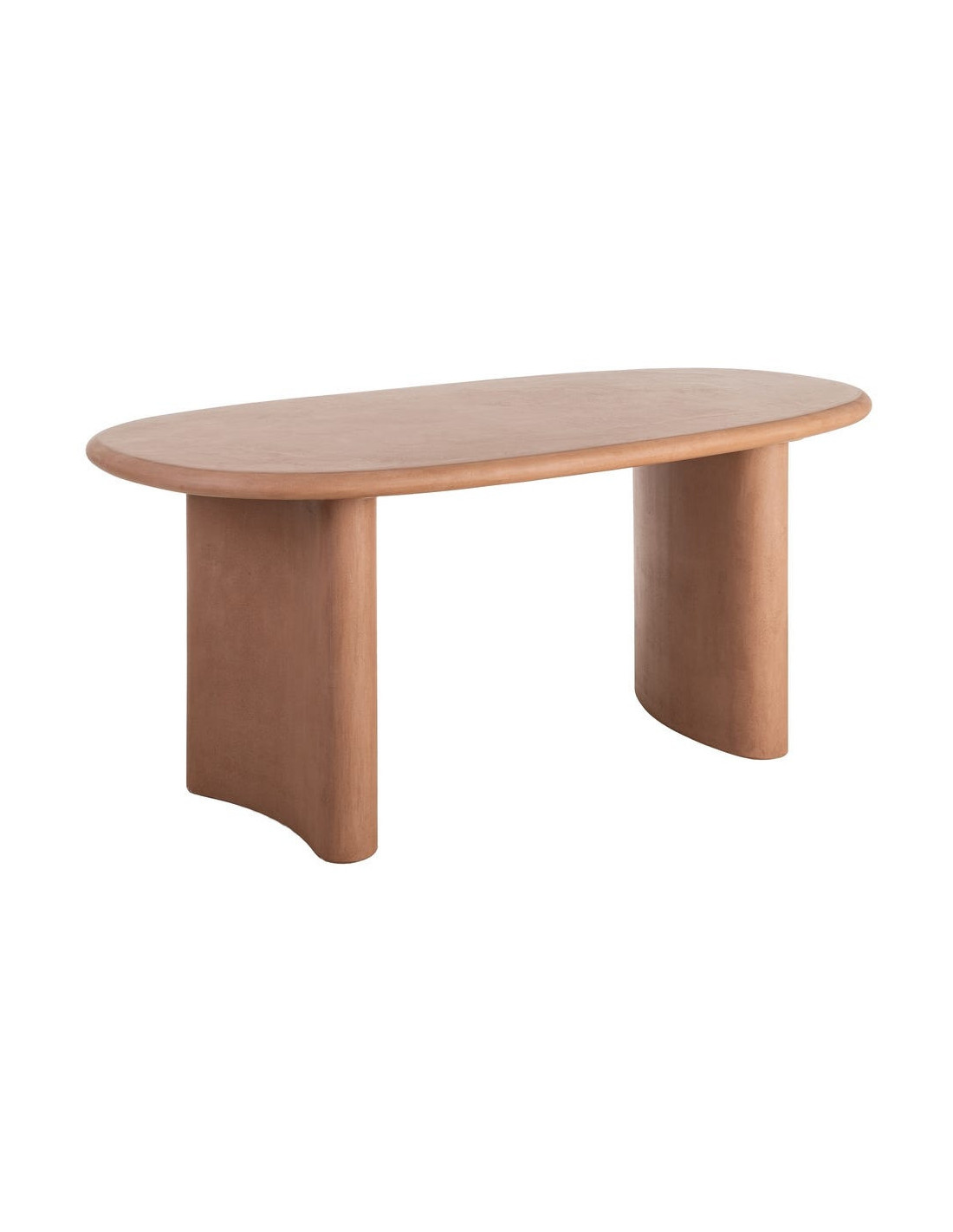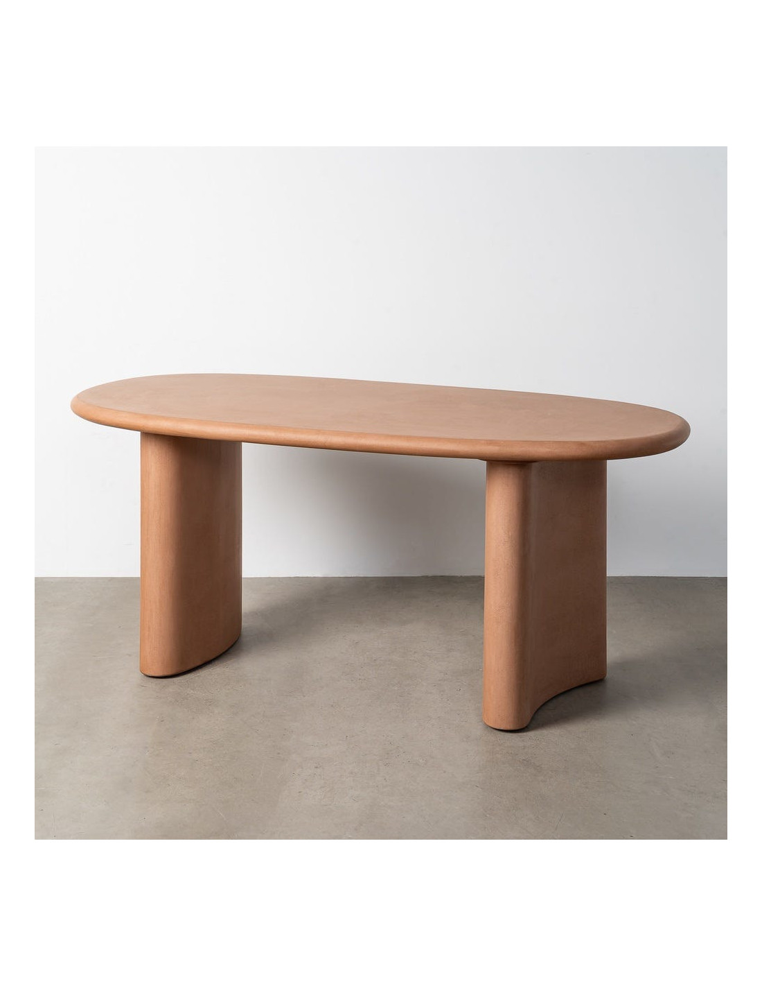 Une table à manger ovale aux lignes adoucies, portée par une finition microciment terracotta qui réchauffe instantanément l’espace.