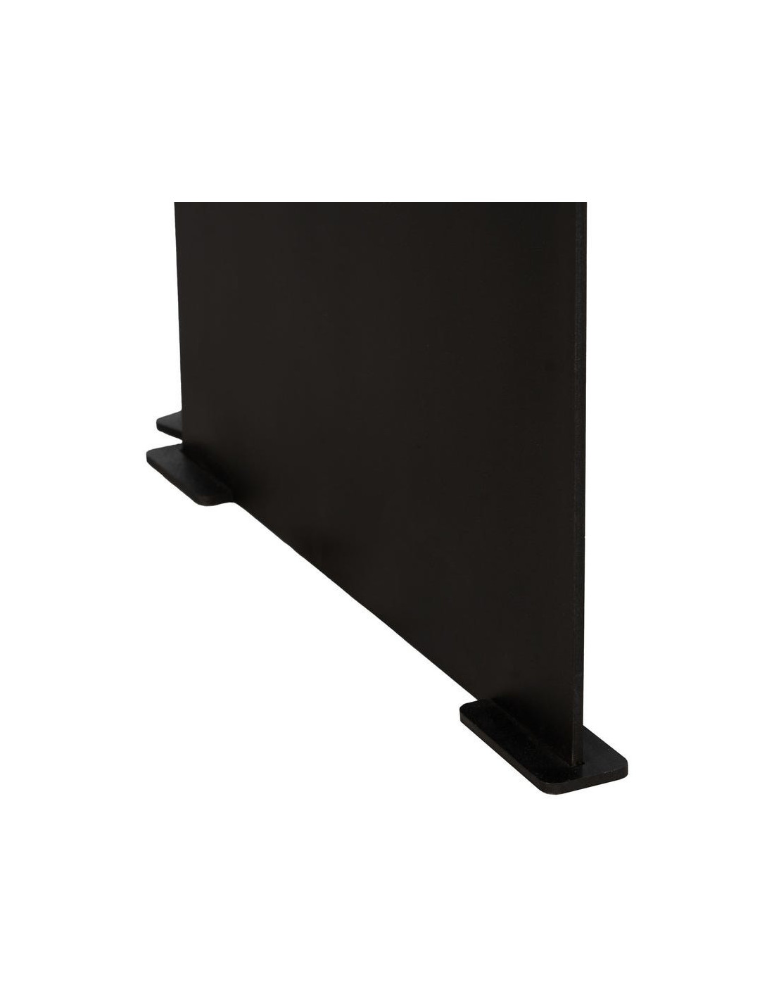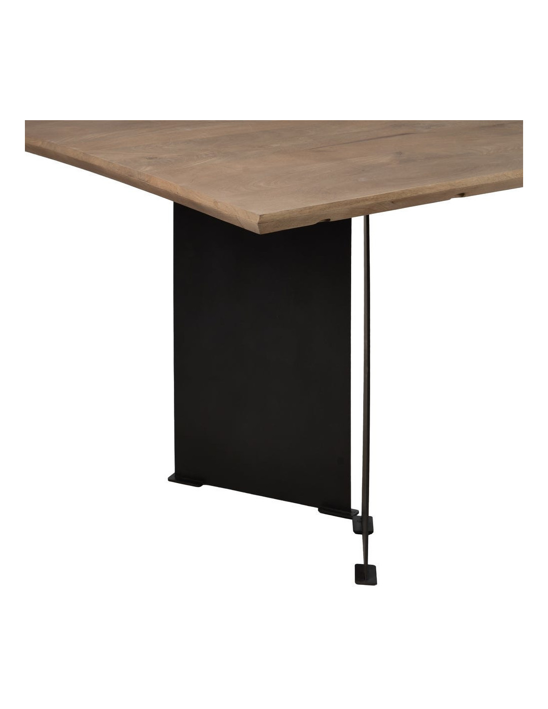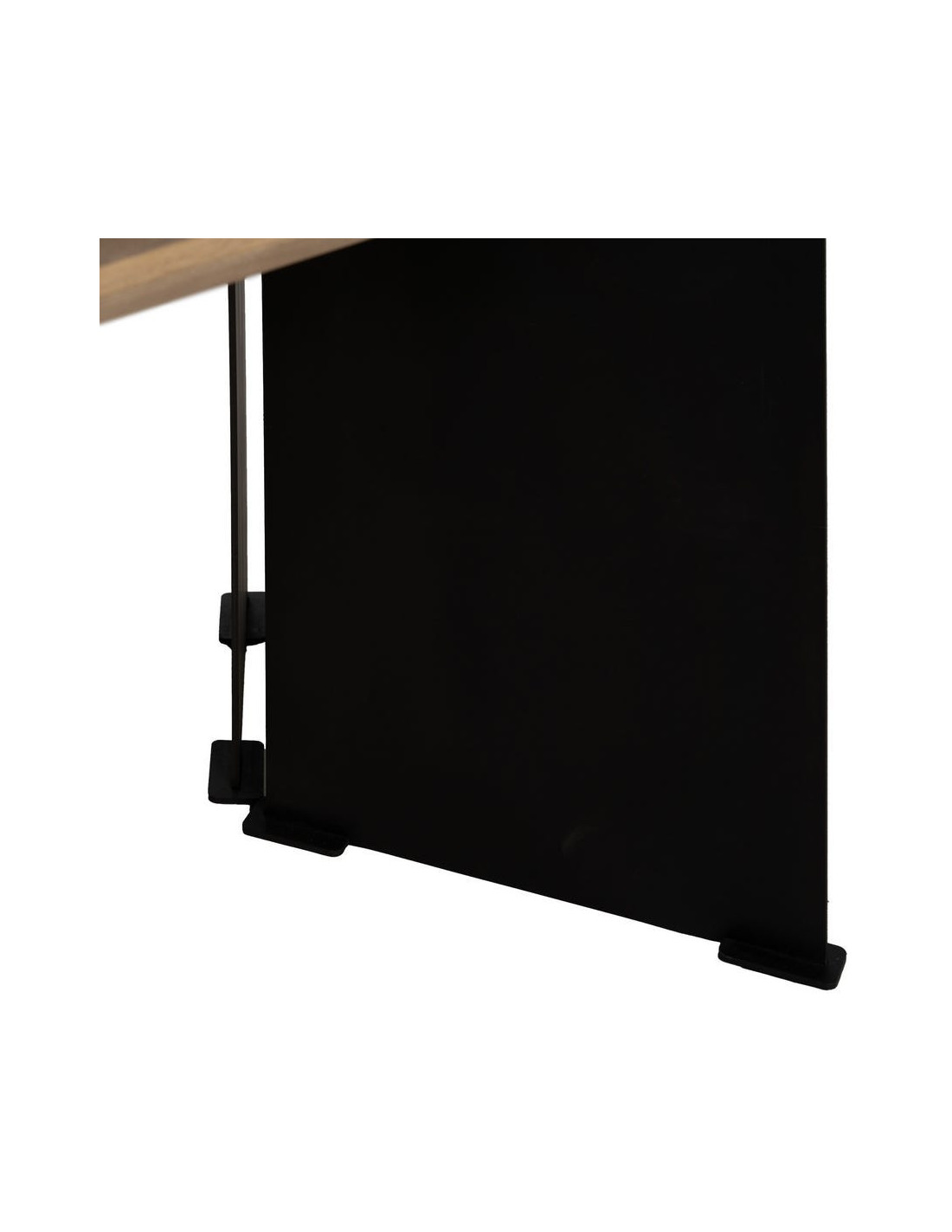 Les pieds en métal noir en panneaux pleins créent un contraste marqué avec le plateau en bois, apportant une dimension architecturale à l’ensemble.