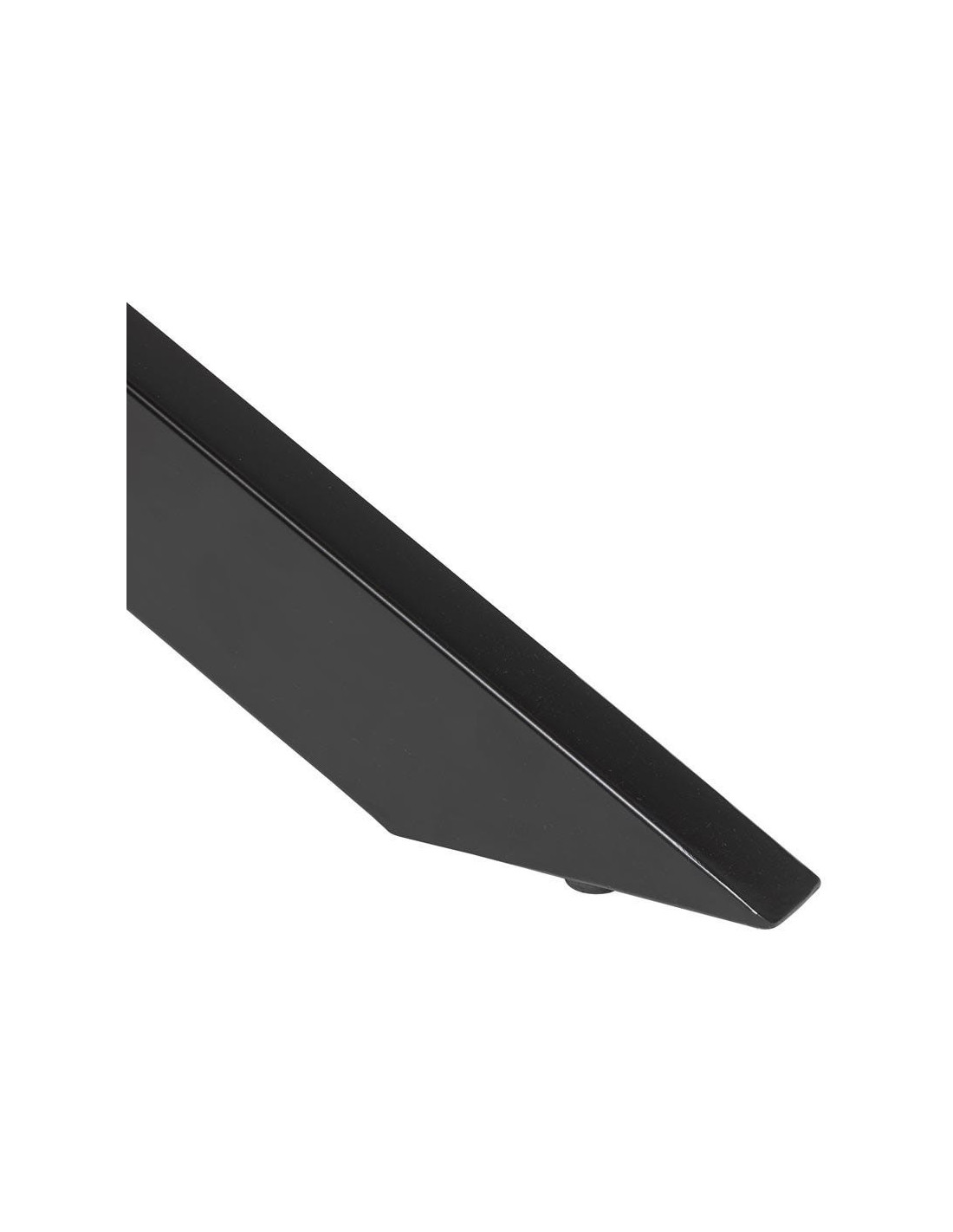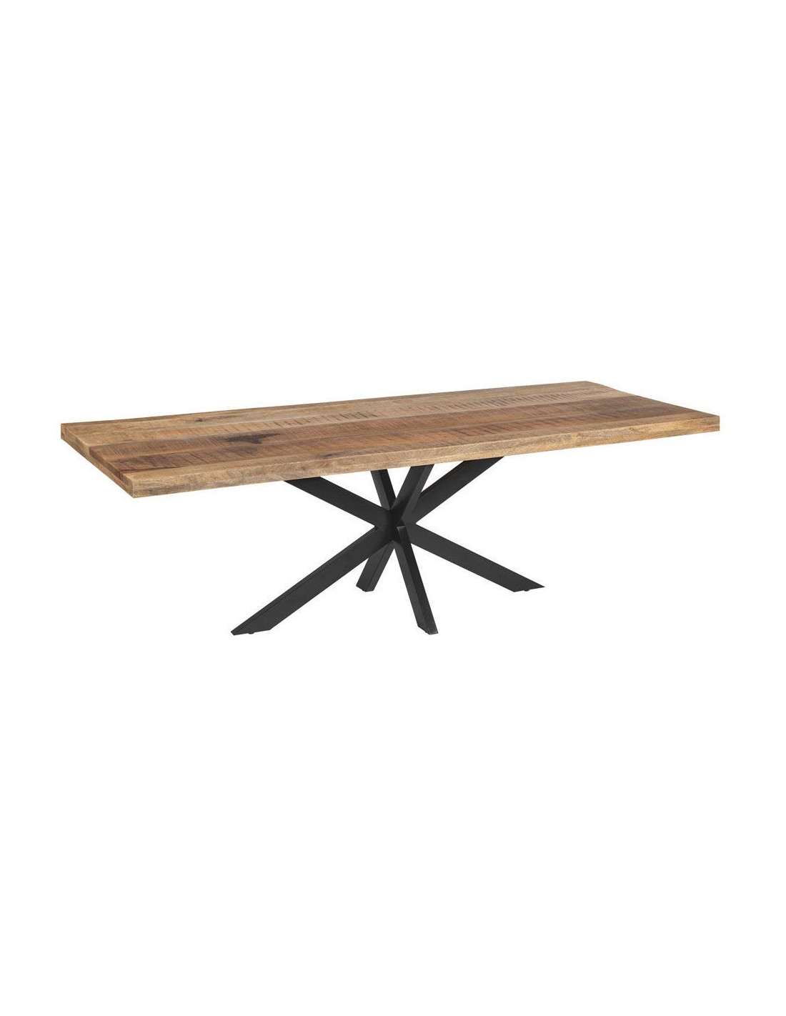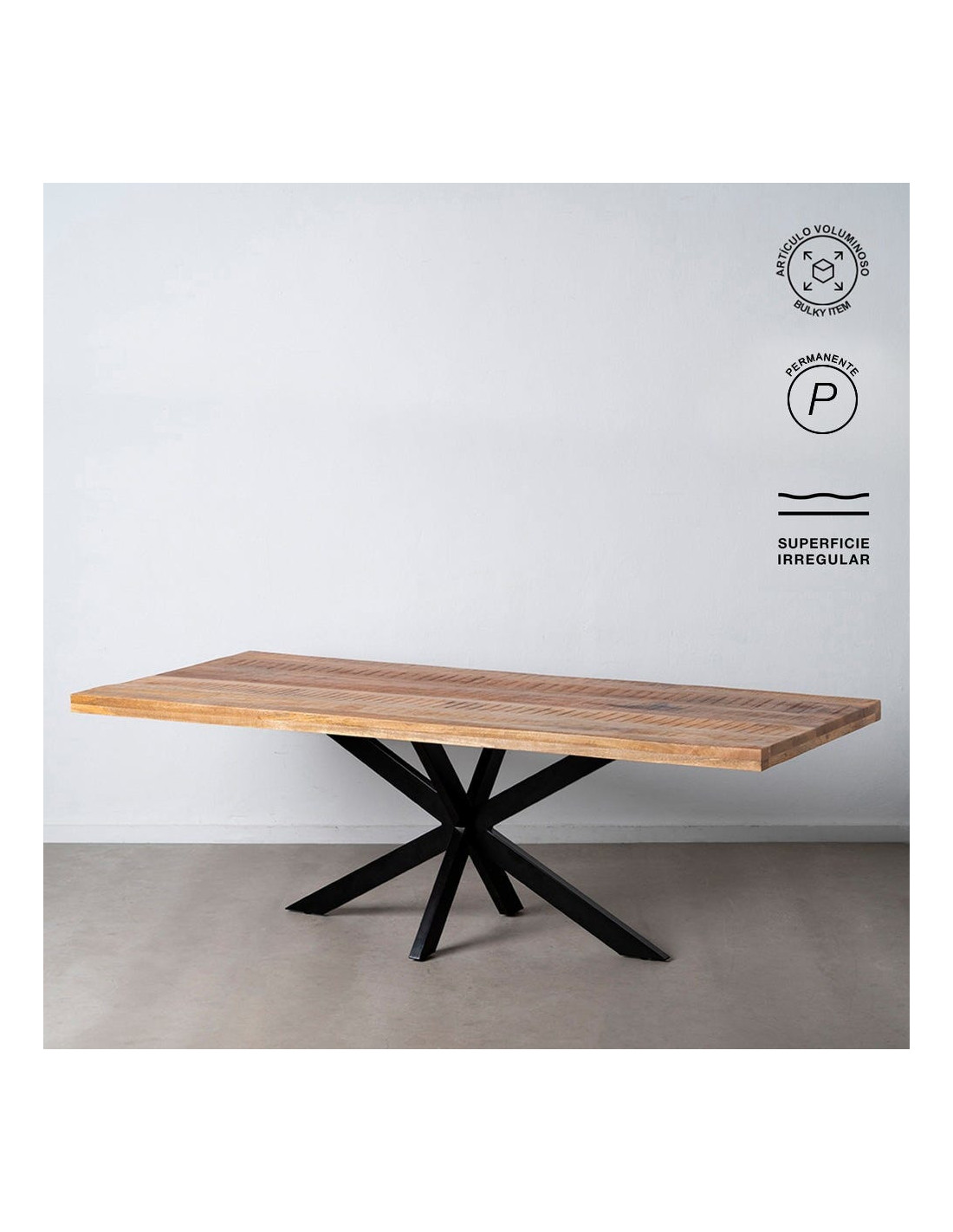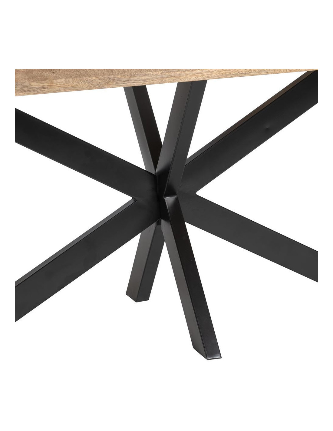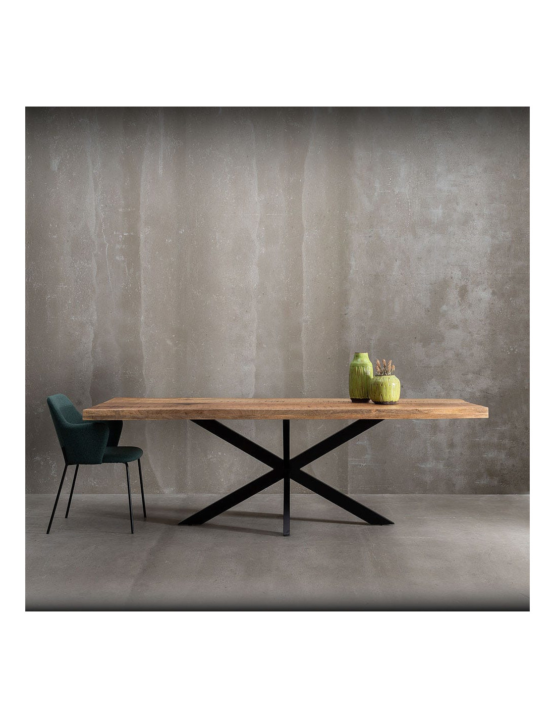 Le piètement en métal noir adopte une forme croisée qui capte immédiatement le regard. Il crée un contraste net avec la chaleur du bois tout en assurant une stabilité adaptée au format de la table. Cette base participe pleinement à l’identité visuelle de l’ensemble. Elle structure l’espace sans surcharge, avec une lecture claire et contemporaine. L’équilibre entre le plateau et le piètement reste constant, même dans un espace ouvert.