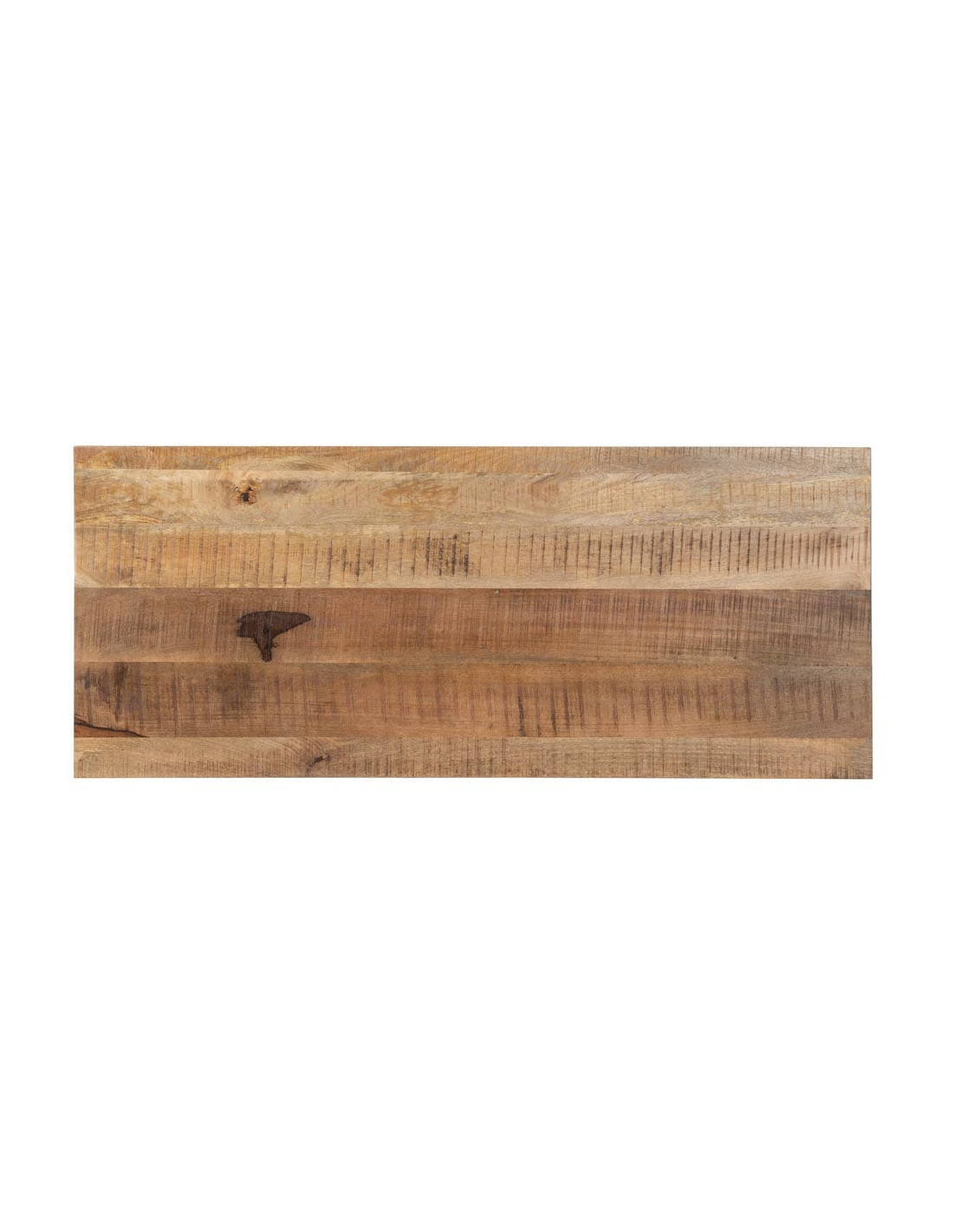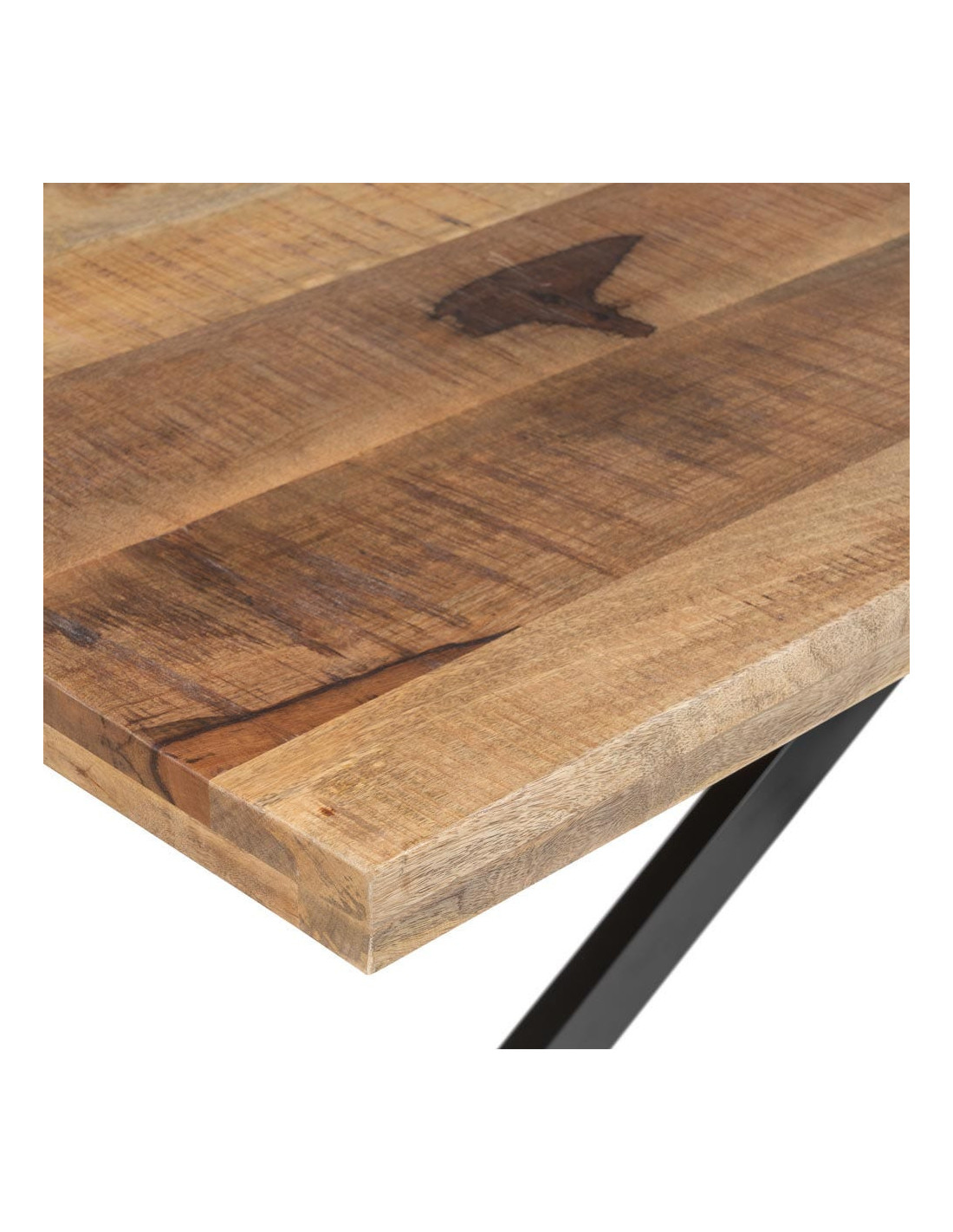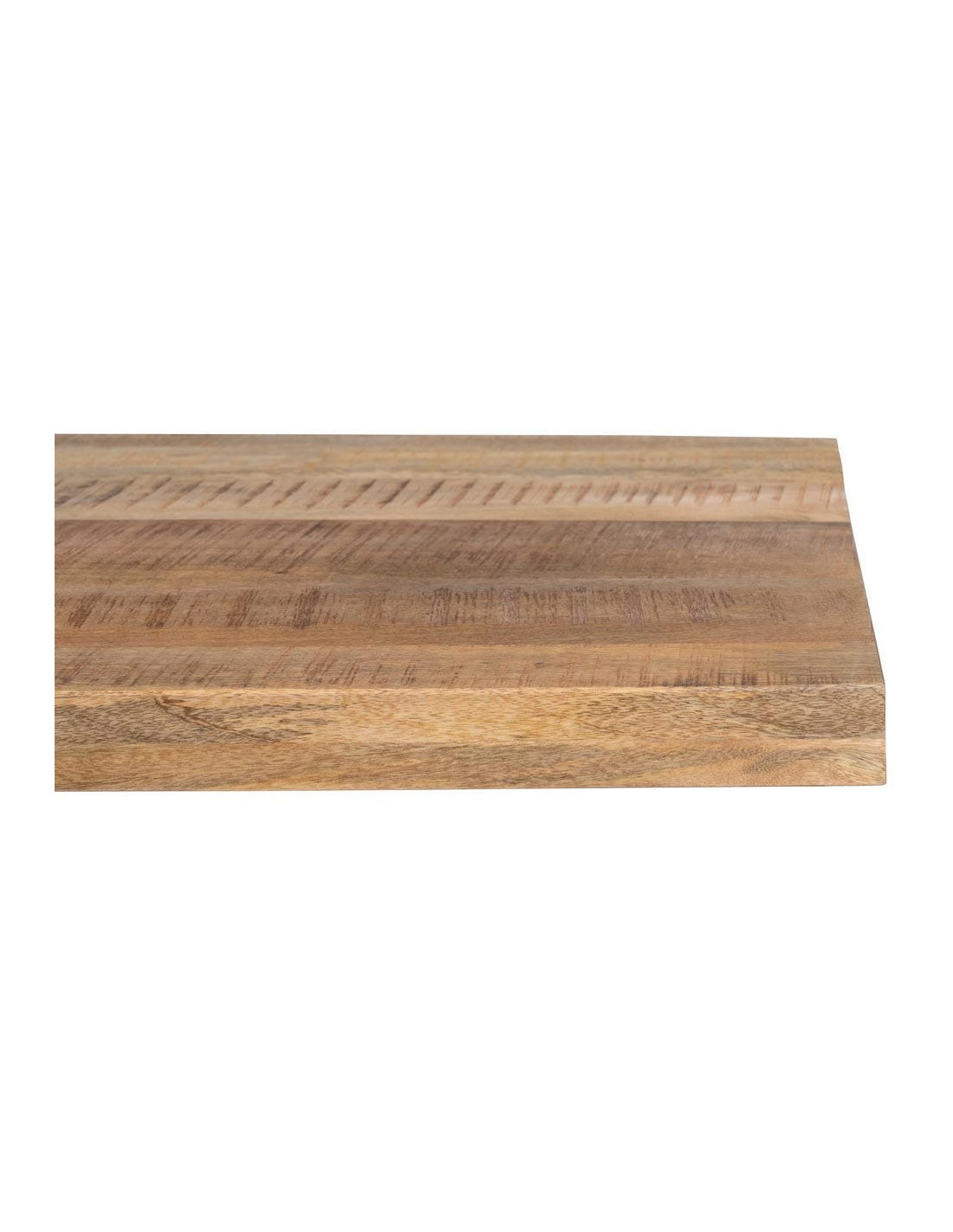 Plateau en bois de manguier massif avec surface pouvant présenter des irrégularités liées à sa fabrication. Piètement en métal noir.