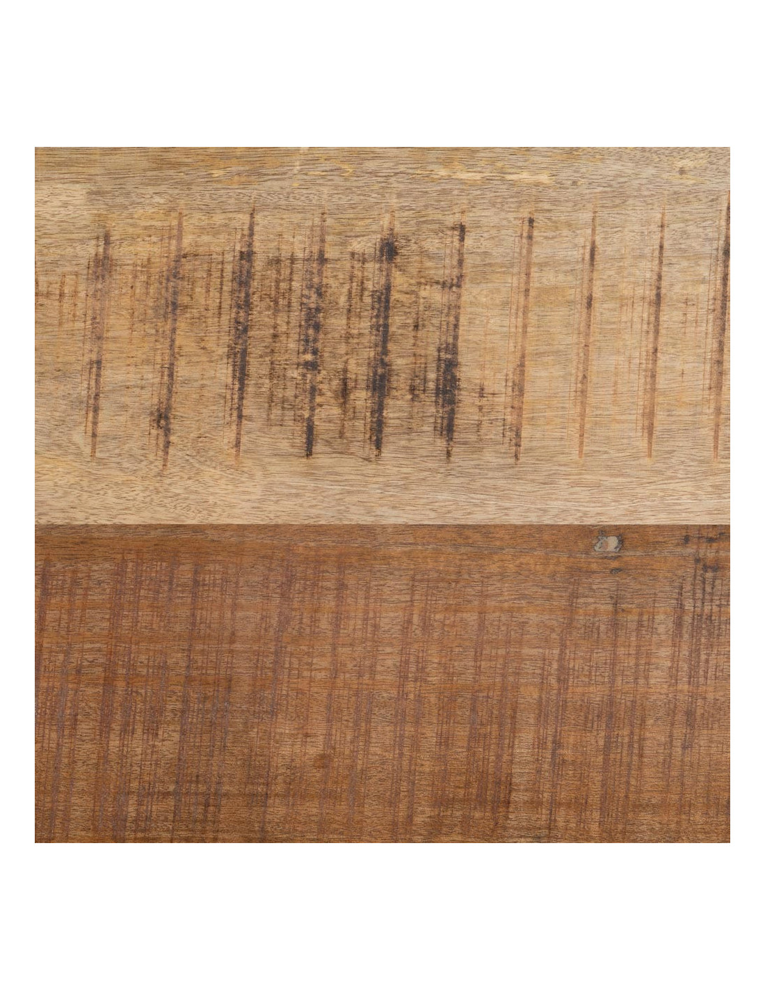 Le plateau présente des variations naturelles qui rendent chaque pièce unique. Les nuances de bois oscillent entre tons clairs et plus soutenus, créant une surface riche visuellement. La matière conserve une certaine irrégularité, perceptible dans le grain et les légères aspérités. L’épaisseur de 6 cm accentue la perception de solidité et renforce la présence du plateau. Ce bois ne cherche pas l’uniformité, il assume son caractère brut et évolutif.