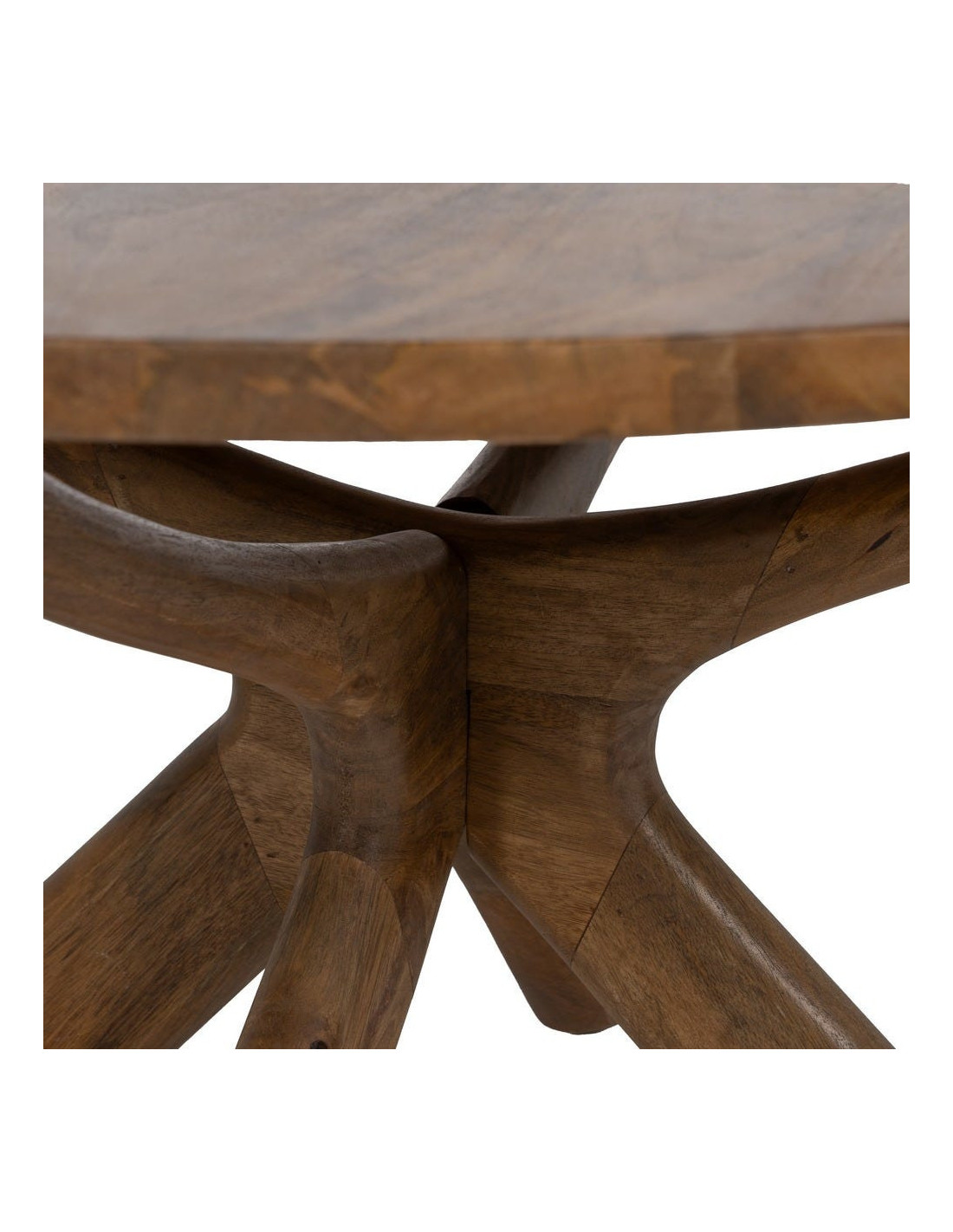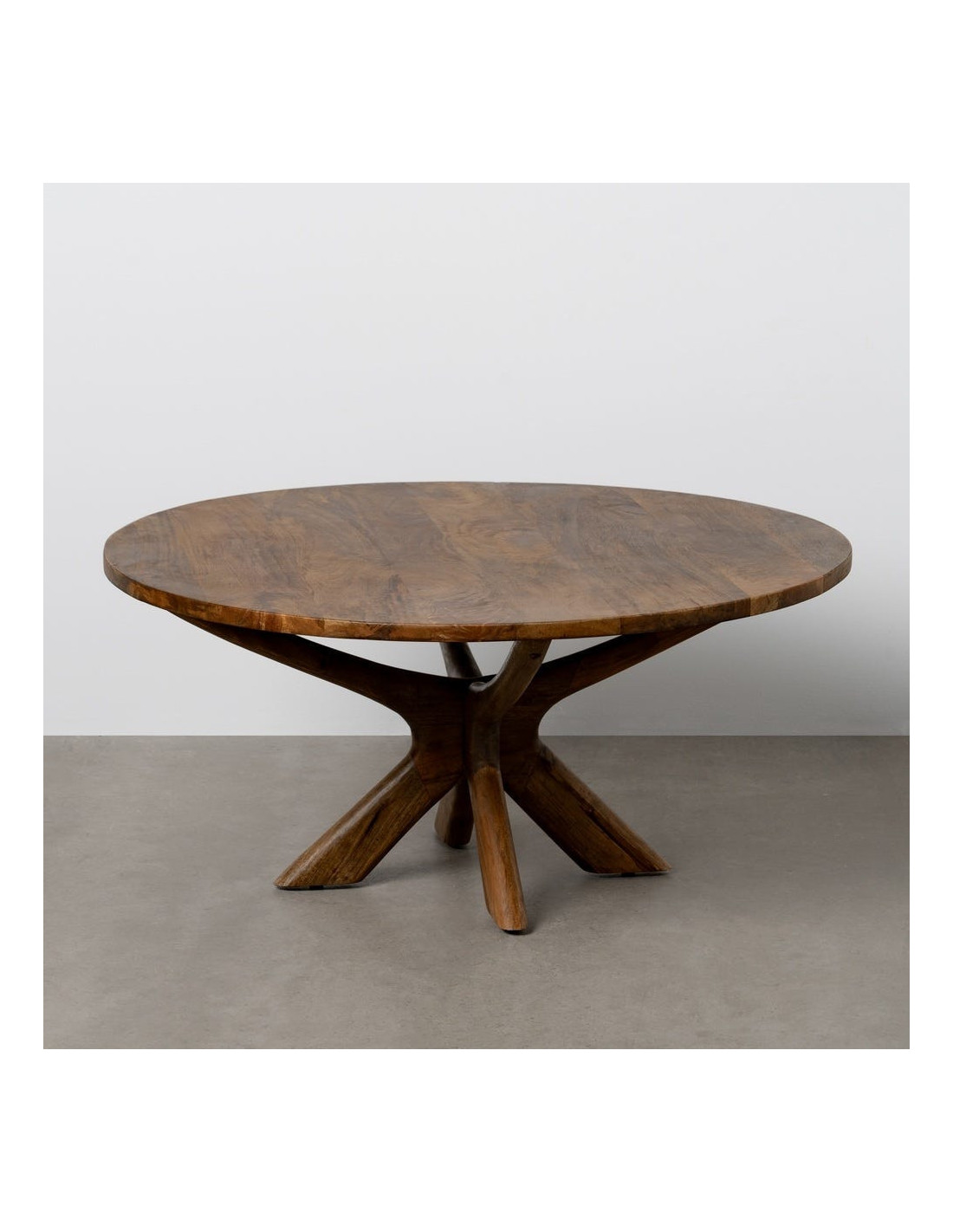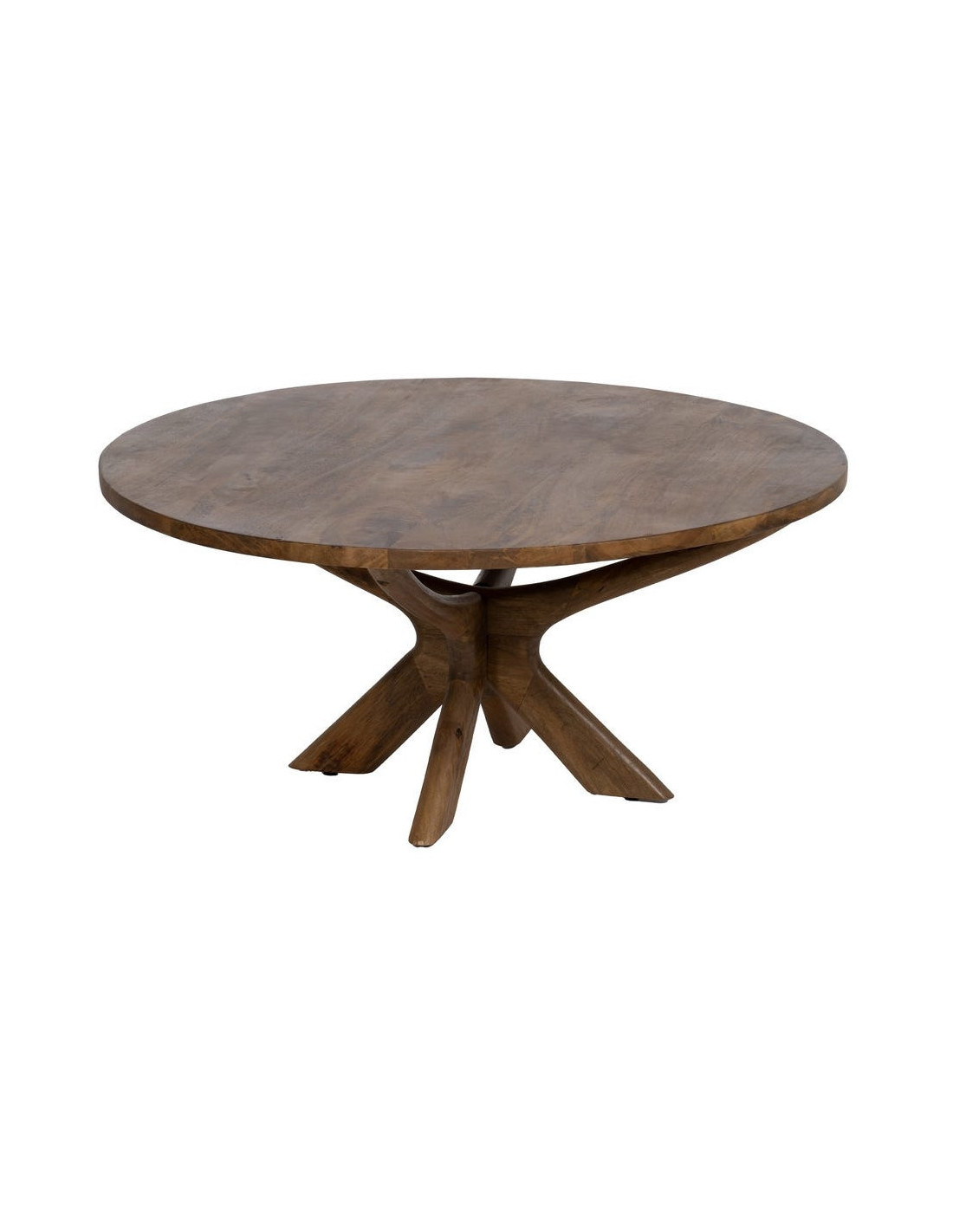 Avec son diamètre généreux de 100 cm, la table basse Zorvana transforme immédiatement l’équilibre du salon. Elle ne se contente pas d’accompagner l’espace, elle le structure. Son plateau large en bois de manguier marron dévoile un veinage vivant, presque graphique, qui capte la lumière et donne de la profondeur à l’ensemble.