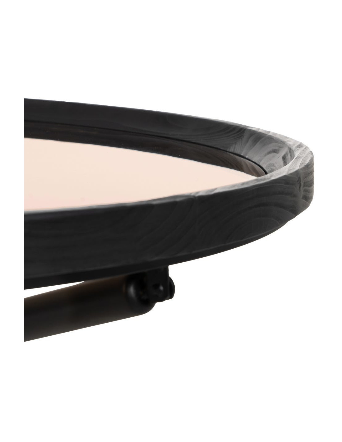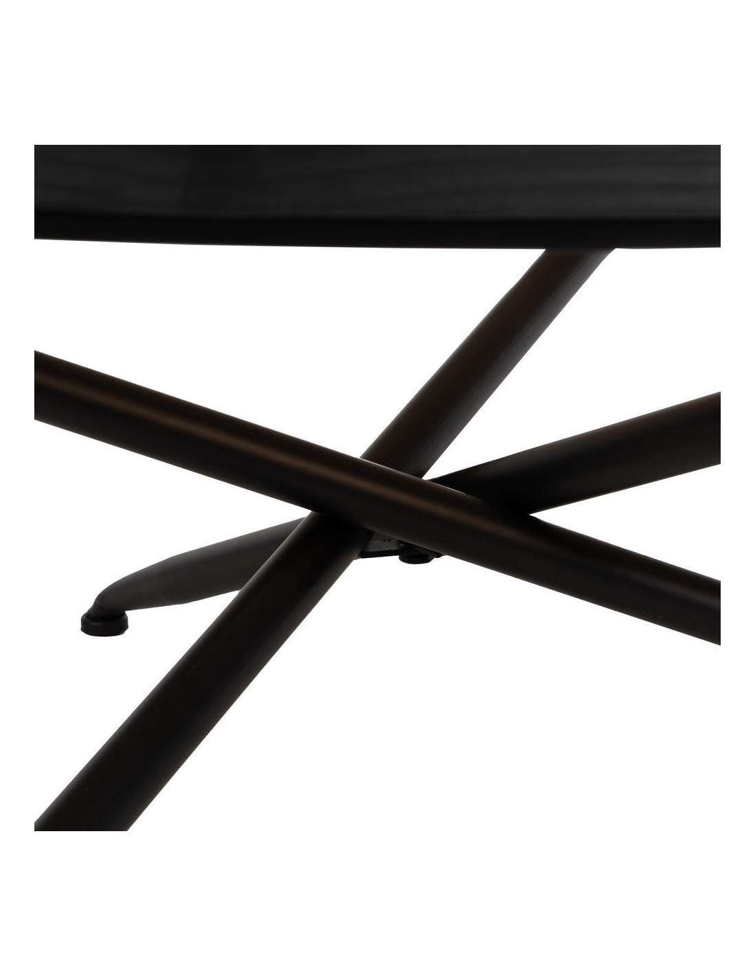 Le verre trempé offre une bonne résistance de surface et un rendu net. Le cerclage en bois noir souligne le plateau et cadre la transparence. Le piètement croisé donne un dessin graphique lisible.
