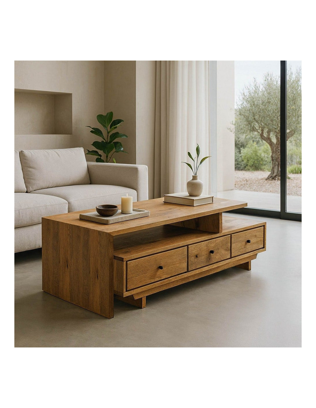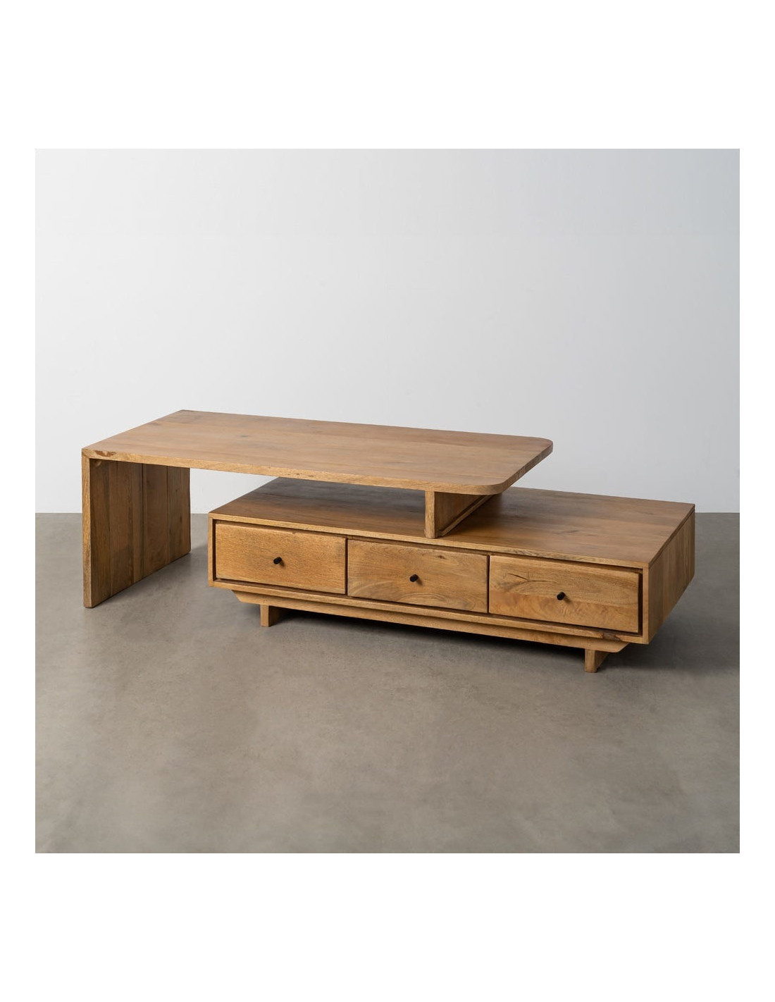 Grande Table basse japandi modulable Rectangulaire 3 tiroirs 2 niveaux en Bois de manguier Naturel Lavian