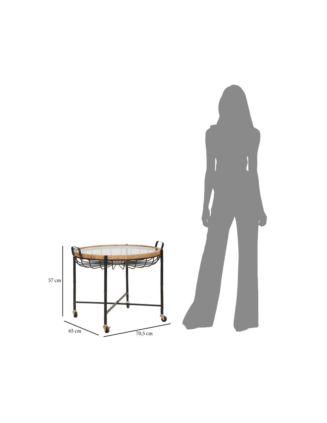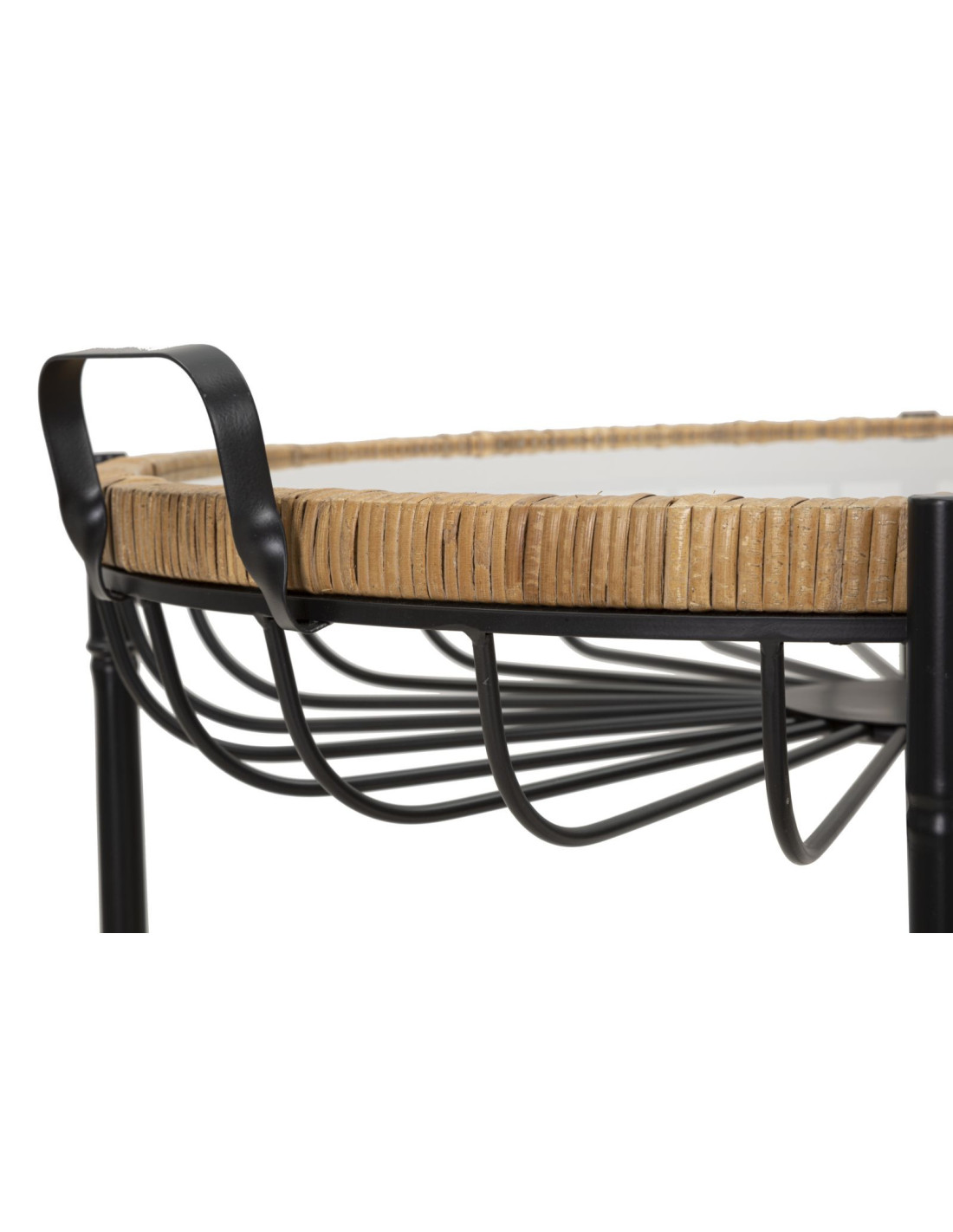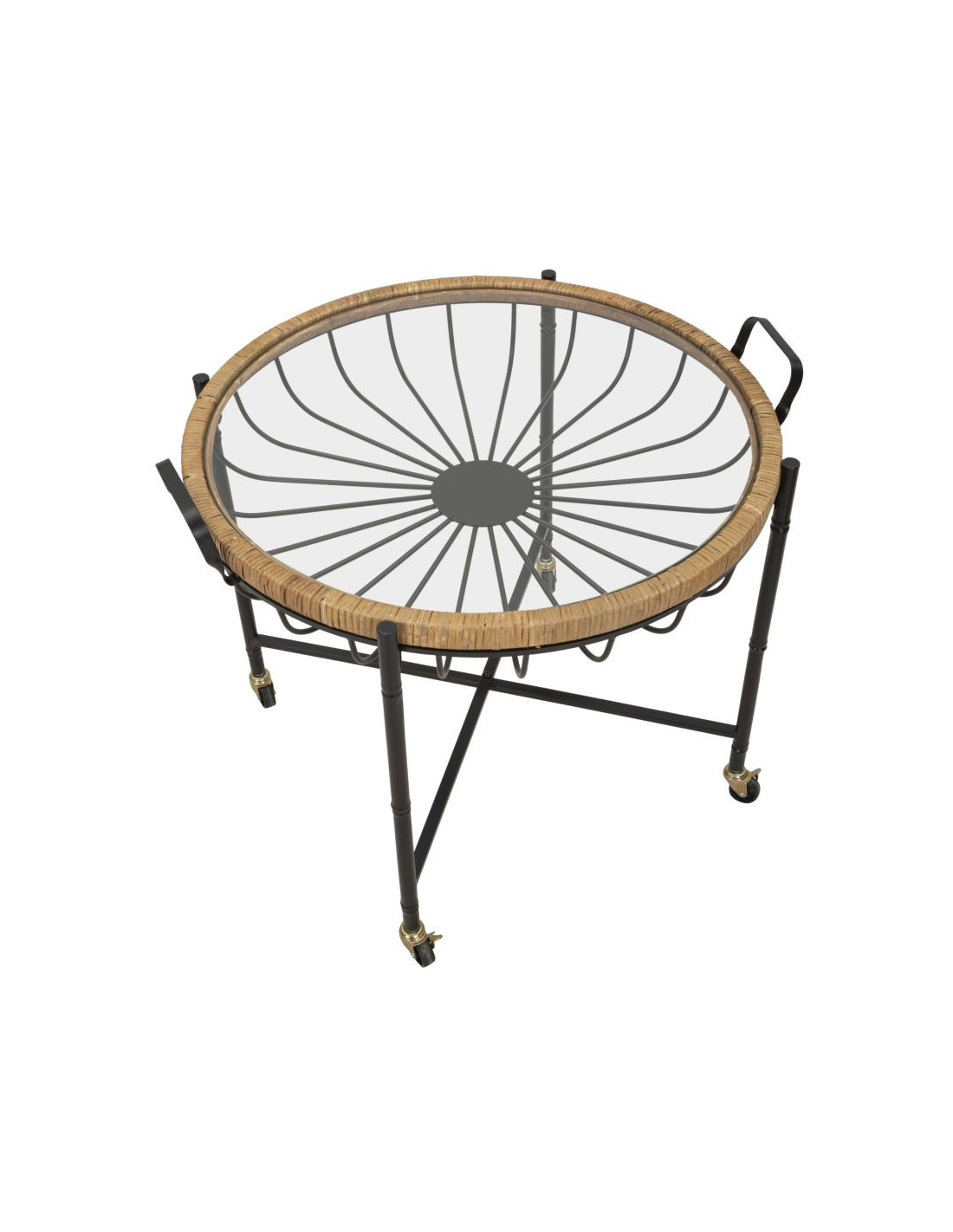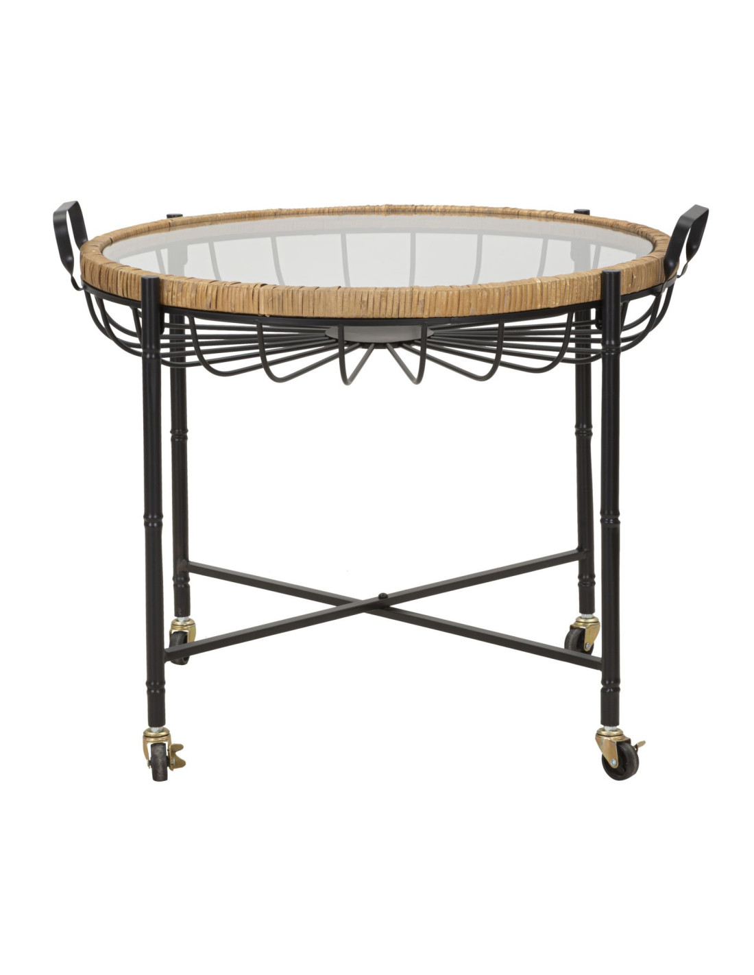 Grande Table d'appoint avec roues bohème chic Ronde Verre Transparent Rotin Naturel Tressé Métal Noir Cebu