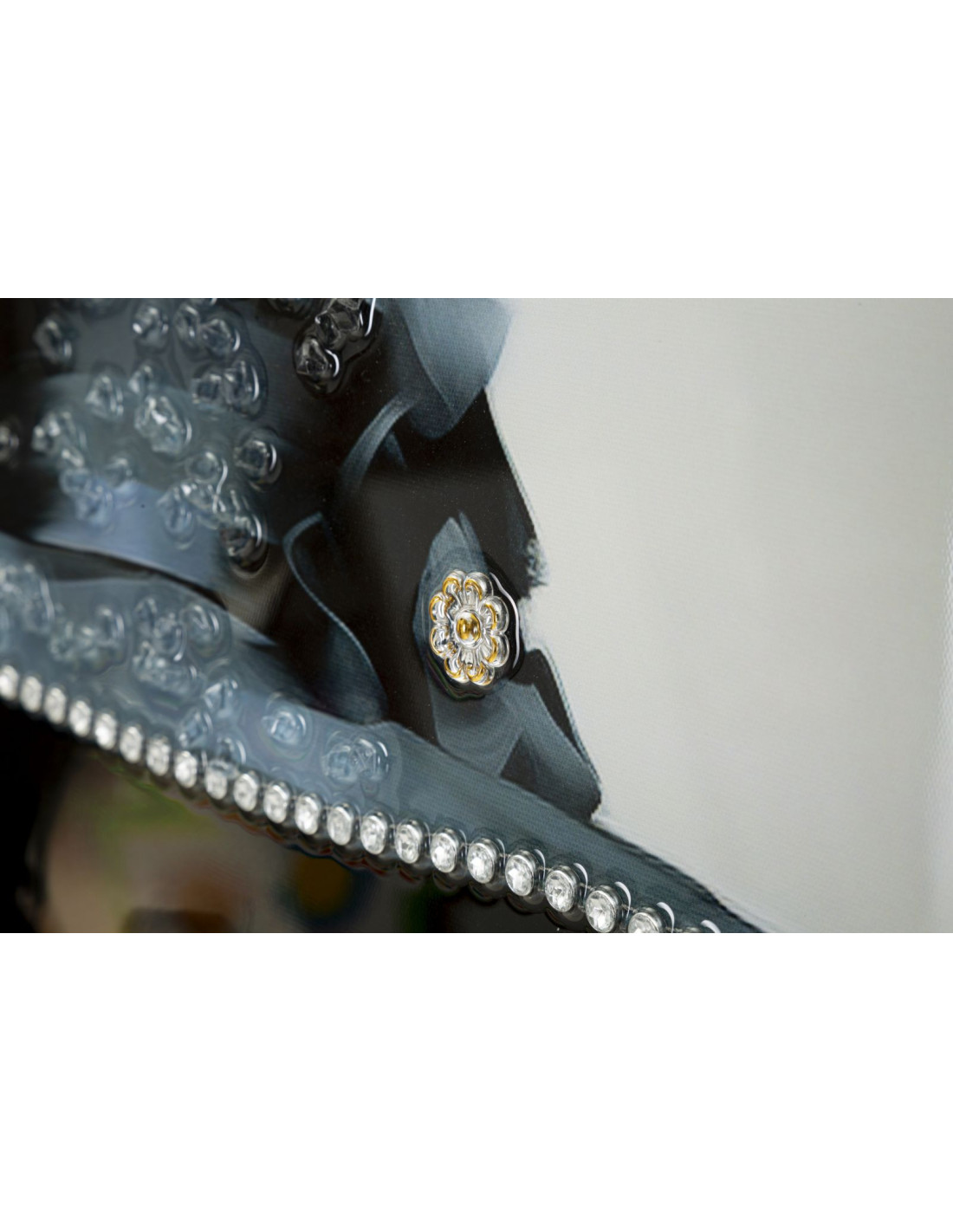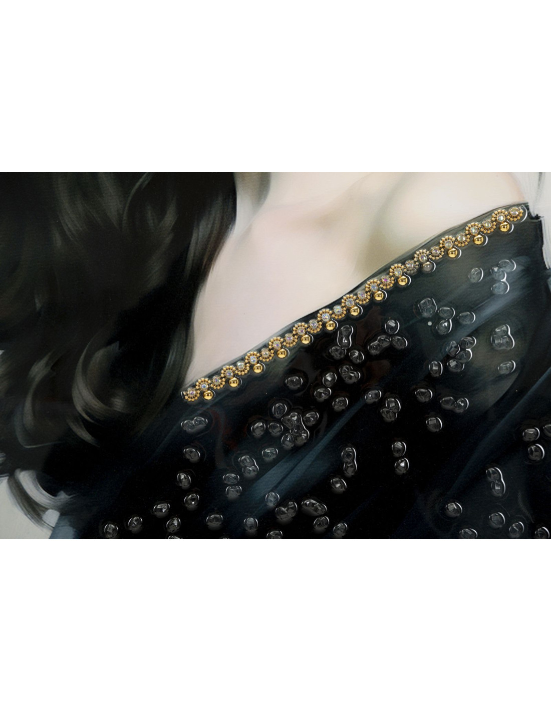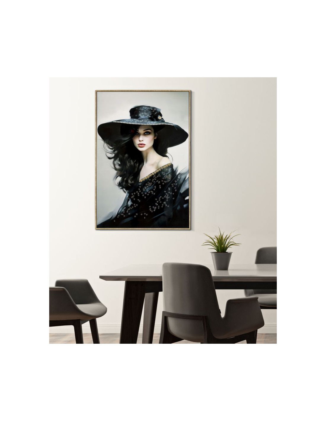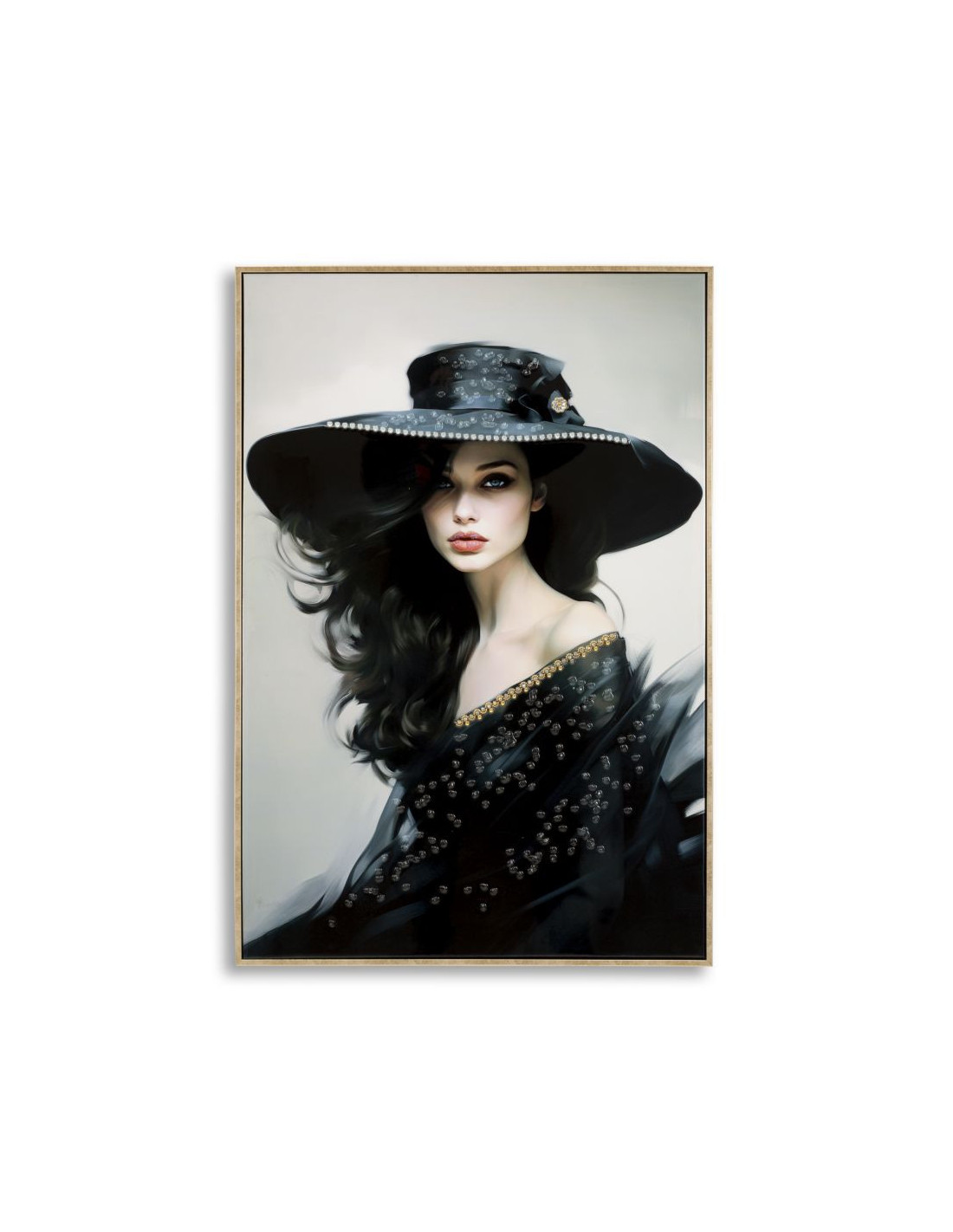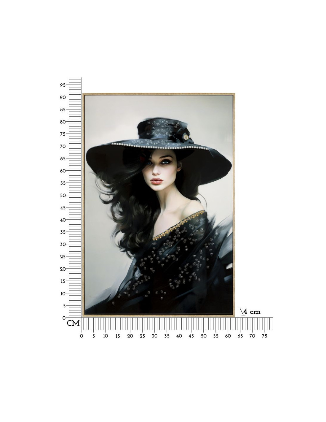 Grande toile murale peinte Femme chapeau noir 62x92 avec cadre doré Dori