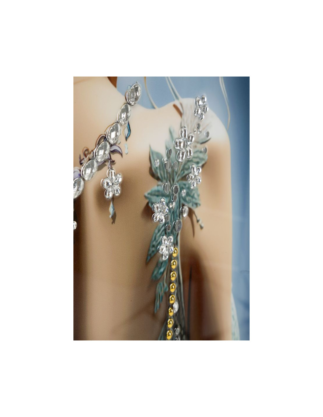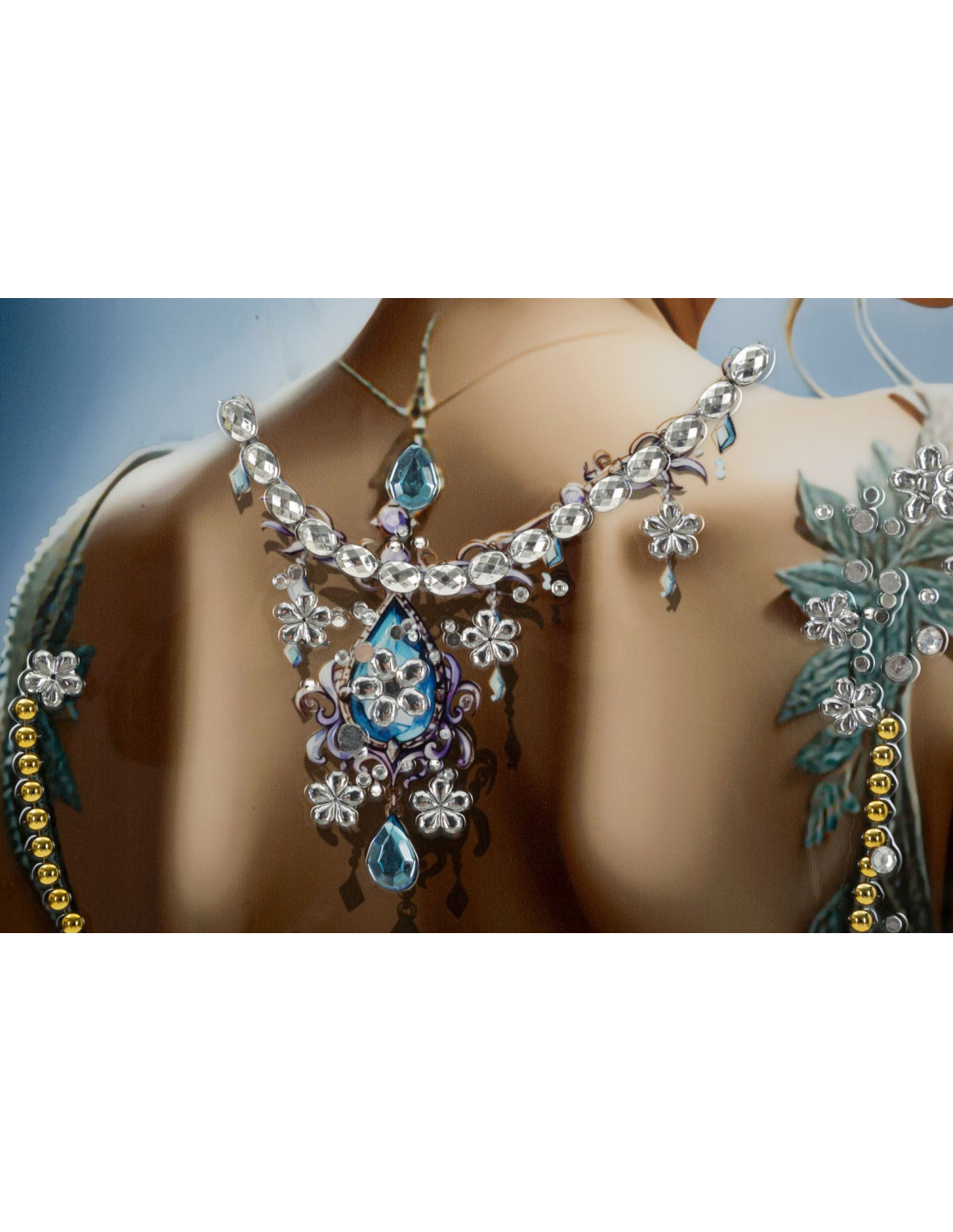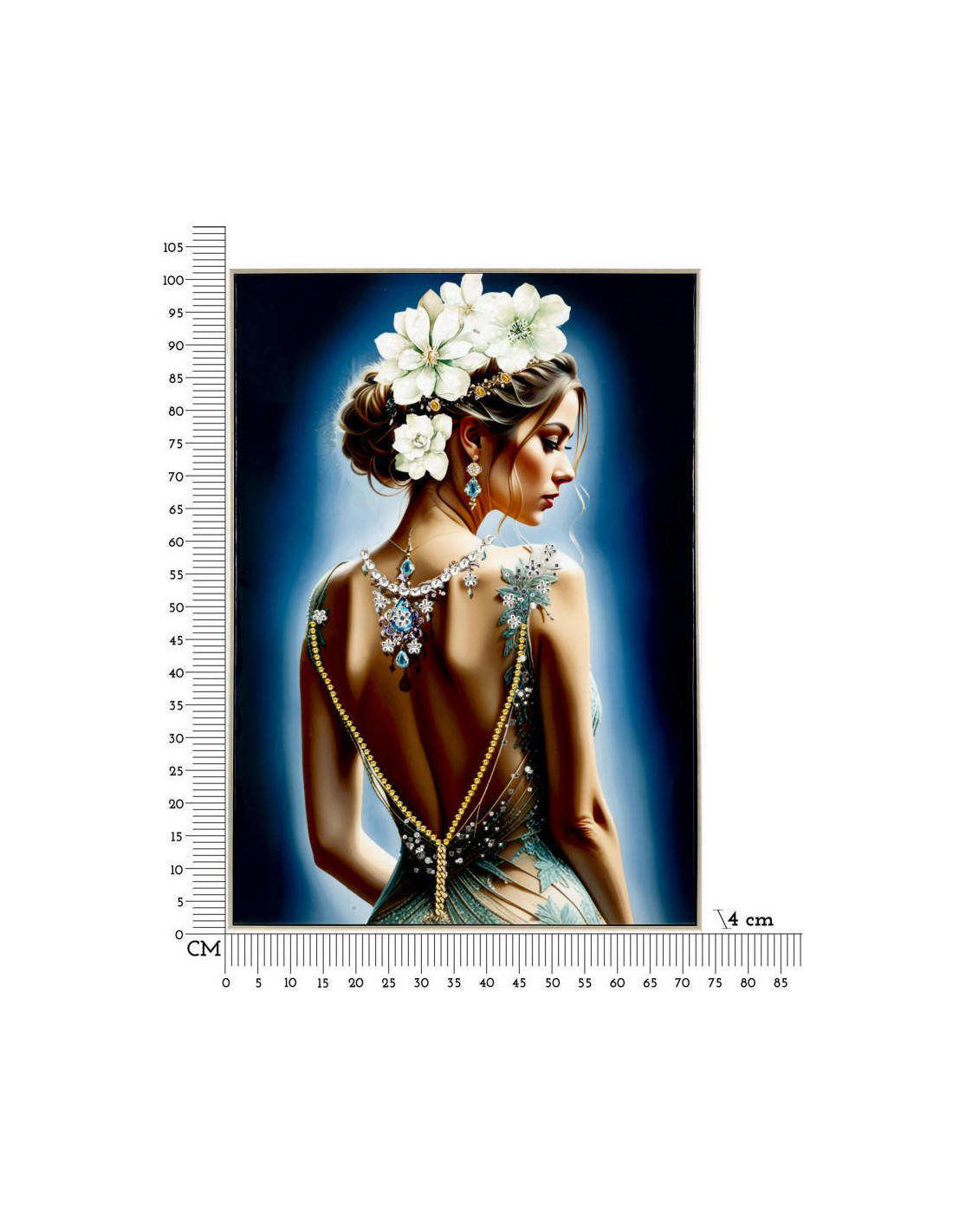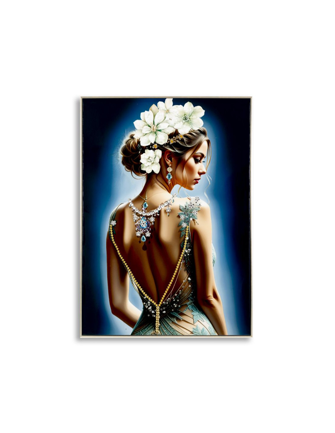 Grande toile murale peinte Femme dos bijoux fleurs blanches 72x102 avec cadre argenté Isabel