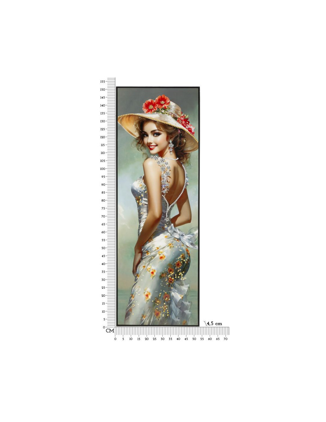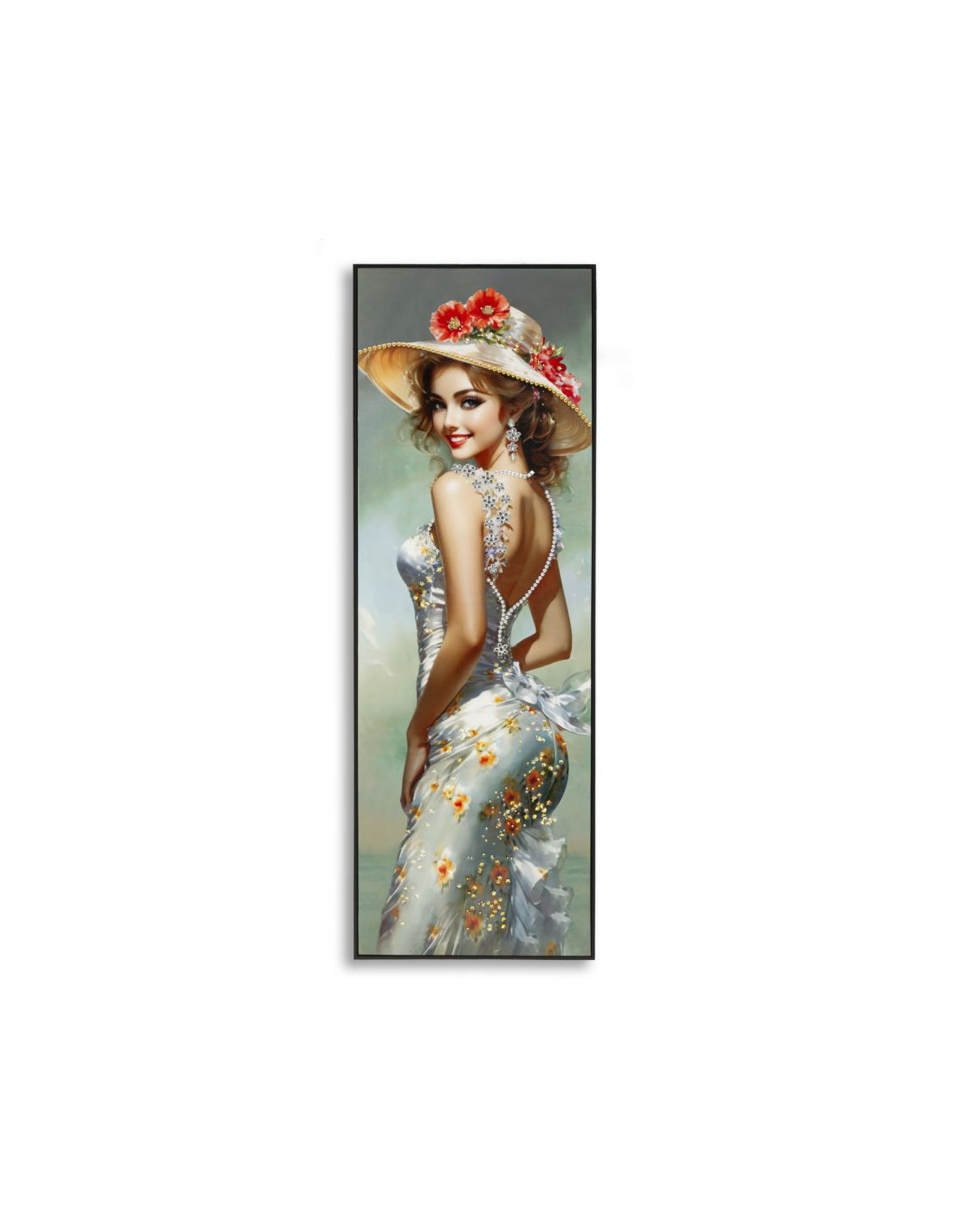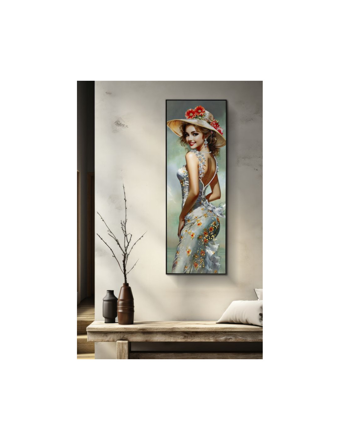 Grande toile murale peinte Femme élégante robe grise fleurs orange 52x152 avec cadre noir Elegant