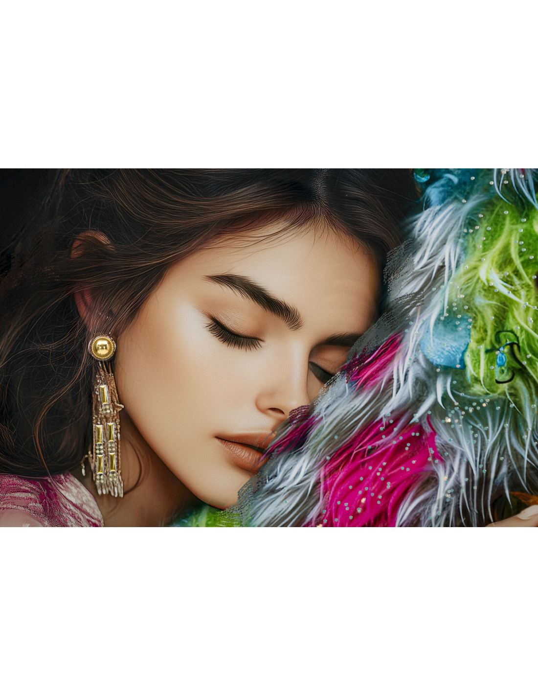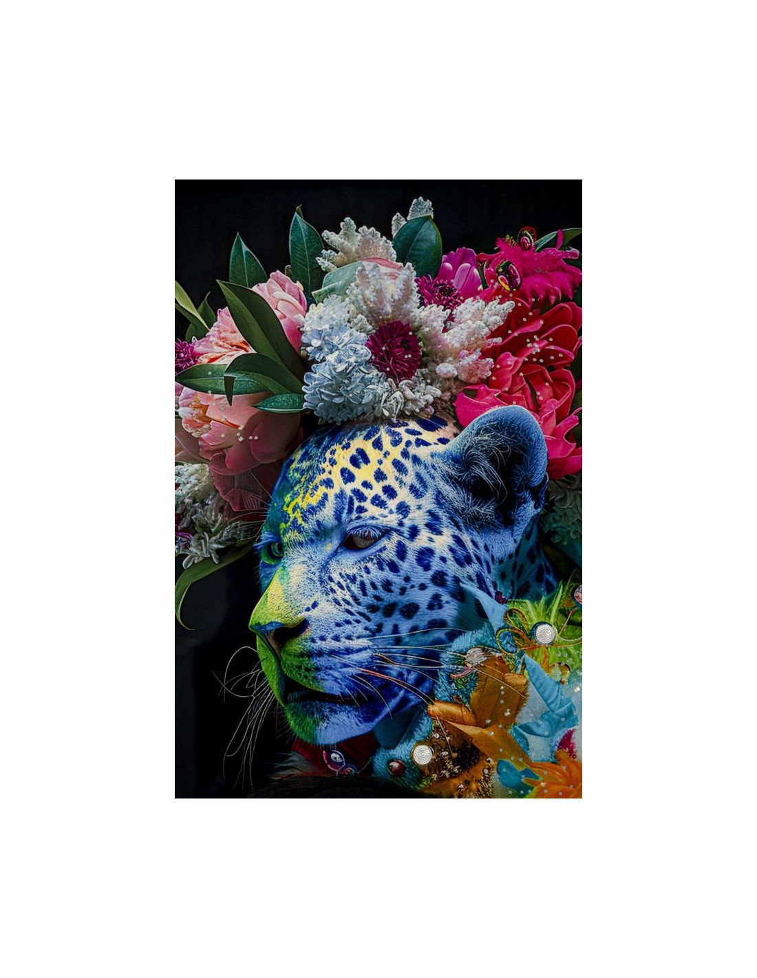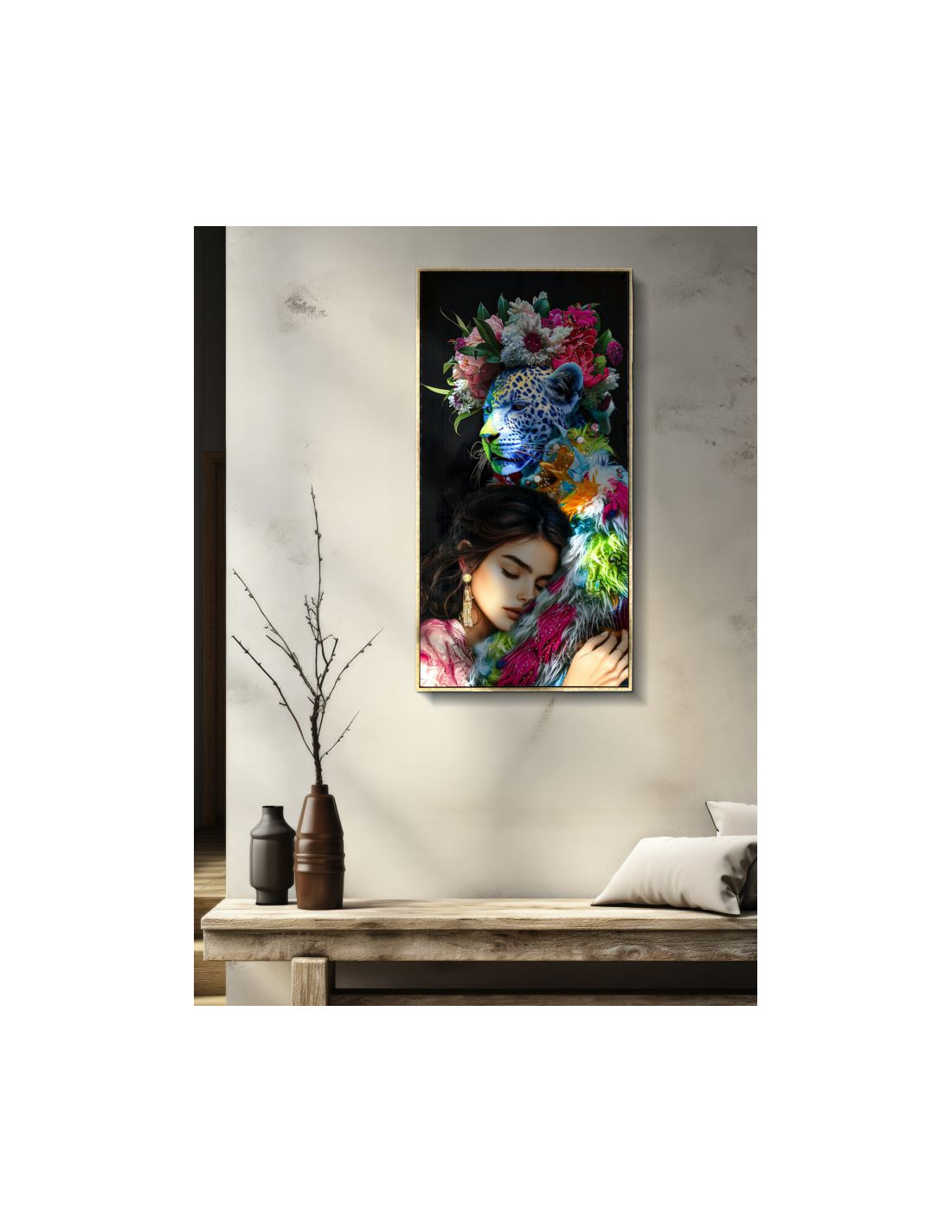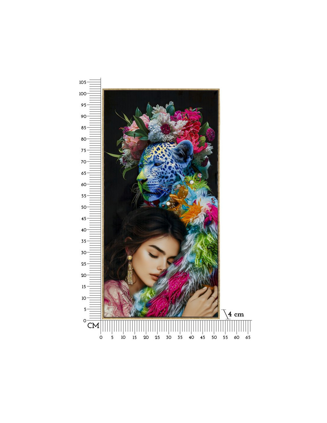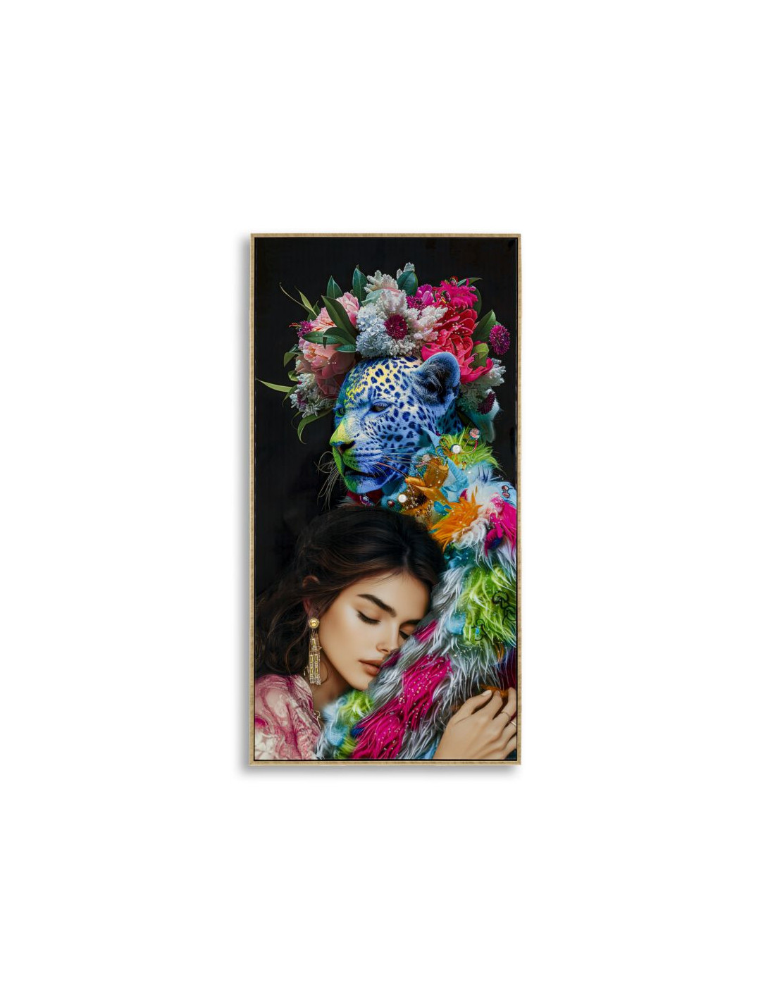 Grande Toile murale peinte Femme & Félin 52x102 avec cadre doré Moira